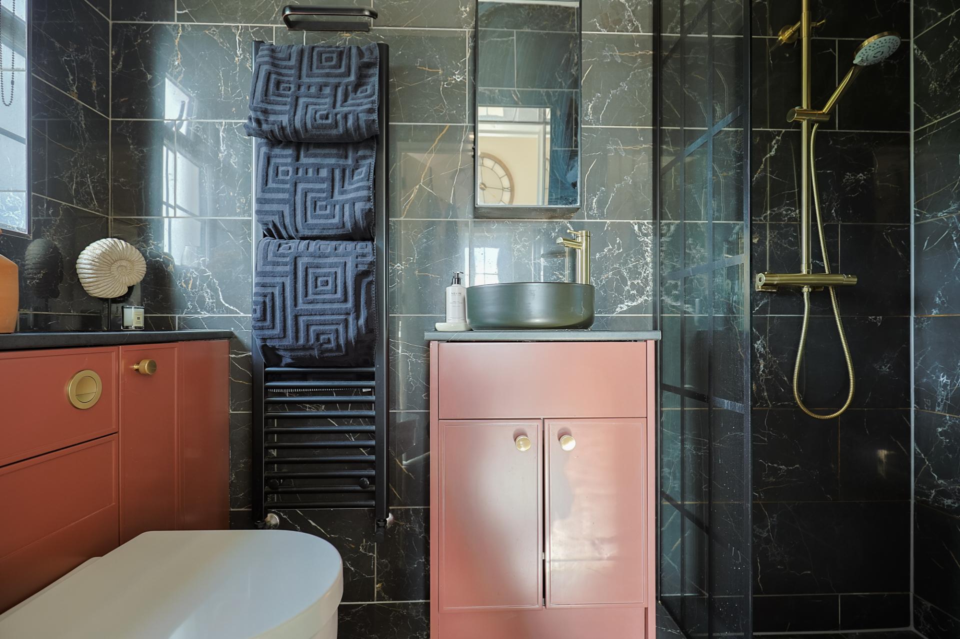 Furnished with a WC with storage on either side, a wash basin with storage underneath, a walk-in shower, a heated towel rail, spotlighting, an extractor fan, fully tiled, and a frosted window.
