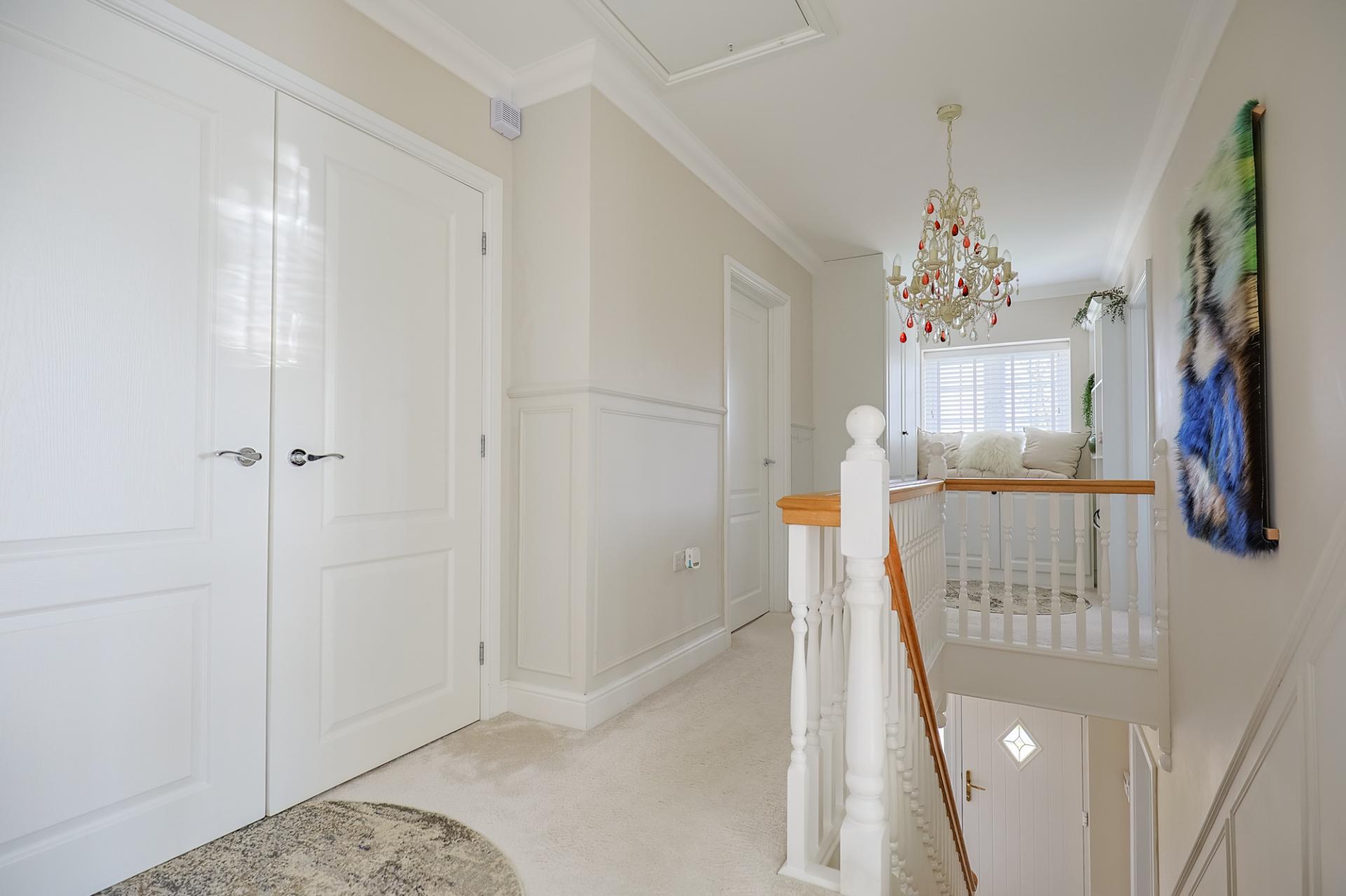 Ascend the oak stairway with panelled walls to the first-floor landing, which enjoys carpeting, coving, and a window to the front offering scenic rural views. From here, you have access to all four bedrooms, the family bathroom, and multiple storage cupboards with fitted shelving and hanging rails.