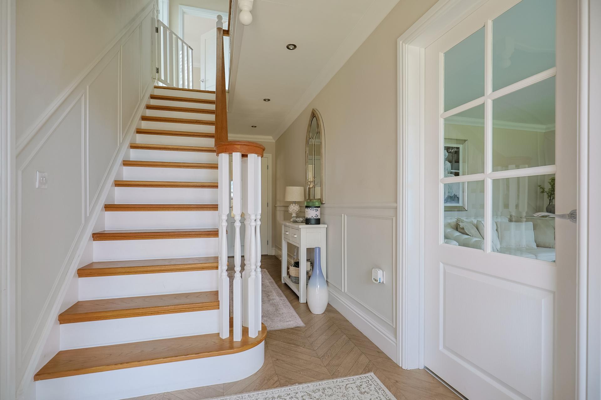 Instantly, what a welcoming home! The entrance is laid with elegant herringbone LVT flooring and is wonderfully light, thanks to the glass panel window next to the front door. The space is further enhanced by beautiful, panelled walls, spotlighting, and coving. From here, you have access to the open-plan kitchen/dining/living room, study, lounge, stairway to the first floor, and useful under-stairs storage. Located here is also the alarm system control panel.