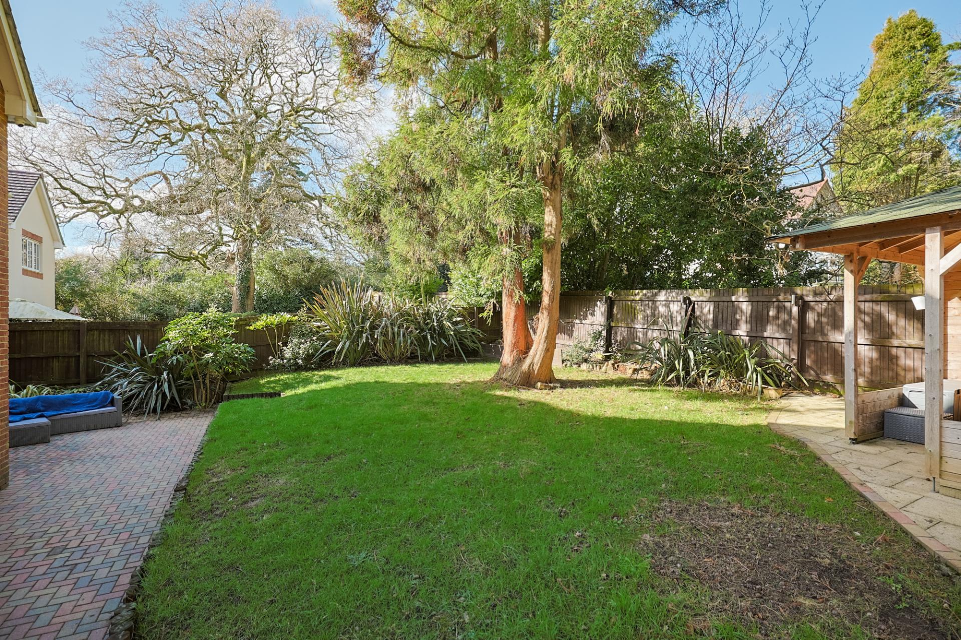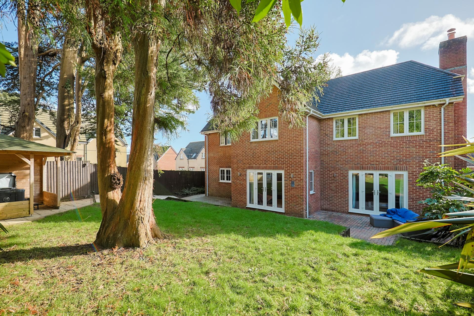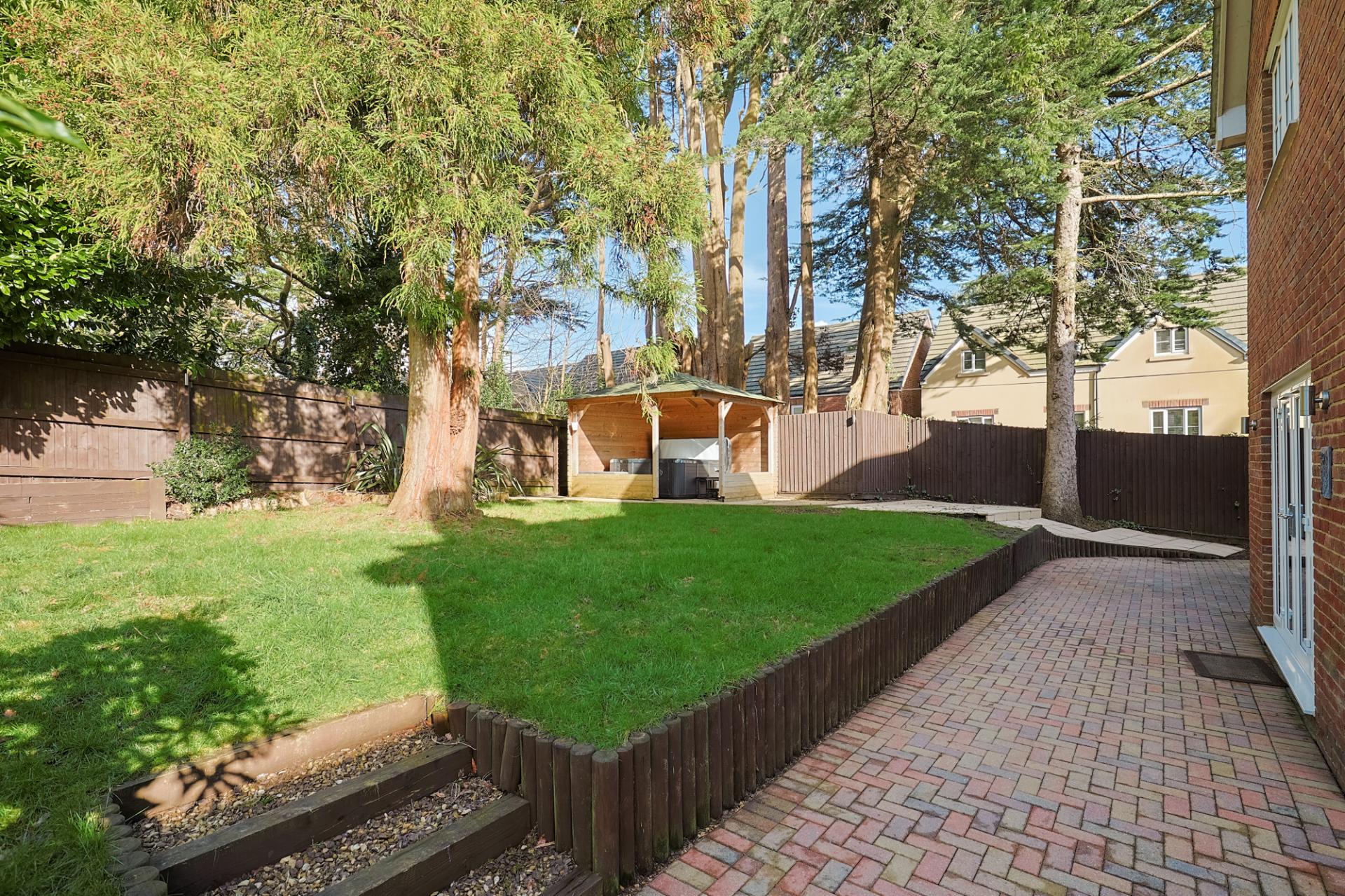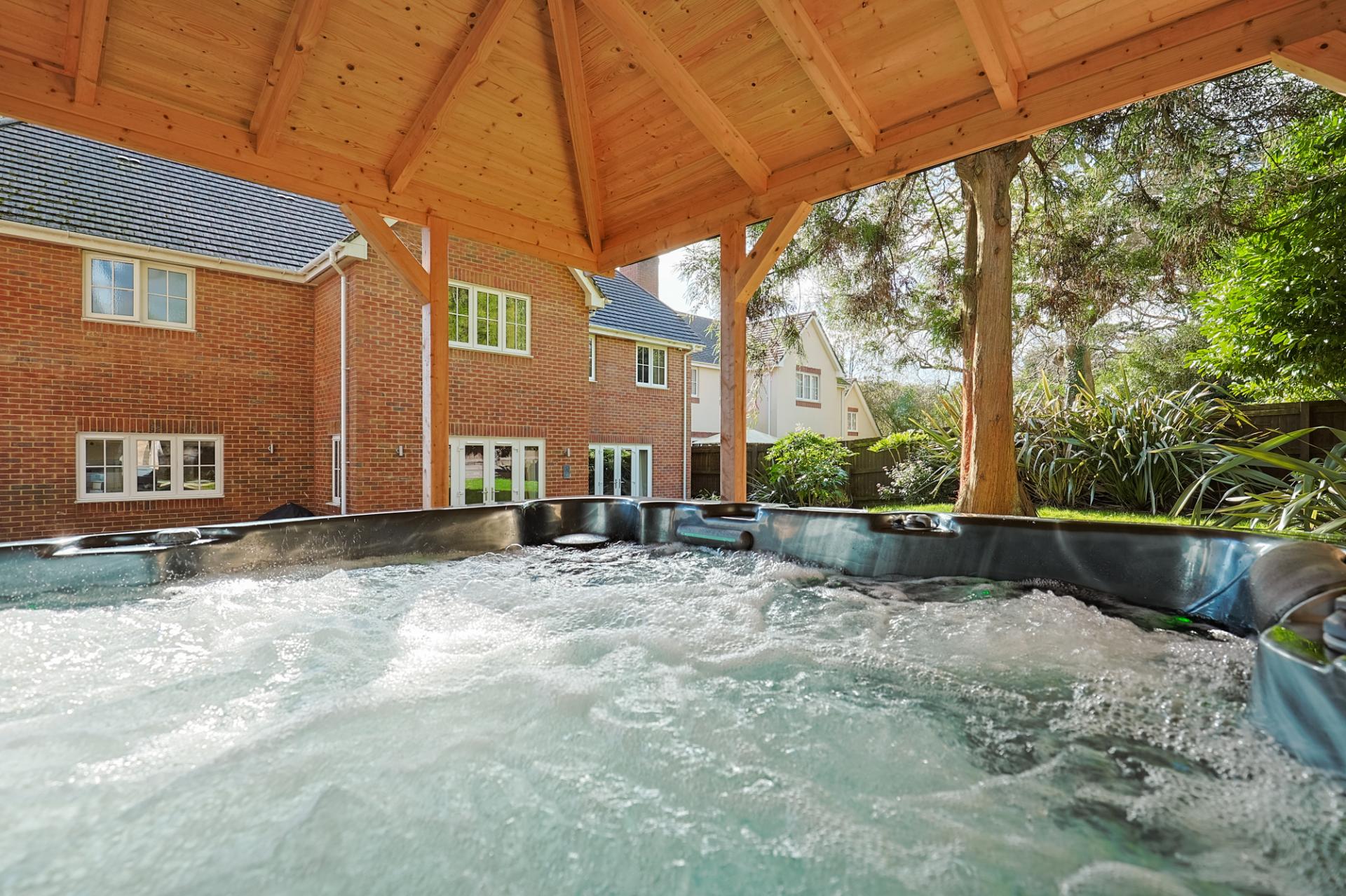 The rear garden features a beautifully maintained brick-paved patio area that wraps around the property. A pedestrian gate ensures a secure, family-friendly environment. Steps lead up from the patio to a level lawn, bordered by raised flower beds, with a stunning red cedar tree as a focal point. An undercover hot tub area boasts a luxury six-person smart hot tub with changeable colour lighting and Bluetooth connectivity.