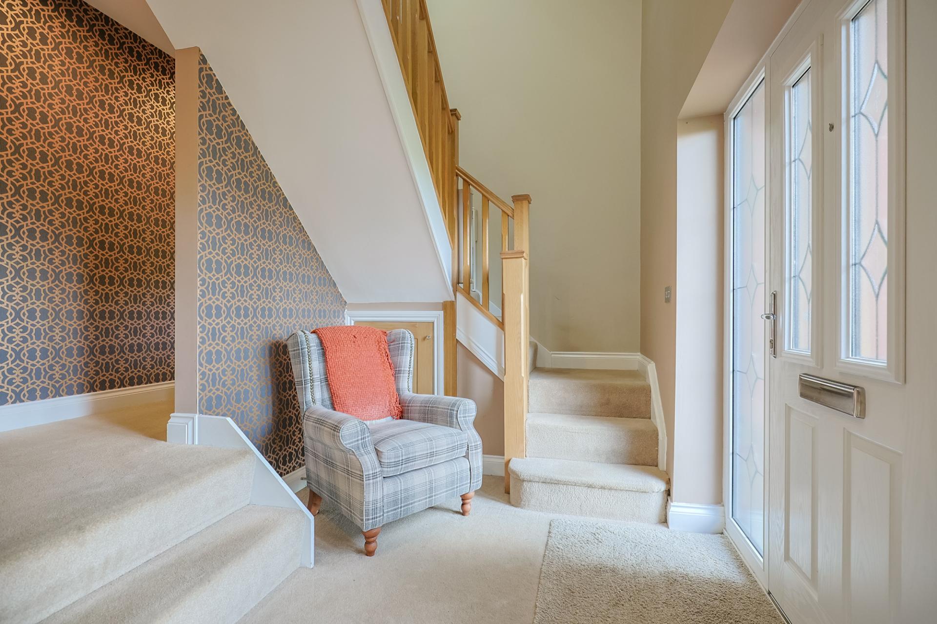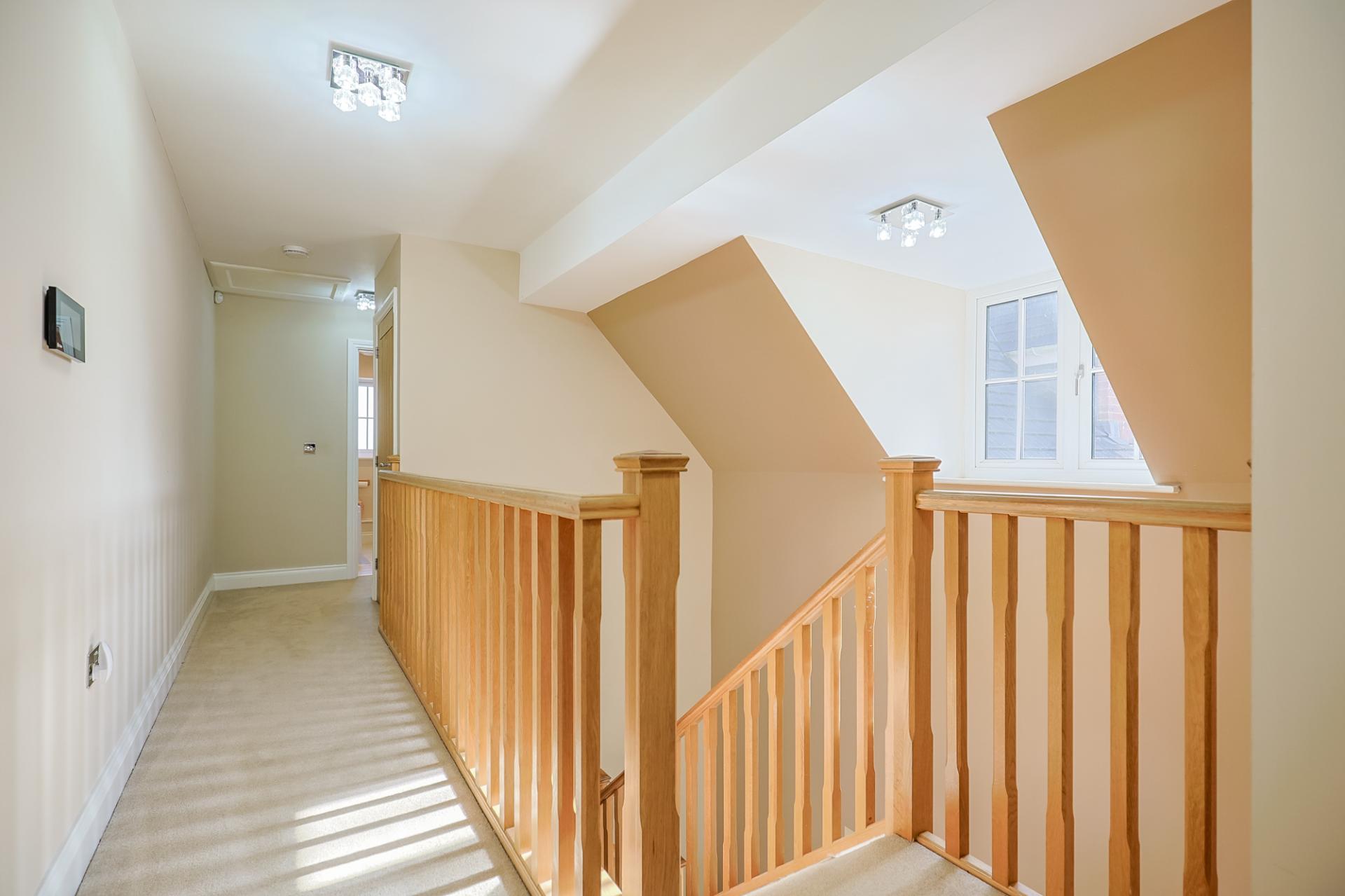 Ascending the carpeted staircase with an elegant oak balustrade, you arrive at a spacious, carpeted landing bathed in natural light from a front-facing window. This area provides access to all four bedrooms, the family bathroom, and an airing cupboard with fitted shelving. A control panel for the CDVI system is also located here.