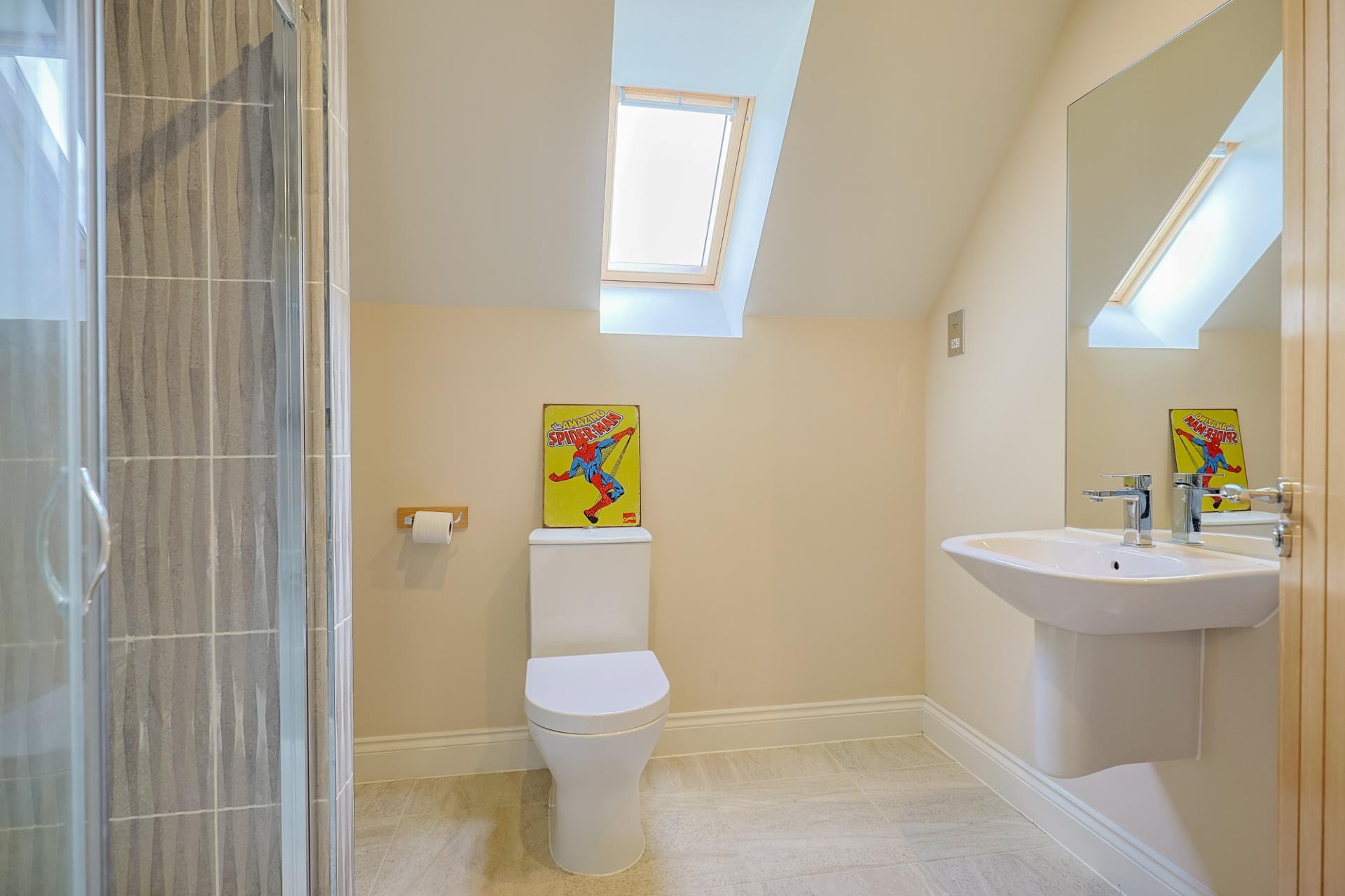 Located at the front of the home, bedroom two is a bright and spacious room with a large front-facing window and a Juliet balcony, allowing for plenty of natural light. This carpeted room also offers space for a dressing, seating, or study area. The en-suite includes a Roca WC, a Roca wash basin, a walk-in rainfall shower, a heated towel rail, spotlighting, an extractor fan, part-tiled walls, tiled flooring, and a Velux window.