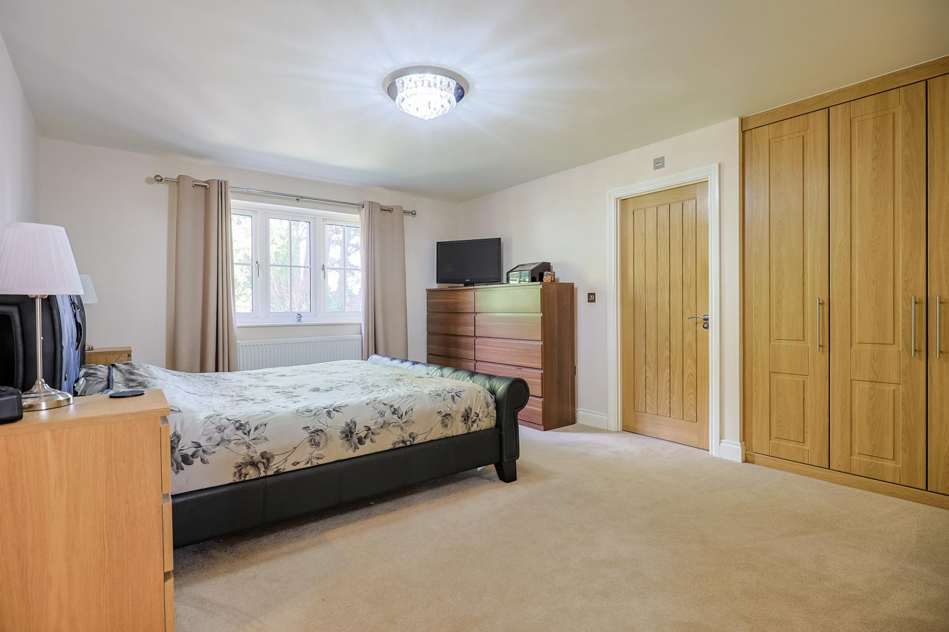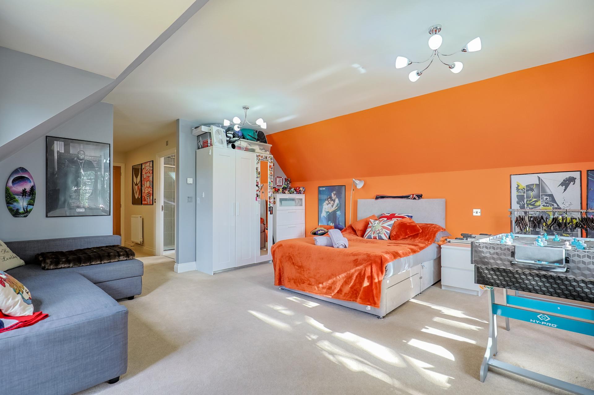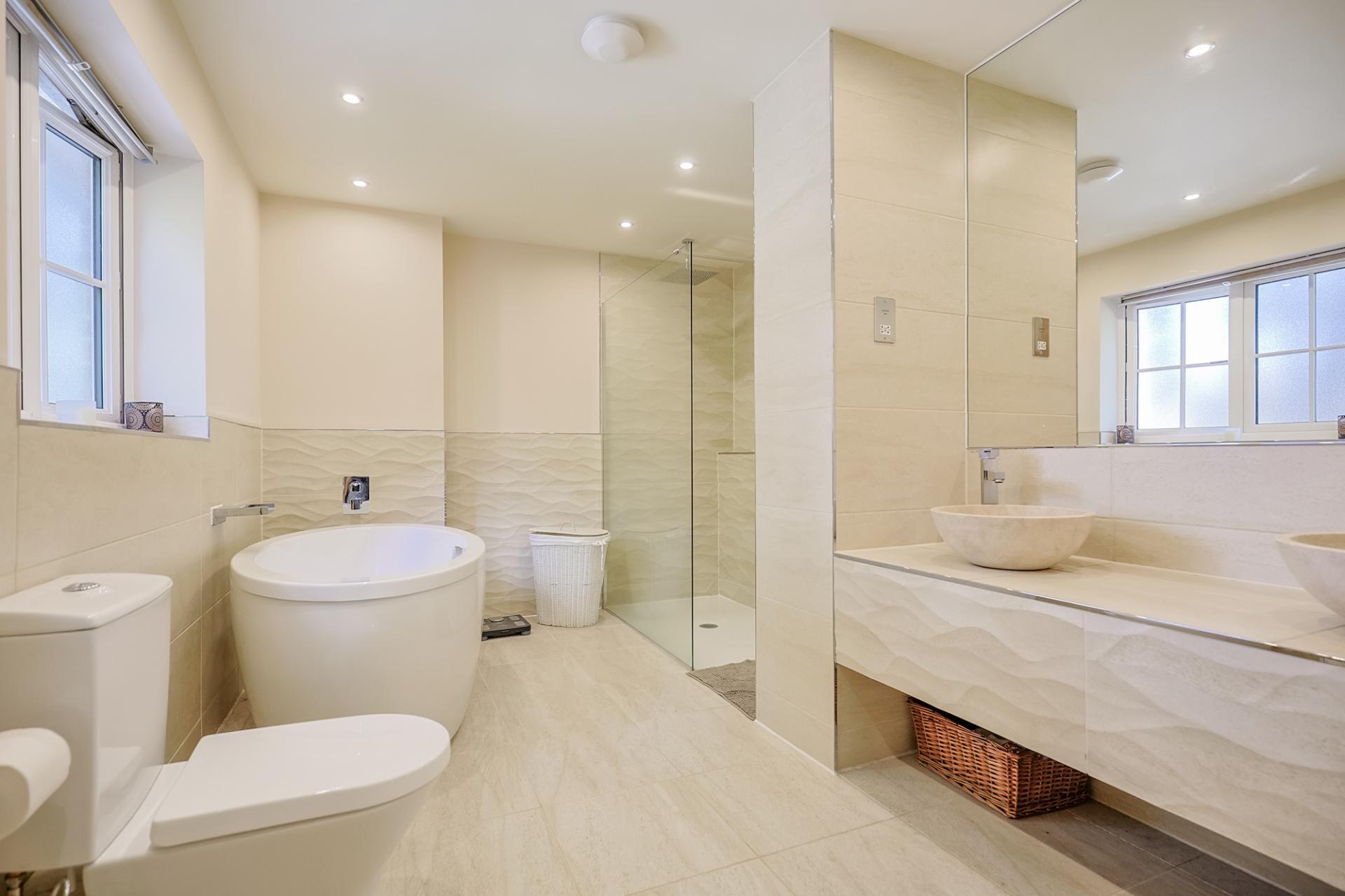 The principal bedroom is a spacious and luxurious sanctuary, featuring carpeting and a large rear-facing window. The room benefits from bespoke fitted wardrobes with hanging rails and shelving, as well as a separate walk-in dressing area with additional bespoke wardrobes. The en-suite is a lavish space, complete with a Roca WC, feature twin wash basins, a large walk-in rainfall shower, a feature bath with a waterfall tap, a heated towel rail, two shaving points, tiled flooring, part-tiled walls, spotlighting, an extractor fan, and a frosted window.