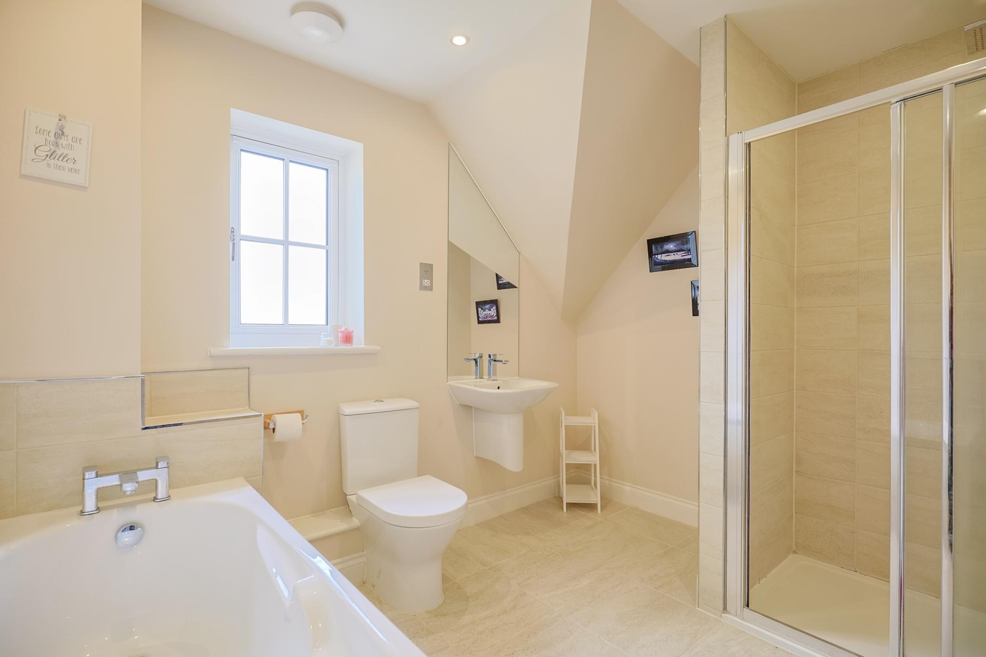 The well-appointed family bathroom includes a Roca WC, a Roca wash basin, a walk-in rainfall shower, a fitted bath, a heated towel rail, an extractor fan, spotlighting, tiled flooring, part-tiled walls, and a frosted window to the side.