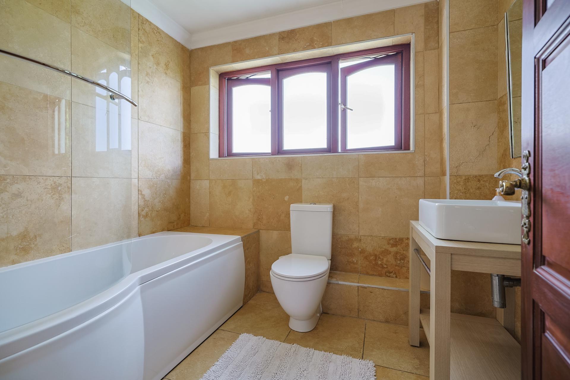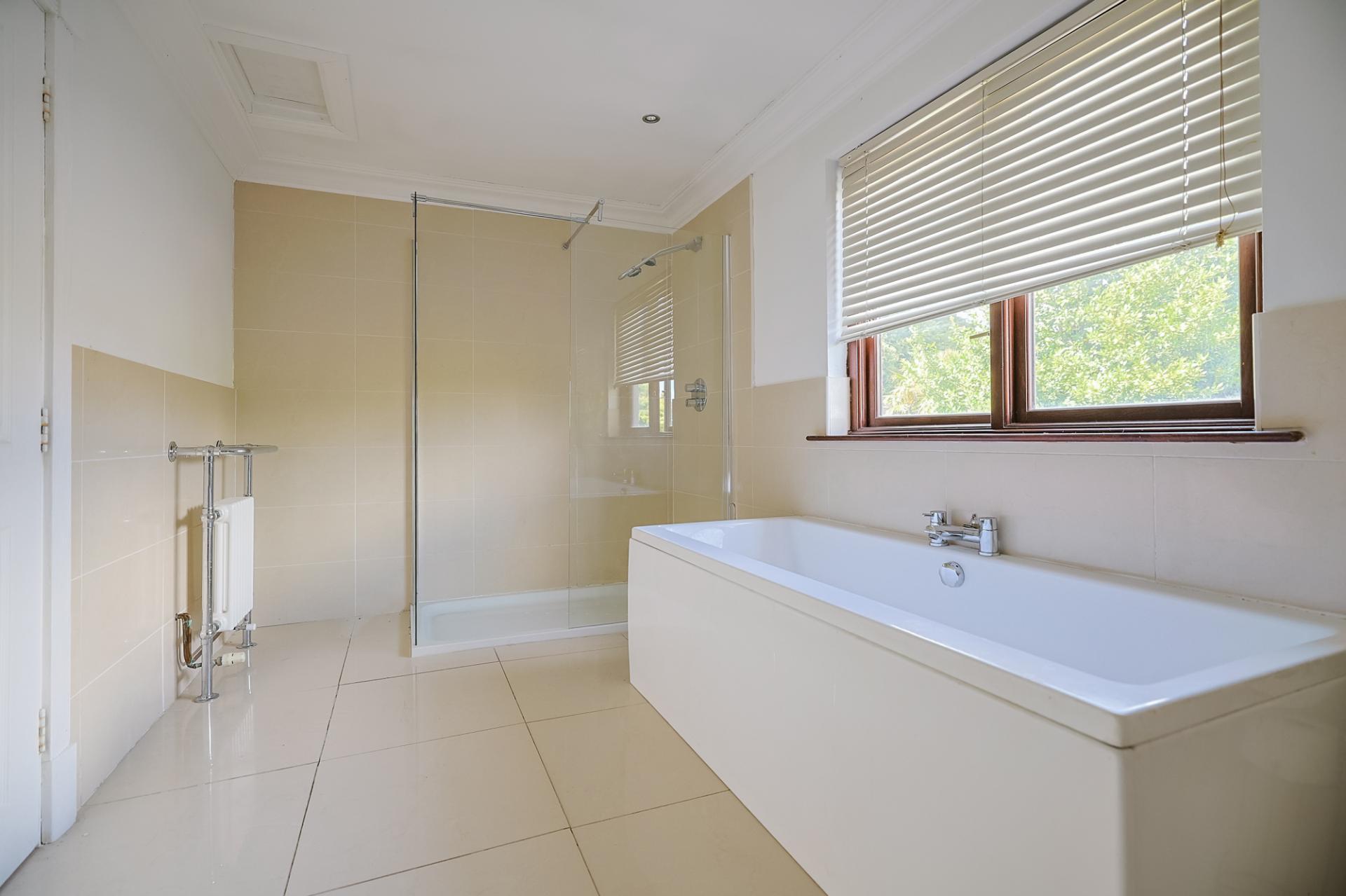 The family bathroom offers a WC, wash basin, fitted bath with a shower over, tiled flooring and walls, spotlighting, feature heated towel rail, and two shaving points.