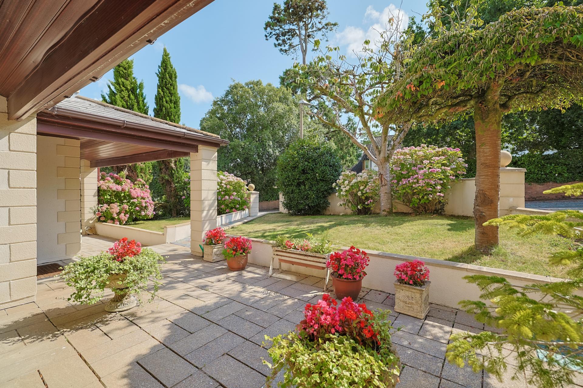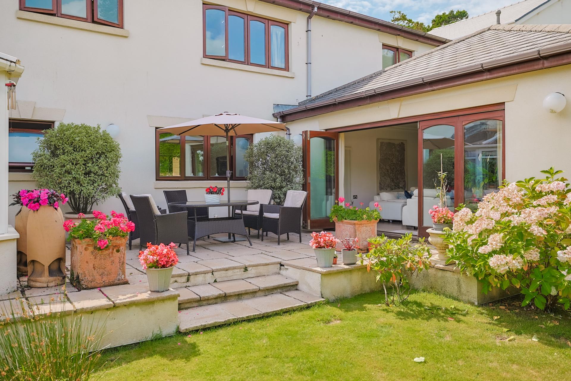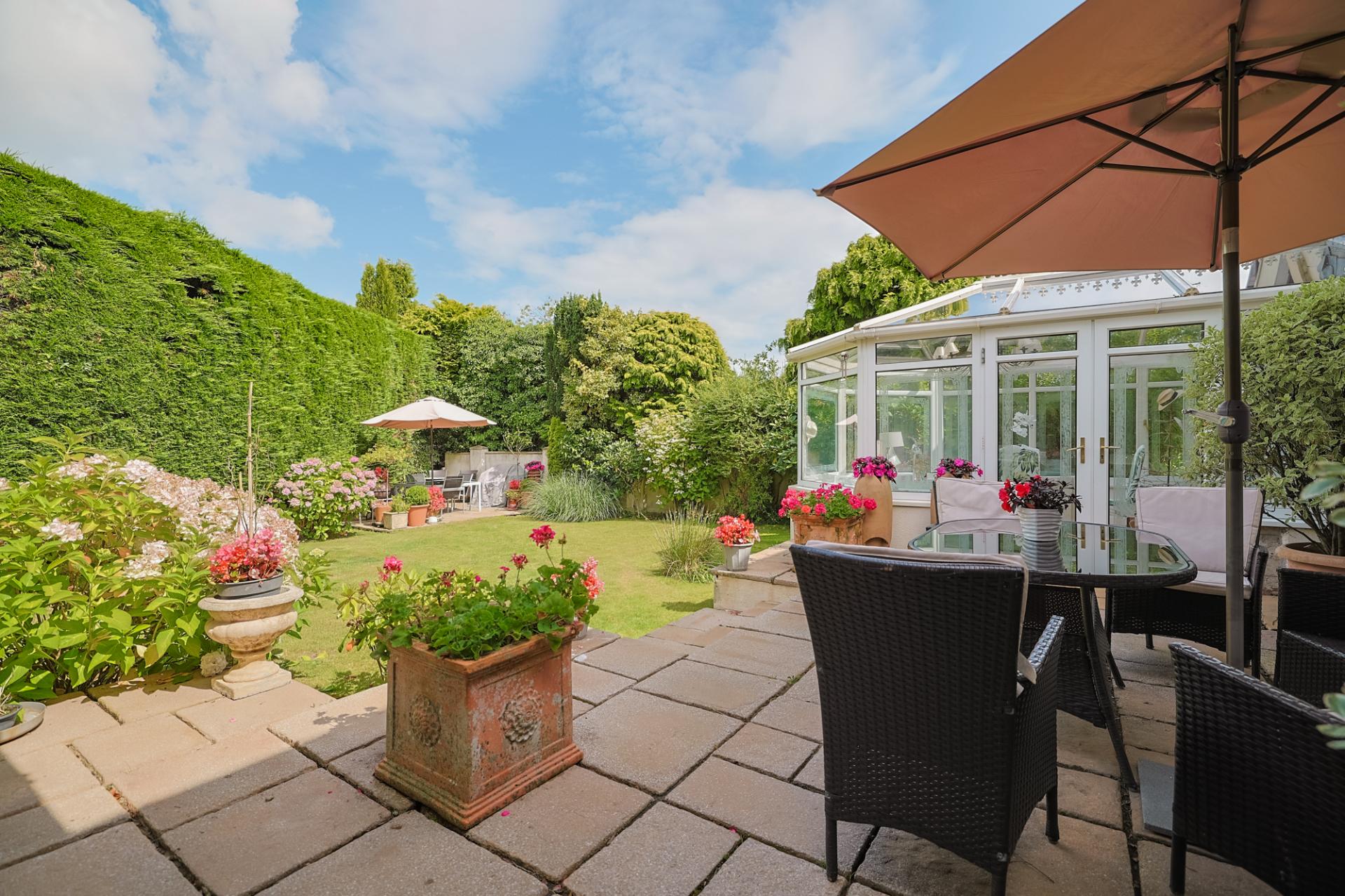 The enclosed rear garden is a truly welcoming outdoor space, thoughtfully laid out over two tiers and designed for both relaxation and entertaining. A lovely mix of patio and level lawns are bordered by mature trees and shrubs, providing colour and privacy. Two distinct patio areas offer perfect settings for outdoor dining, barbecues, or quiet evenings with loved ones. There’s also gated access to the front of the property, where you’ll find more level lawns and mature planting on either side of the paved pathway to the front door.