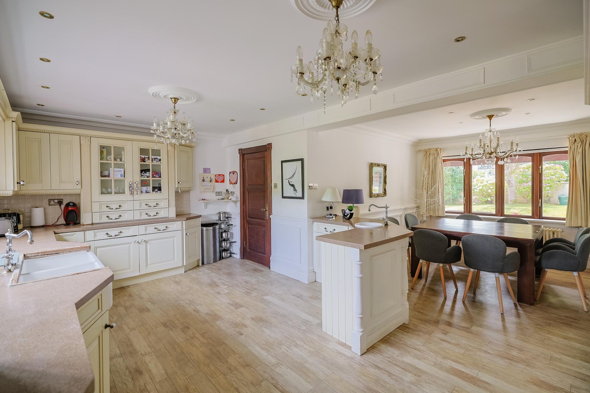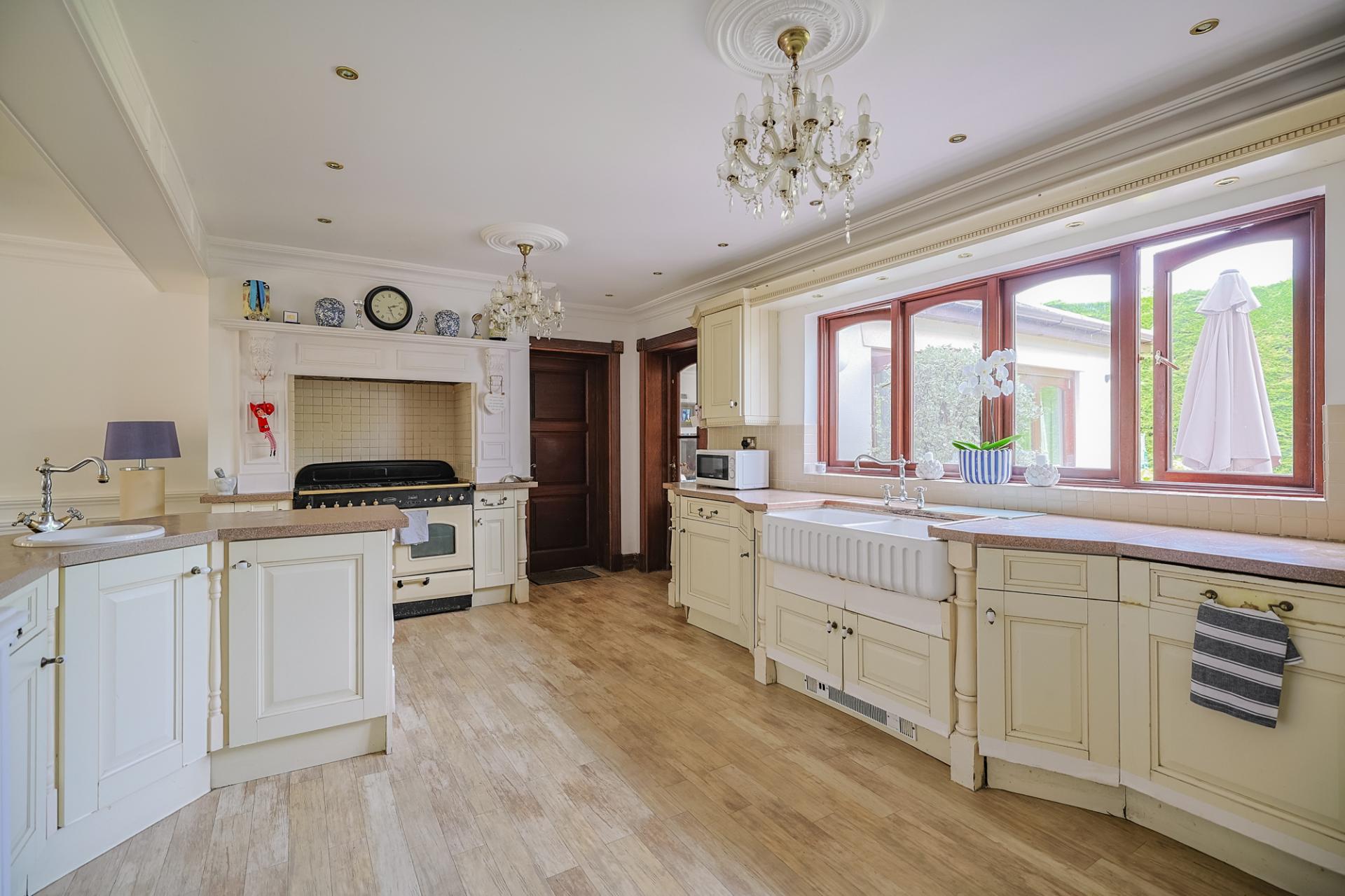 At the heart of the home lies the kitchen/breakfast room – a generous, well-appointed space designed for family living. Here you have dual-aspect windows, vinyl flooring, spot and centre lighting, panelled walls, feature coving, and three decorative ceiling roses. The kitchen features an extensive range of wall and base units, a double porcelain sink, an additional circular Villeroy & Boch sink, BOSCH dishwasher, double oven Rangemaster with a 5-ring gas hob, a hot plate, and an extractor fan. With ample room for a breakfast table and the potential to add a small island, this space flows naturally to the lounge and utility room.