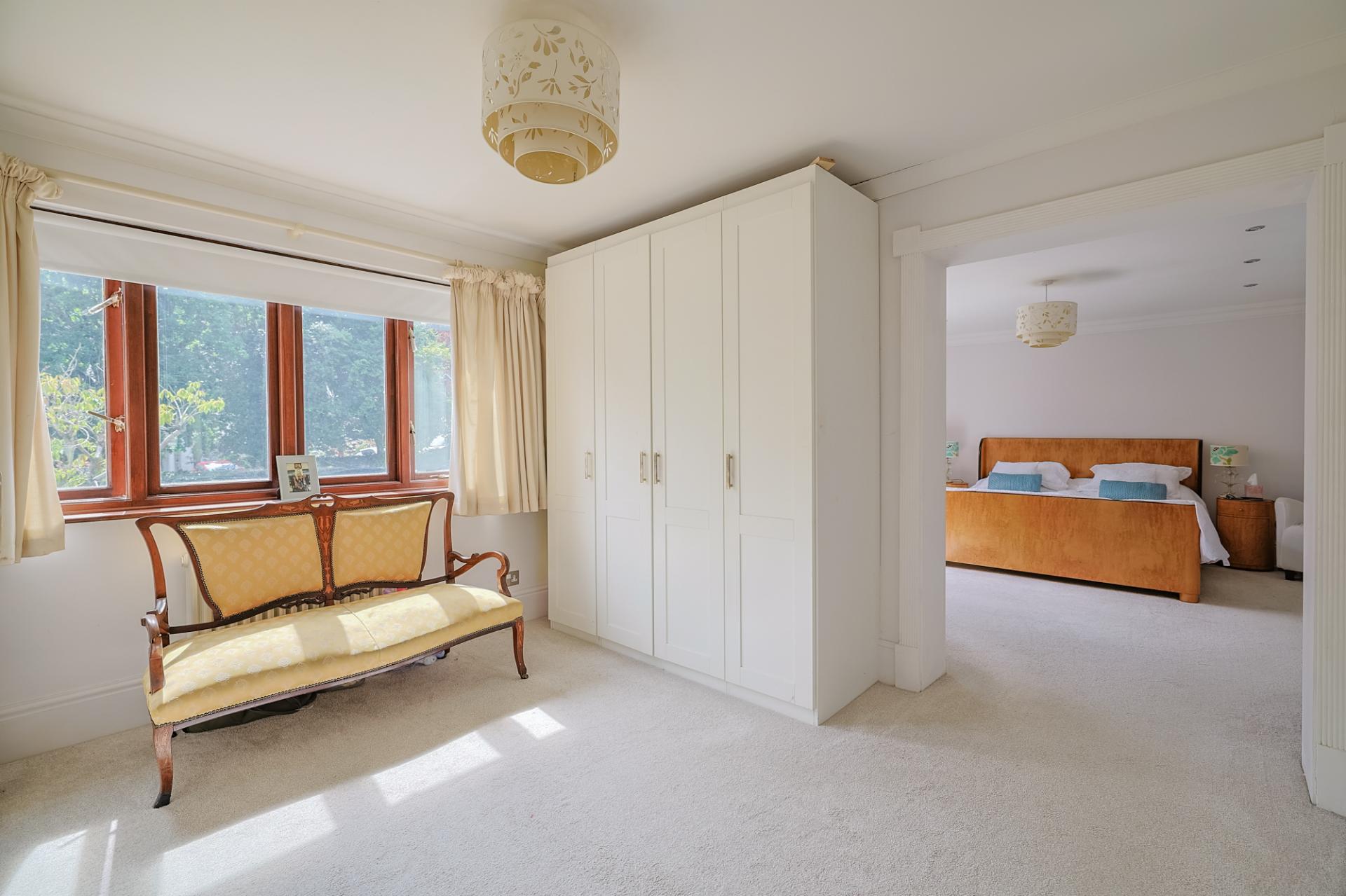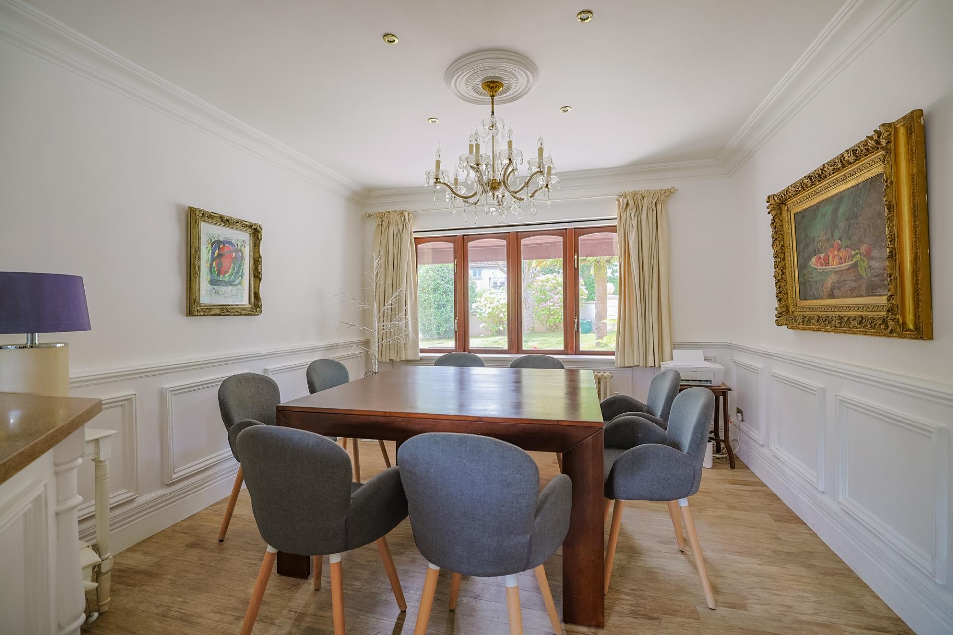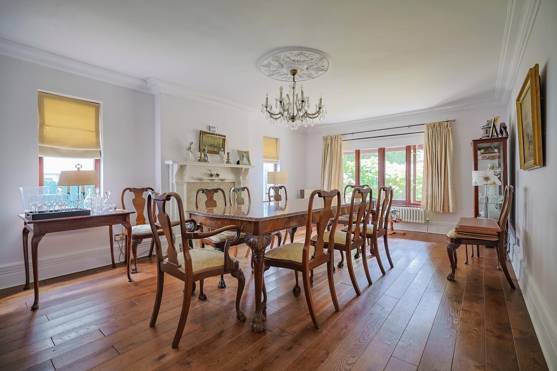 The formal dining room is an impressive and spacious area, ideal for entertaining. With wooden flooring underfoot, coving, a decorative ceiling rose, and dual-aspect windows, there’s ample space for a large dining table to host friends and family.