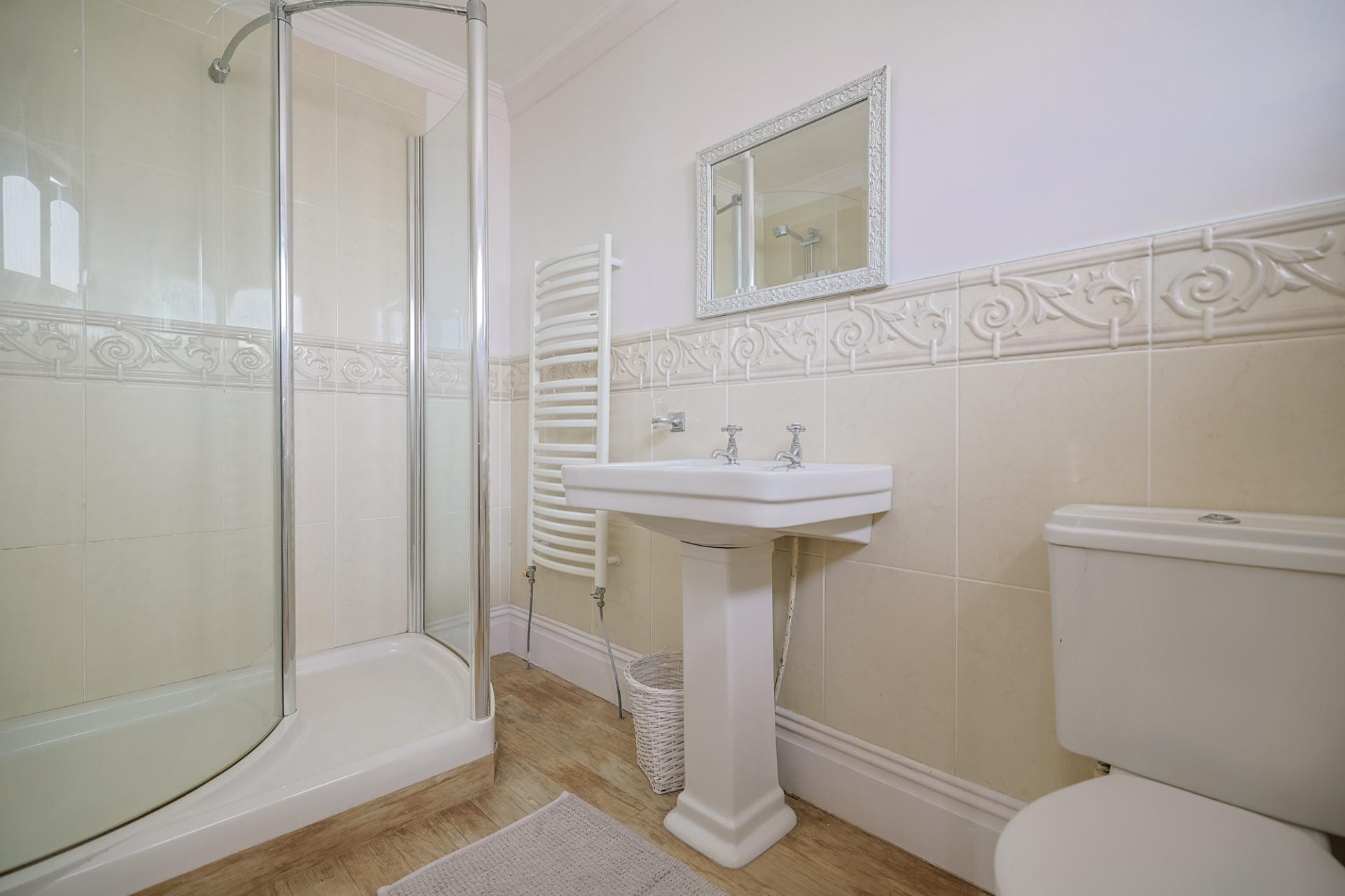 Bedroom two is another beautifully proportioned double, complete with a large front-facing window allowing natural light to fill the space. With carpeted flooring, coving, a feature ceiling rose, a walk-in wardrobe with fitted shelving and rails. The private en-suite includes a WC, wash basin, walk-in shower, heated towel rail, vinyl flooring, partially tiled walls, two shaving points, spotlighting, and a frosted rear window.