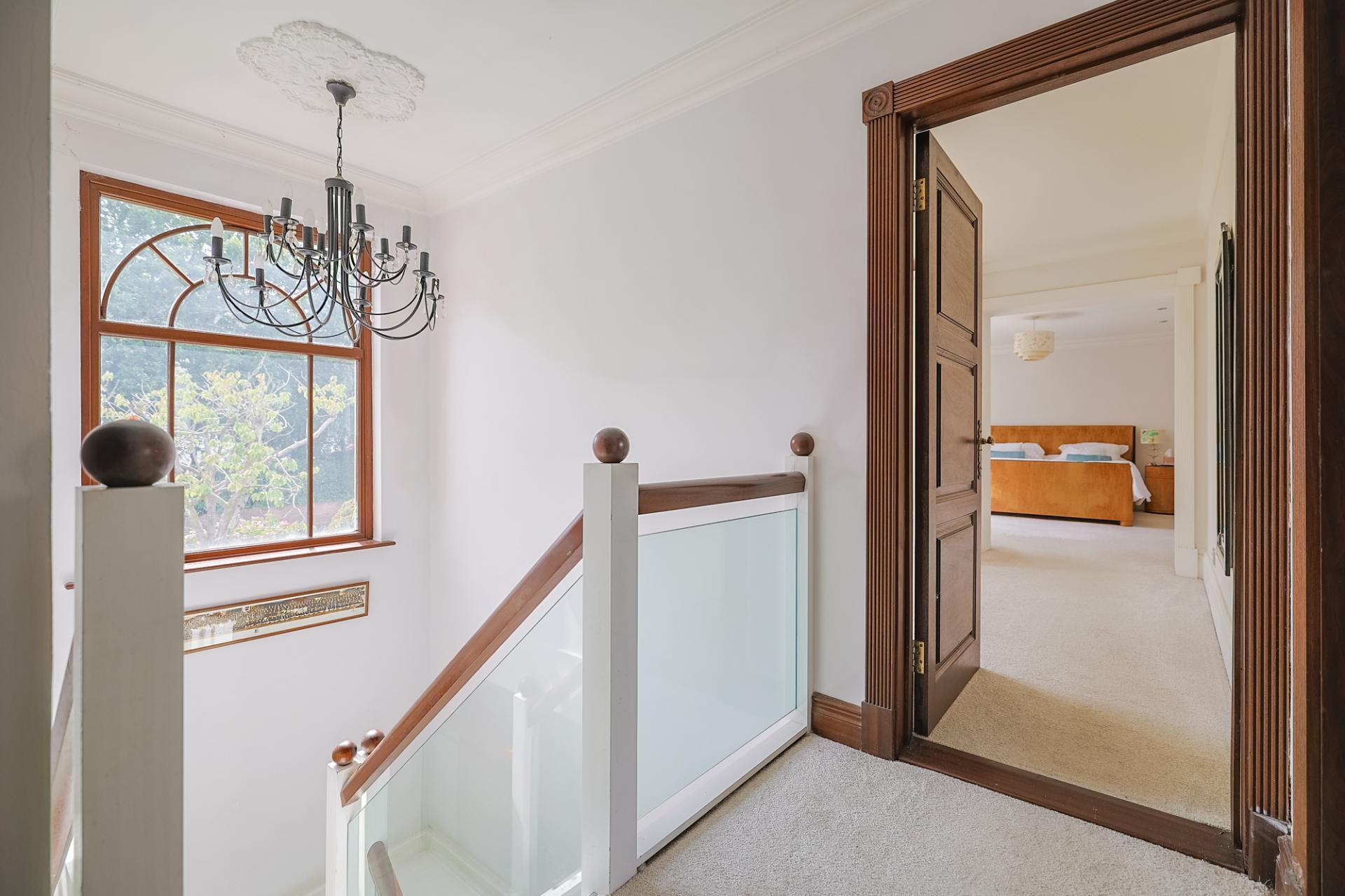 Let us now journey back to the hallway and ascend the U-shaped staircase with a glass balustrade. A large front-facing window bathes the stairwell in natural light, while the carpeted landing features a chandelier and ceiling rose, and provides access to four bedrooms, the family bathroom, and a generous airing cupboard.