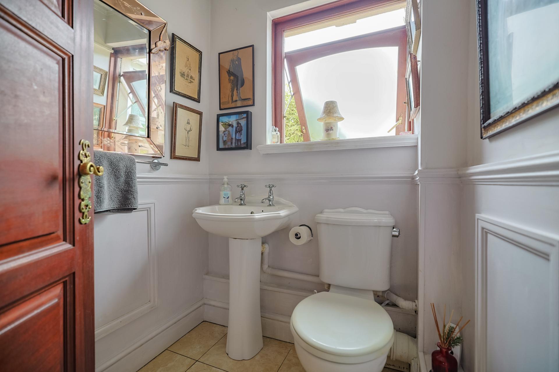 The ground floor WC is finished with tiled flooring, panelled walls, spotlighting, a frosted rear window, WC, and wash basin.