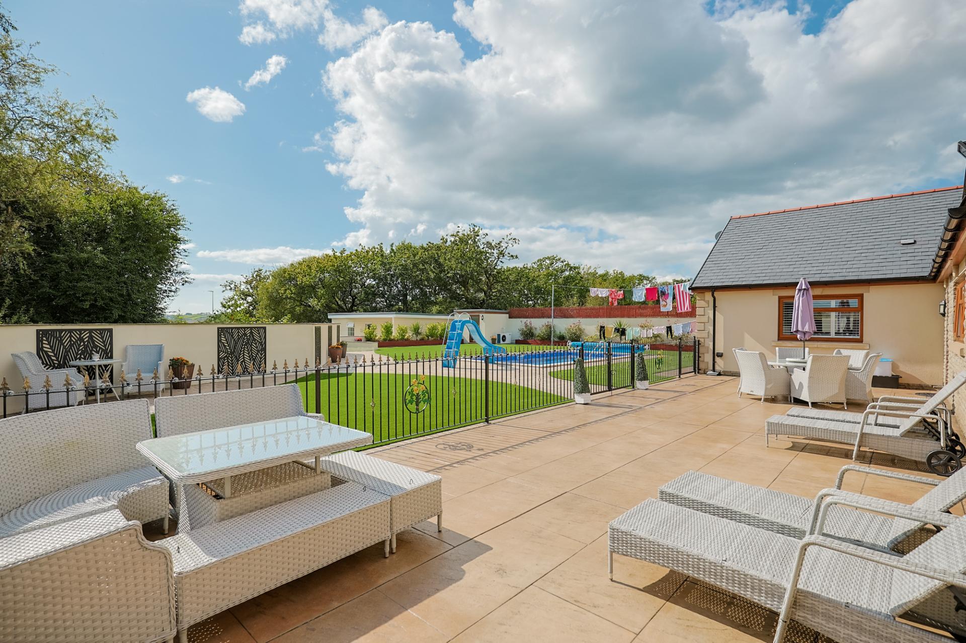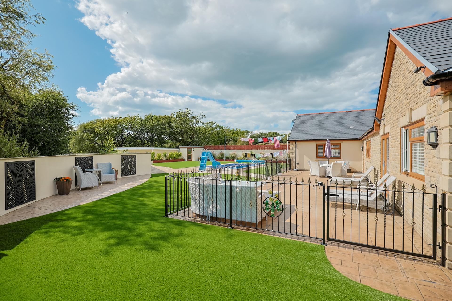 The outside space has been beautifully designed with a low-maintenance garden featuring a mix of artificial grass and paved patio areas, all surrounding a family-heated swimming pool. The garden is thoughtfully divided into different sections, enclosed by iron railings and pedestrian gates, ensuring a safe and child-friendly environment. Pathways lead you around the entire property, and from the private grounds, you can enjoy lovely countryside views in the distance.