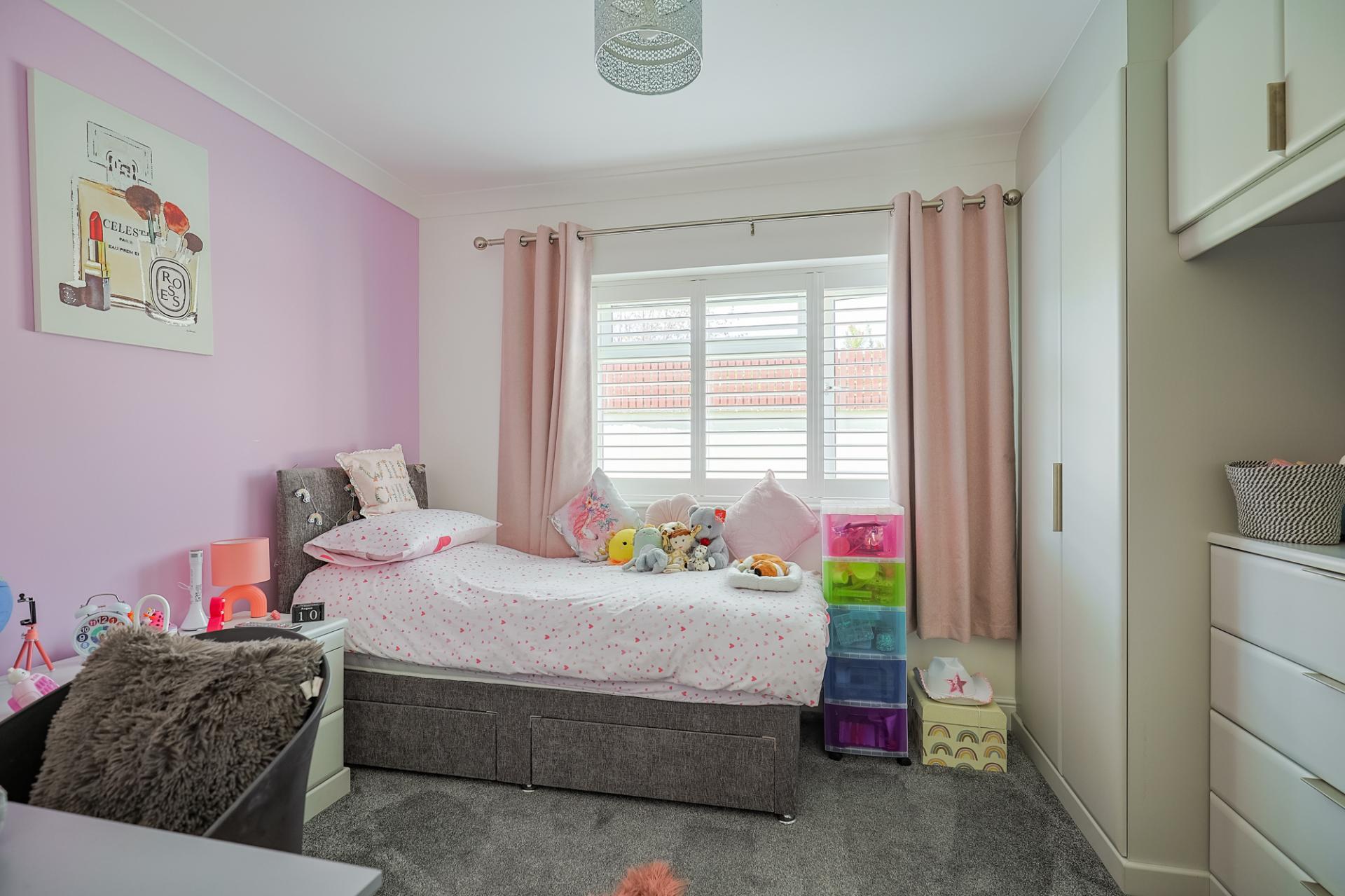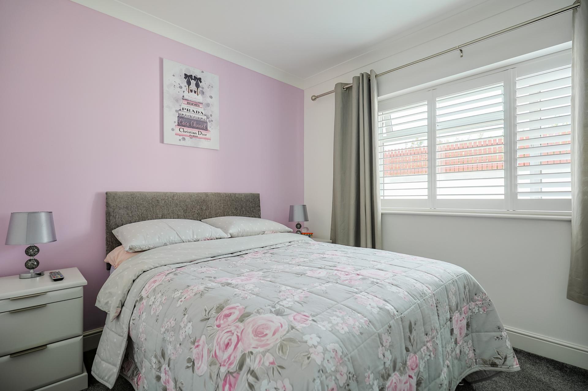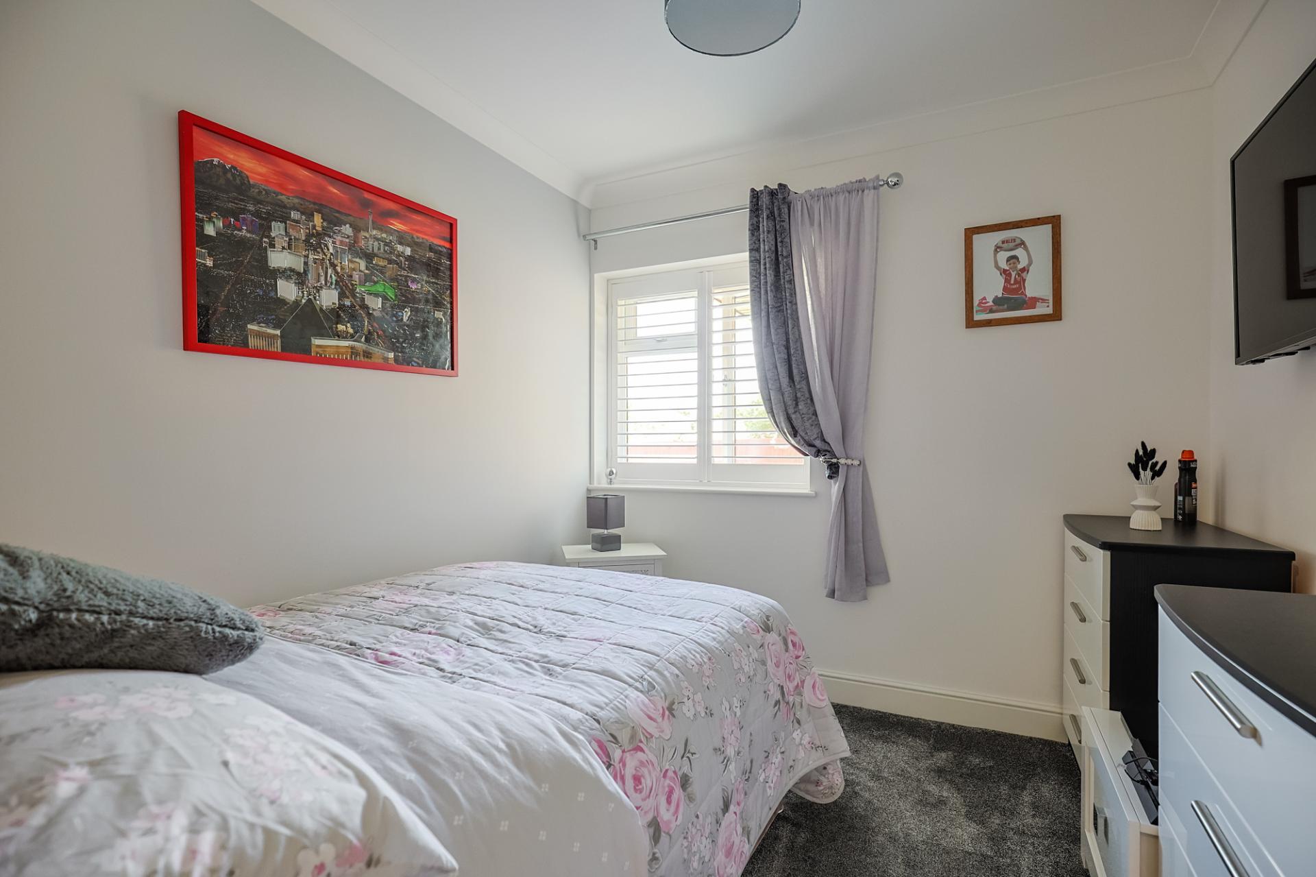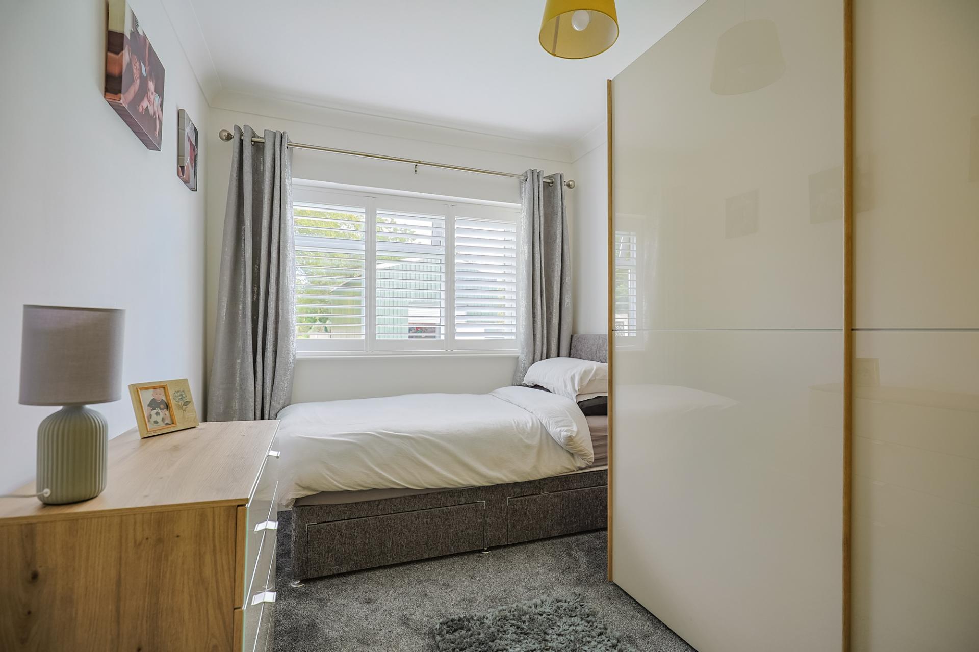 Bedroom three is another bright, double-sized bedroom with a window to the side, fitted with shutters. It features carpeted flooring and built-in wardrobes with hanging rails, shelving, drawers, and storage cupboards for added convenience.