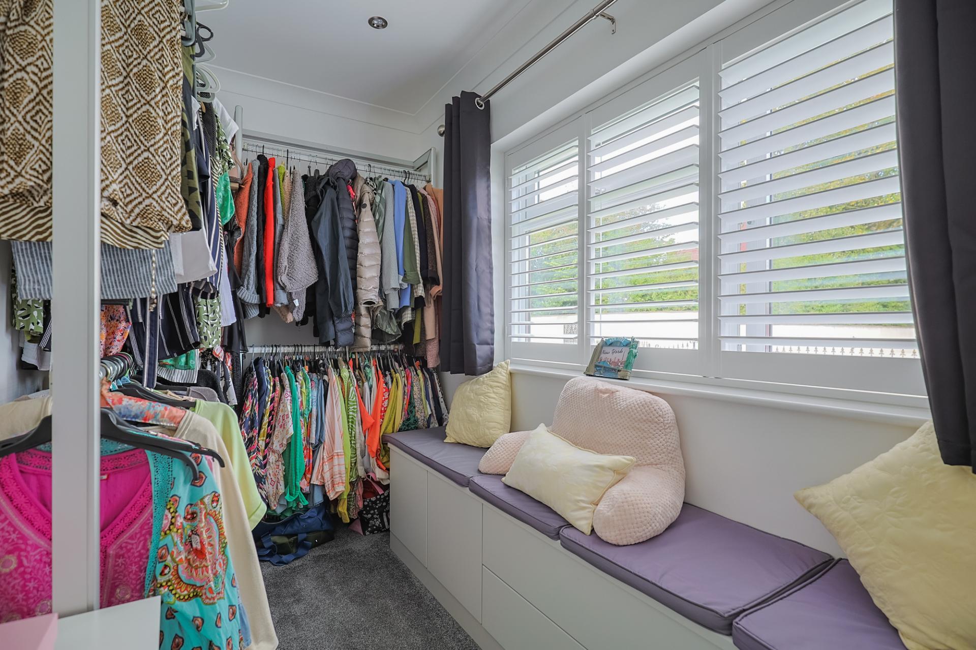 This spacious and bright bedroom features dual aspect windows and is fully carpeted. It boasts a private ensuite and a dressing room. The ensuite includes a WC, wash basin with vanity, fitted bath, spotlighting, an extractor fan, tiled flooring, tiled walls, and a window to the side with shutters. The dressing room features a window to the front with shutters, spotlighting, carpeting, and built-in storage cupboards and drawers with seating.