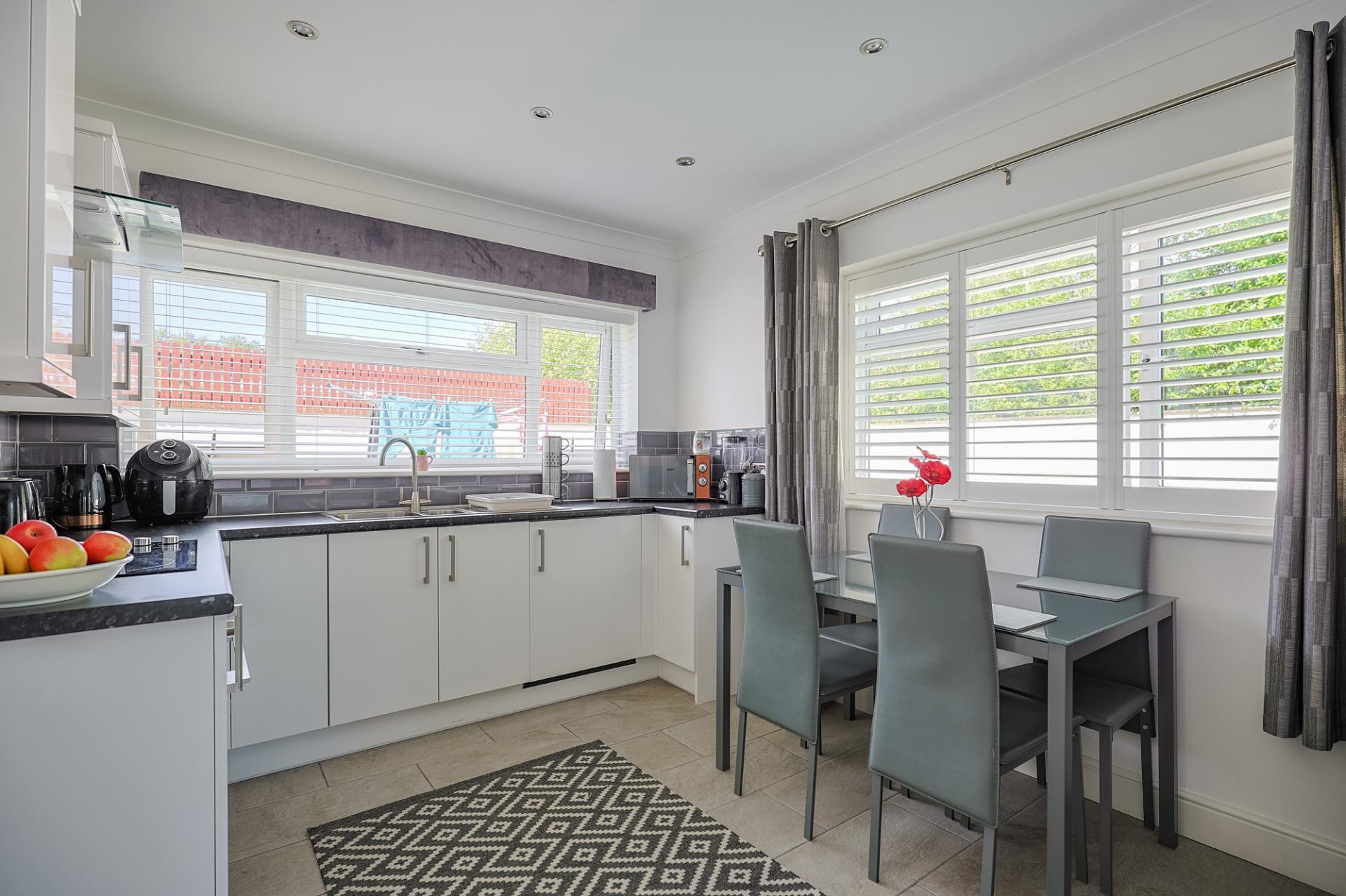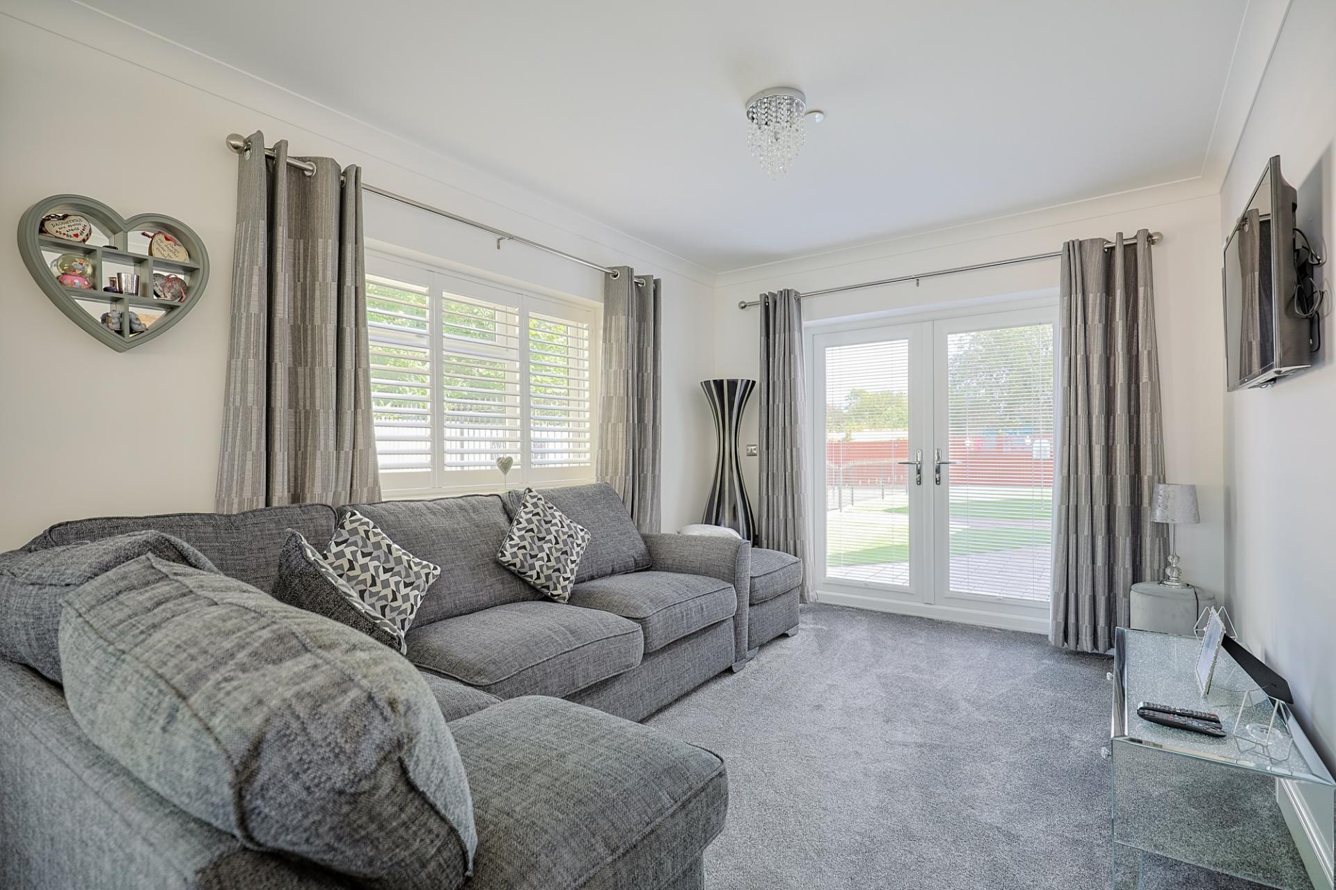 A second bright and airy space featuring triple aspect windows, including double doors that open to the front patio area. The kitchen/lounge is finished with a combination of part-tiled and part-carpeted flooring, lit by spotlighting. The kitchen area includes wall and base units, a Caple oven/grill, 4-ring electric hob, extractor fan, and double stainless-steel sink with drainage. There is also space for a breakfast table and a comfortable lounge area. From here, you have access to a utility room.