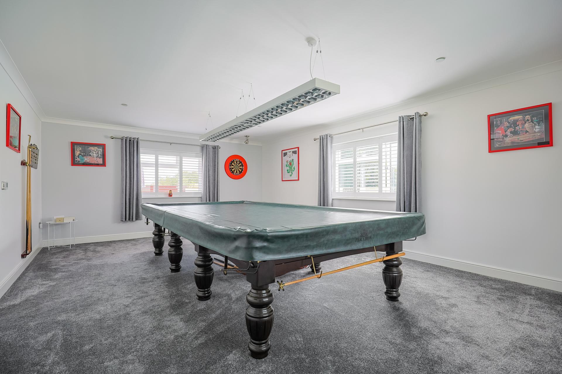 Currently utilised as a games room, this super bright and versatile space boasts triple aspect windows with shutters and offers beautiful views of the garden and the distant countryside.