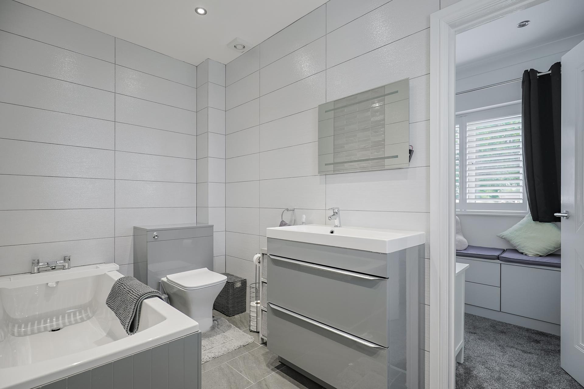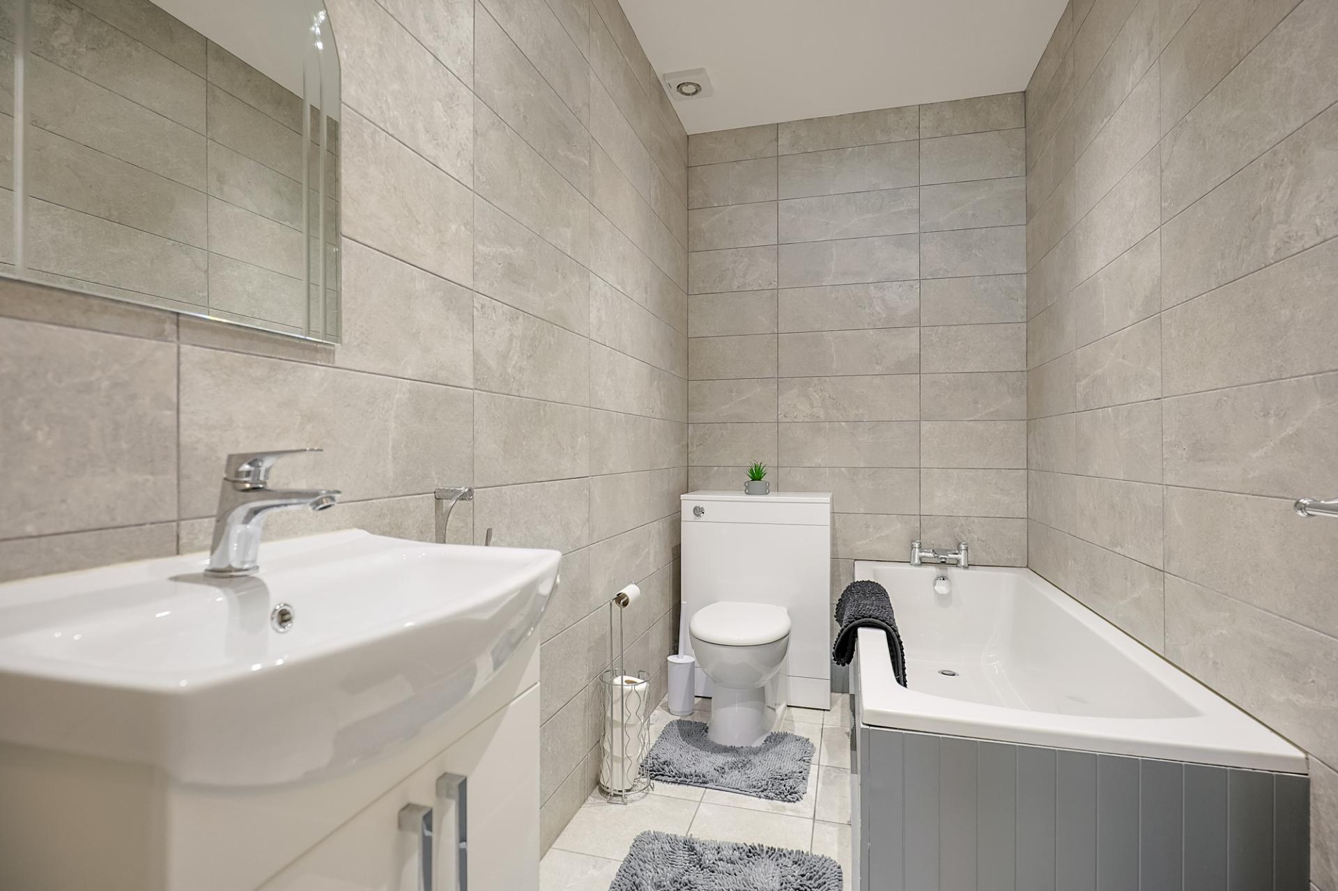 This family bathroom includes a WC, wash basin with vanity, fitted bath, spotlighting, an extractor fan, tiled flooring, and tiled walls.
