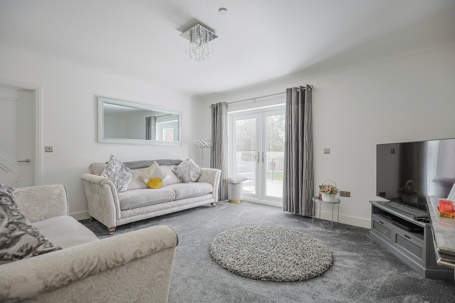 A bright, carpeted lounge, filled with natural light streaming in from the double patio doors with fitted blinds, provides direct access to the rear patio, fostering a seamless connection with the outdoors. From here, you also have access to bedroom one.