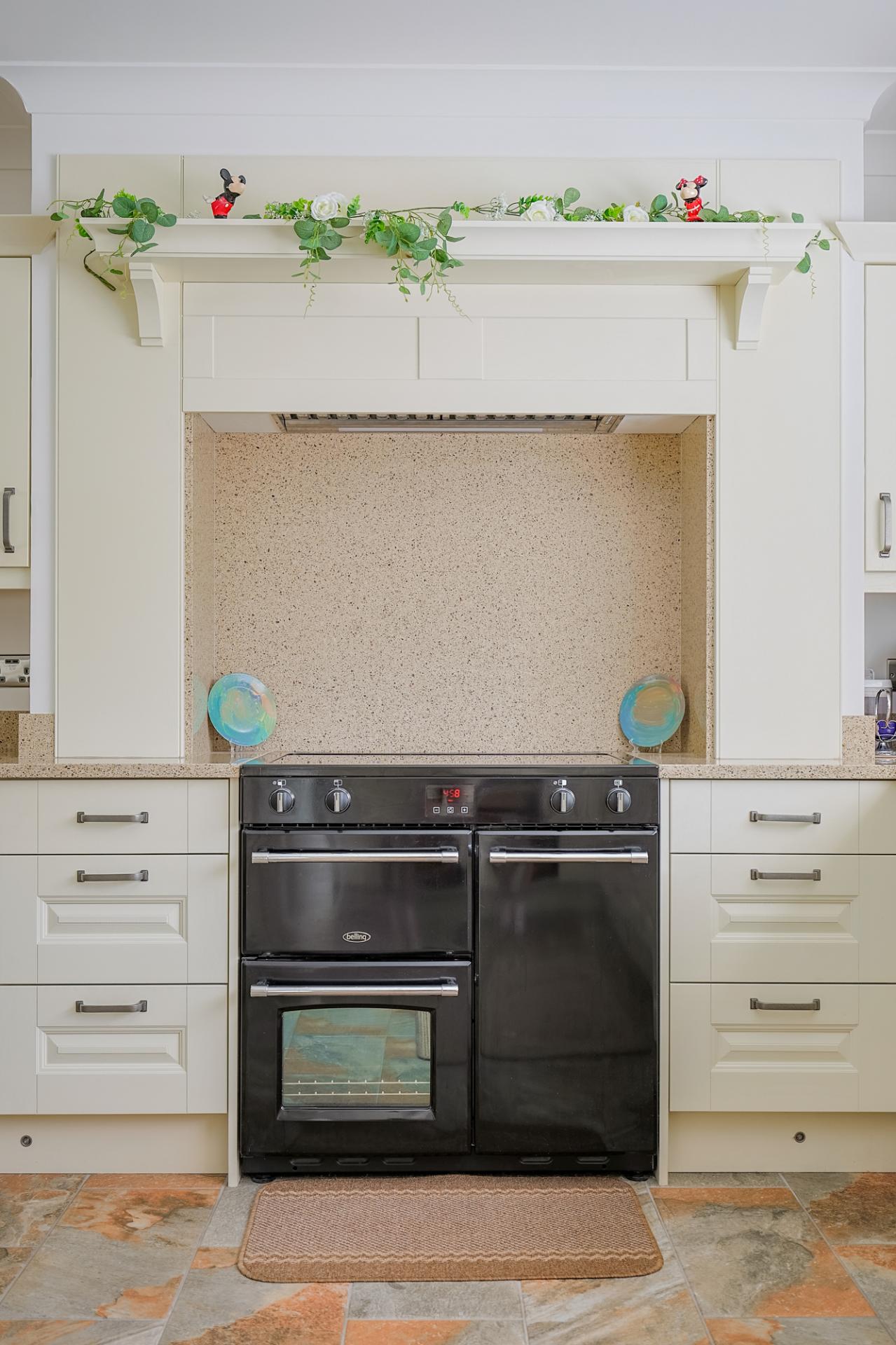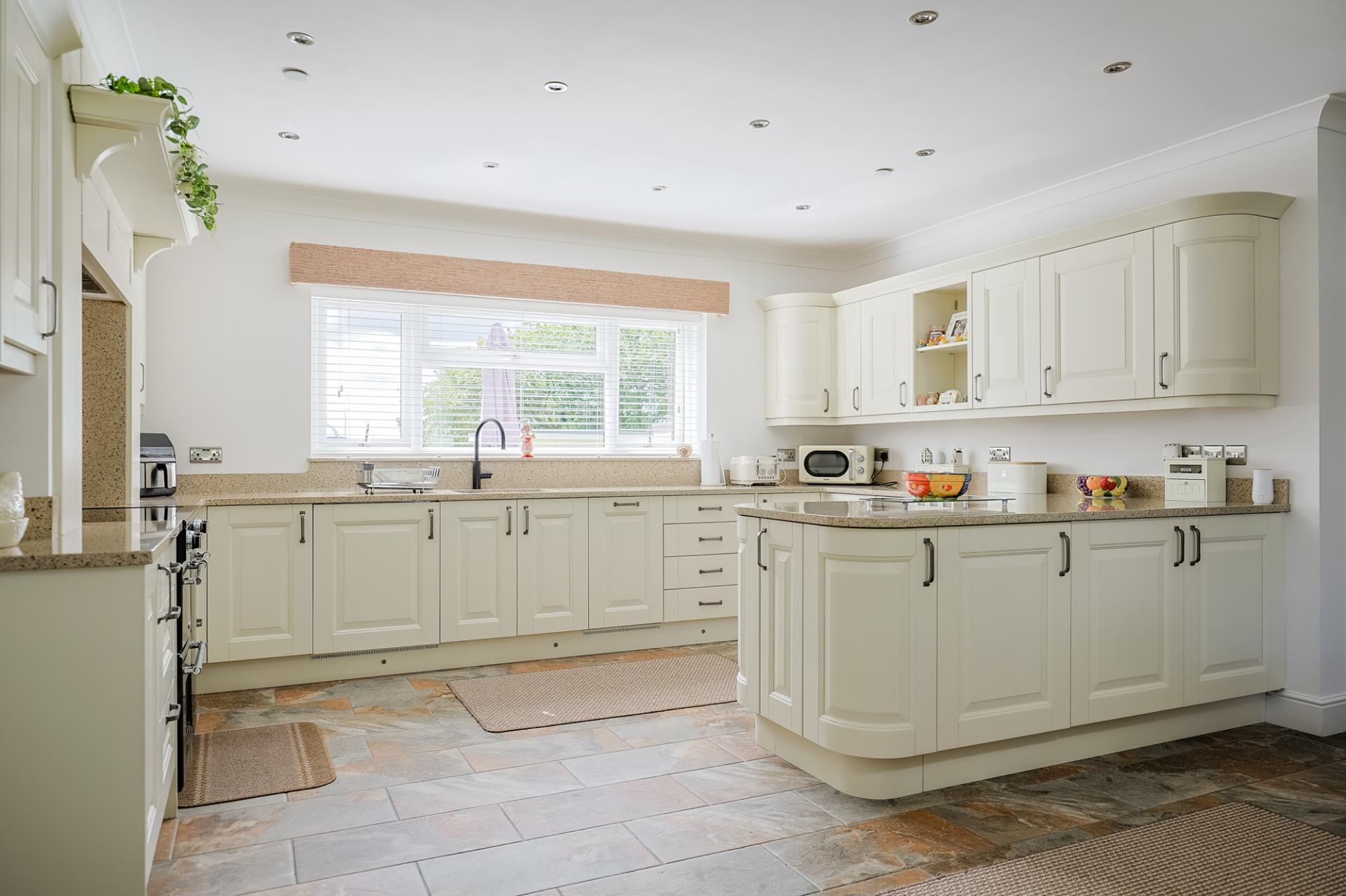 The heart of the home, this exceptionally bright space is illuminated by dual aspect windows that fill the room with natural light. Overlooking the garden and offering stunning countryside views, this area is enhanced by a vaulted ceiling with a feature-stained glass window and spotlighting, all complemented by tiled flooring. The kitchen boasts an array of wall and base units topped with porcelain worktops, along with integrated appliances, including a Belling double oven/grill, 4-ring induction hob, hot plate, extractor fan, integrated fridge, food waste disposal, instant hot tap, slimline Caple dishwasher, and an additional Caple oven. There is ample space for a large dining set, perfect for entertaining. From here, you have access to the lounge, utility, laundry room, and inner hallway.