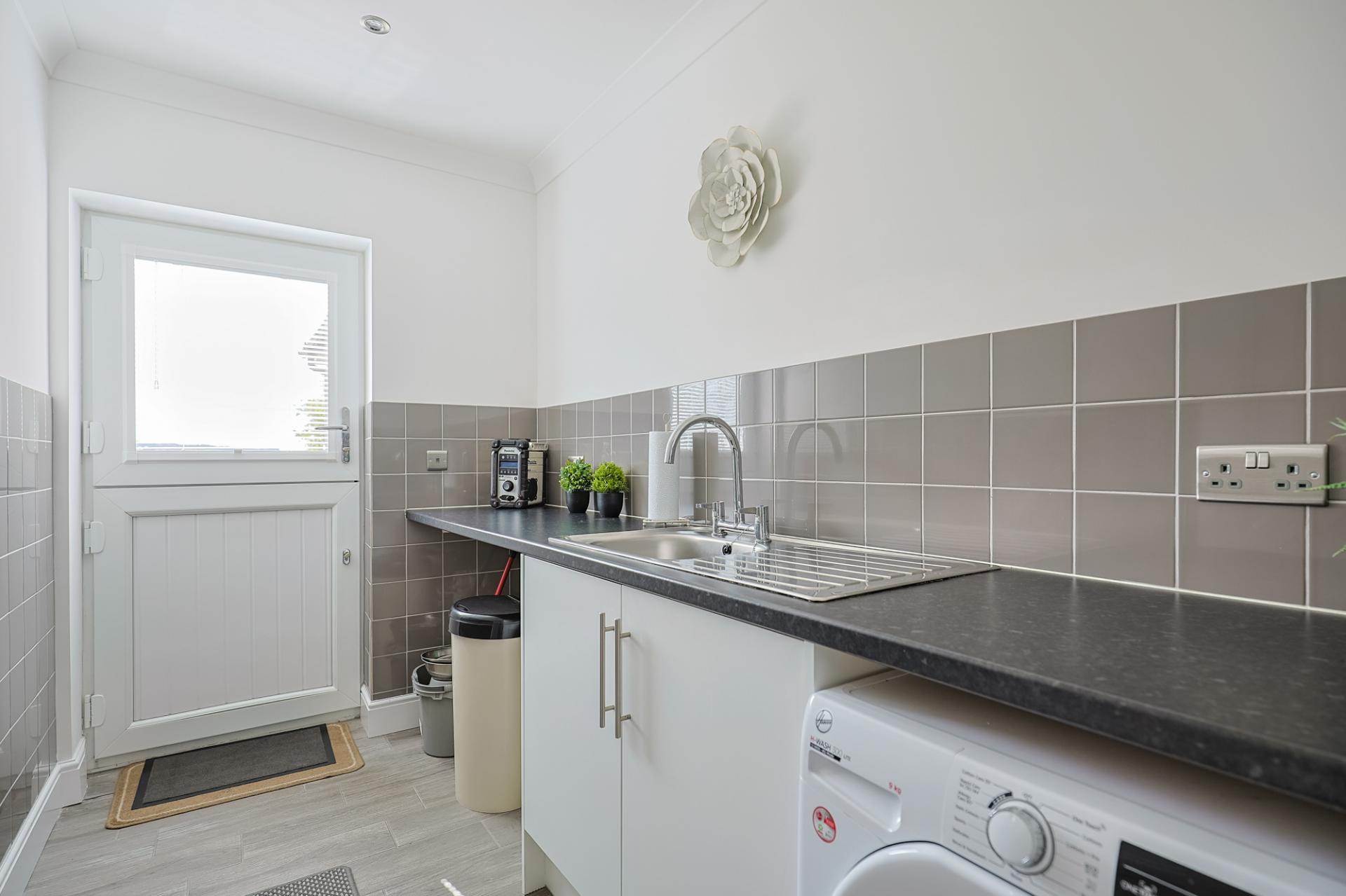 This utility room provides extra wall and base units, a single stainless-steel sink, spotlighting, an extractor fan, tiled flooring, and space for two under-counter appliances. A stable door leads to a rear porch, offering convenient access to the rear of the property and providing space to store coats and shoes.