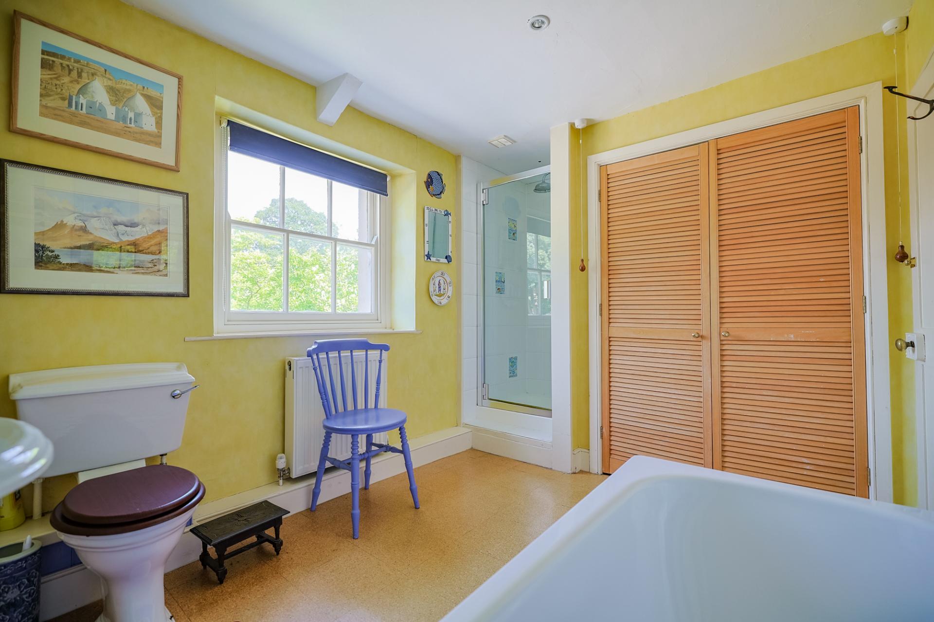 A generous double with sash window to the rear framing the views, carpeted flooring, and spotlighting. The private en-suite has a wash basin, fitted bath with handheld shower head, rear sash window, and access to the side of the home.