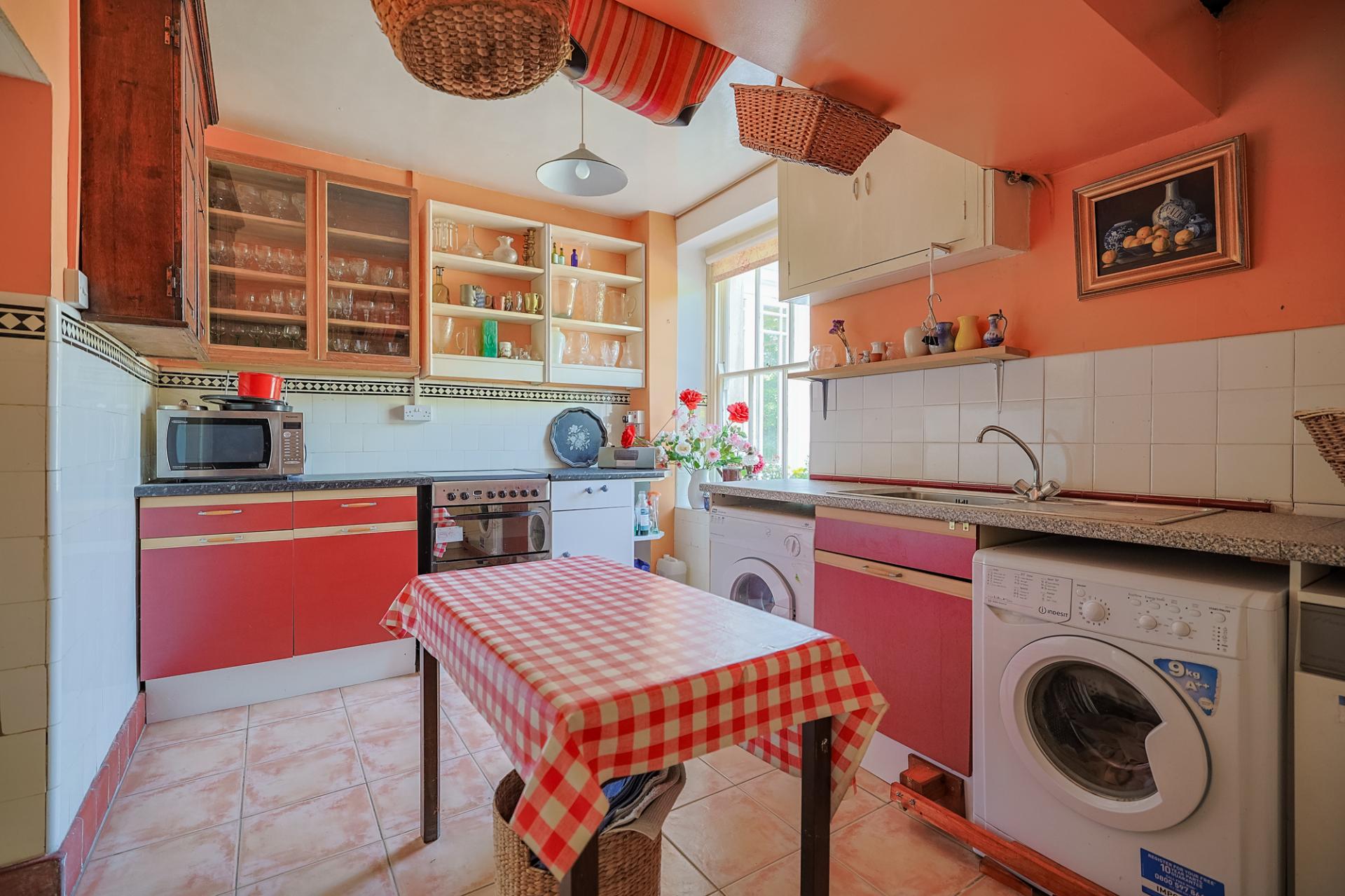 Accessed via a small step, the store room offers tiled flooring, a porcelain sink, a rear-facing window, and space to keep appliances neatly tucked away.