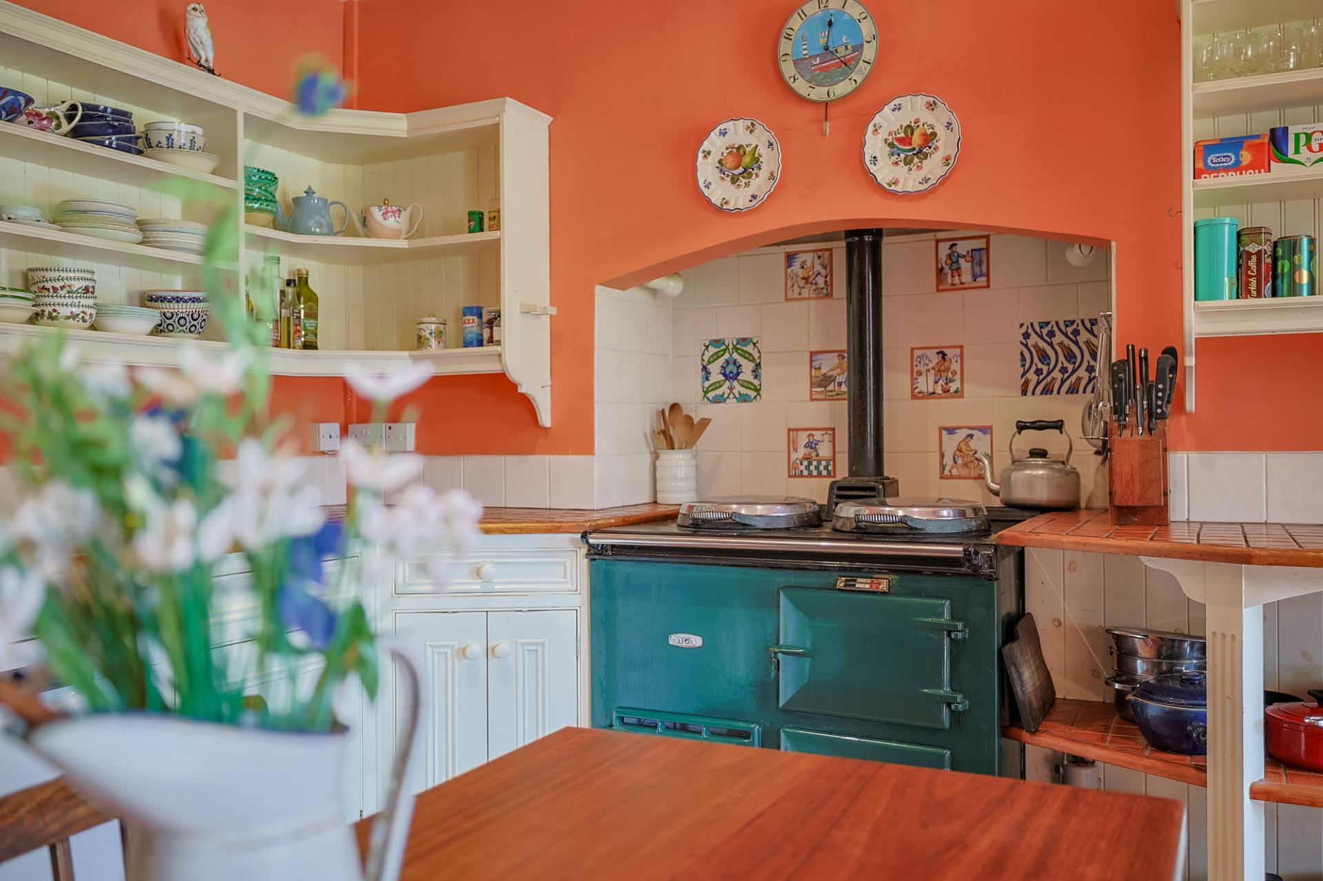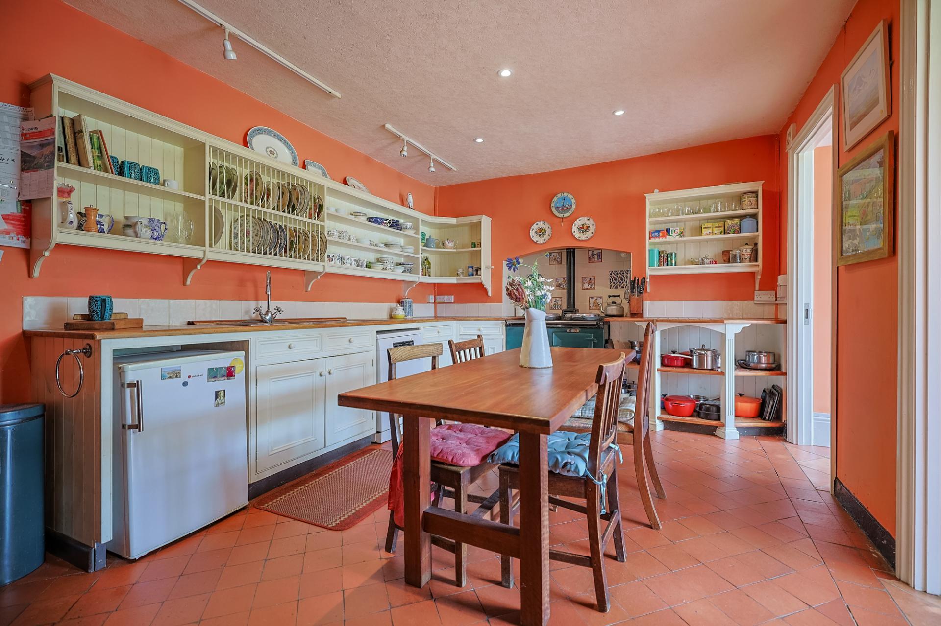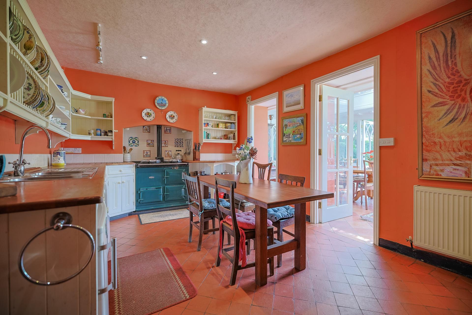 The heart of the home, the kitchen/breakfast room features a generous range of wall and base units, dual stainless steel sink and a half, and a classic AGA double oven with two hot plates. Terracotta tiled flooring, high ceilings, and spotlighting create a welcoming atmosphere. There’s space for two under-counter appliances and a large breakfast table. Dual doorways lead into the conservatory, allowing natural light to stream in. Behind a charming latch door, a secondary stairway ascends to the first floor.