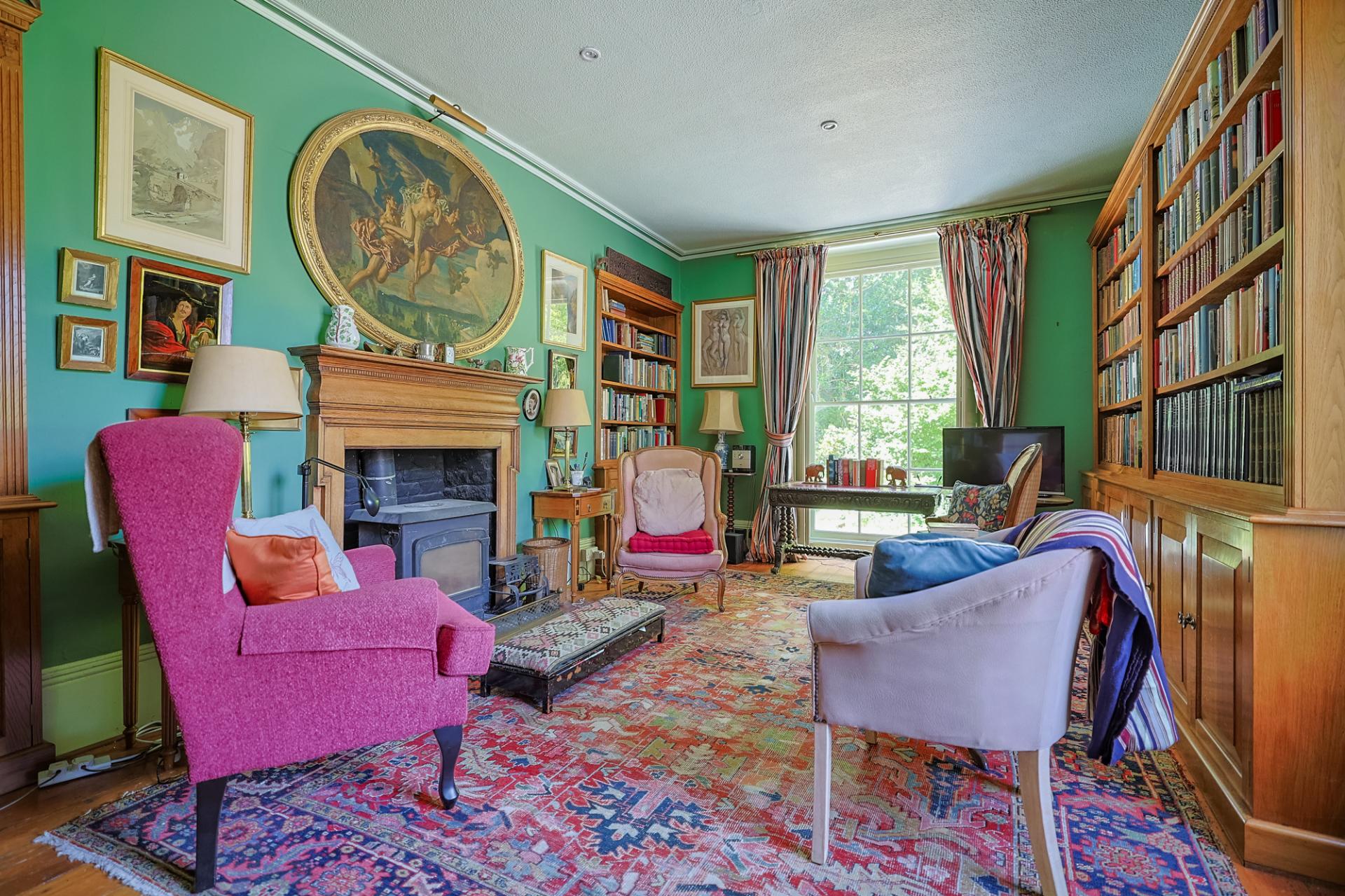 To the right of the hallway, the library exudes warmth and sophistication. Pine flooring, dual aspect windows, and high ceilings with detailed coving create an inviting atmosphere. The fine oak fireplace, complete with wood burner, slate hearth, and detailed oak surround, serves as a beautiful focal point.