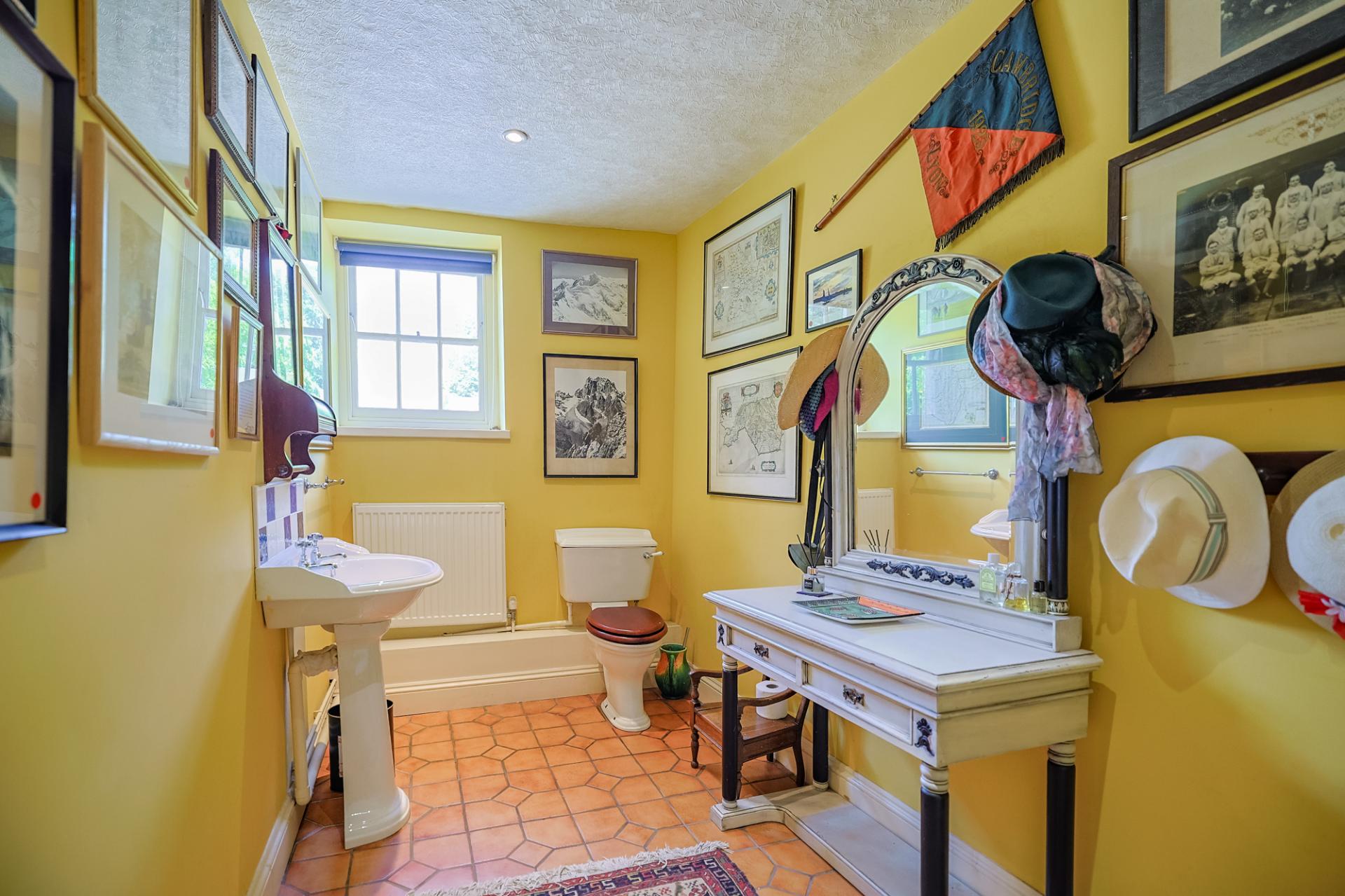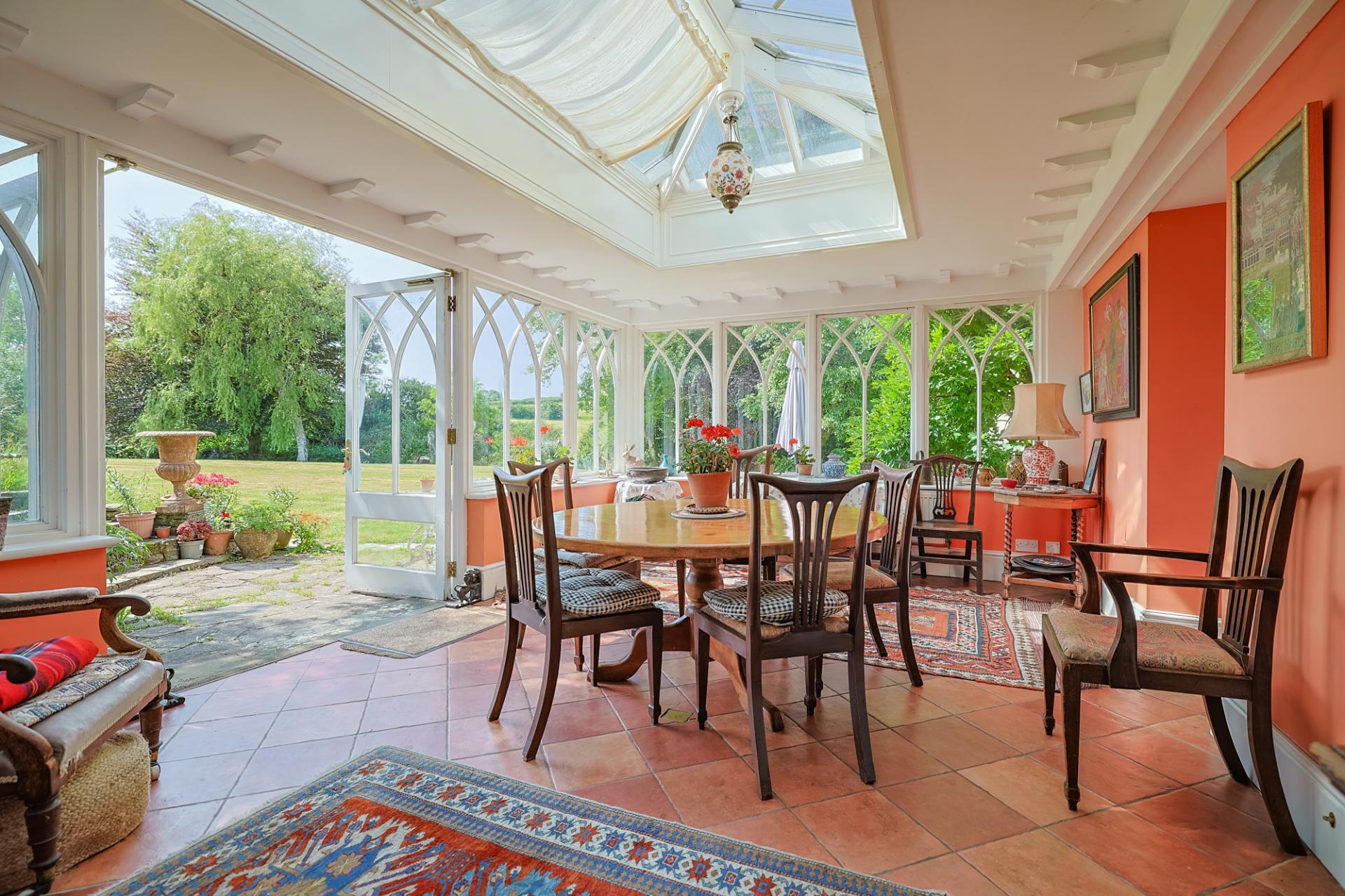 With an array of windows framing idyllic views of the grounds, the conservatory is a tranquil retreat. Terracotta tiled flooring, ample space for furniture, and double doors connecting directly to the gardens make it a perfect place to relax or entertain. An additional orangery-style window adds to its charm.