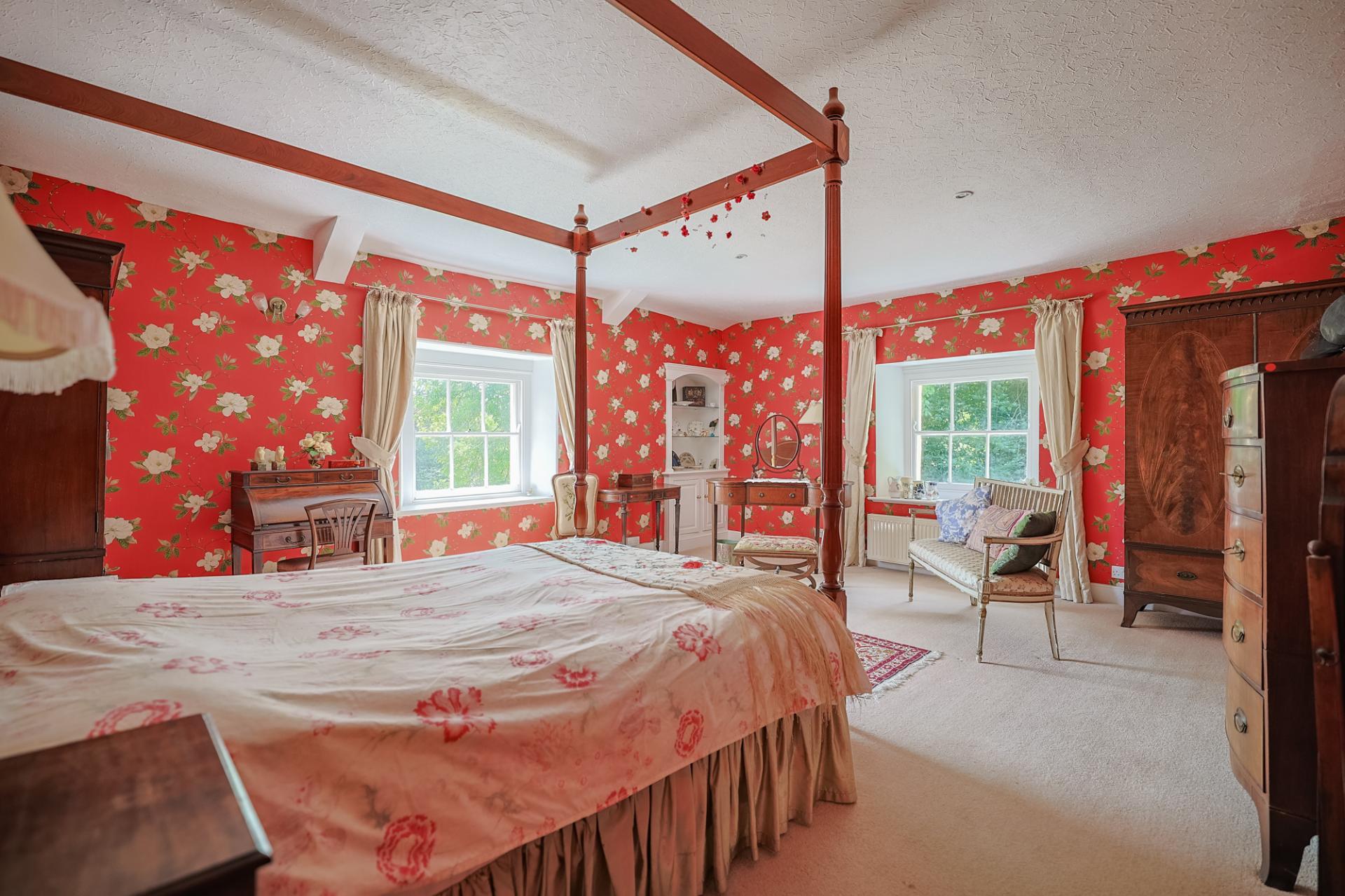 Positioned at the rear with dual aspect sash windows offering serene garden views, this spacious room features carpeting, spotlighting, and an inset alcove for storage, with ample space for a dressing or seating area.
