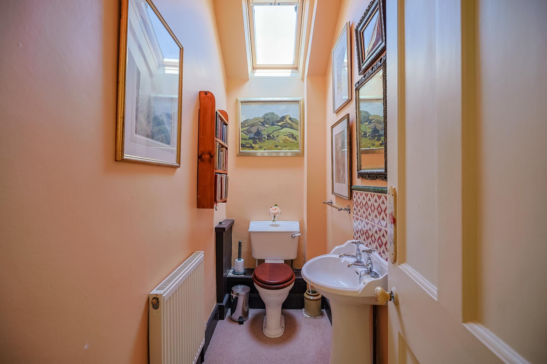 The bathroom offers a WC, wash basin, fitted bath with handheld shower head, shower cubicle, heated towel rail, vinyl flooring, extractor fan, double storage cupboard, and a front-facing sash window. The WC includes a wash basin, WC Velux window, spotlighting, and carpeted flooring.