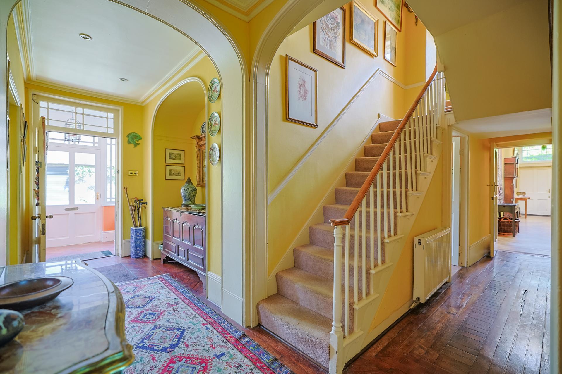 Acting as the central hub of the home, the entrance hallway oozes character. Laid with oak flooring, the space is enhanced by high ceilings with spot lighting and intricate detailing. Natural light floods in through two orangery-style windows further along the hallway and a feature window above the rear door. From here, you have access to all the principal reception rooms, the stairway to the first floor, and direct access out to the gardens.