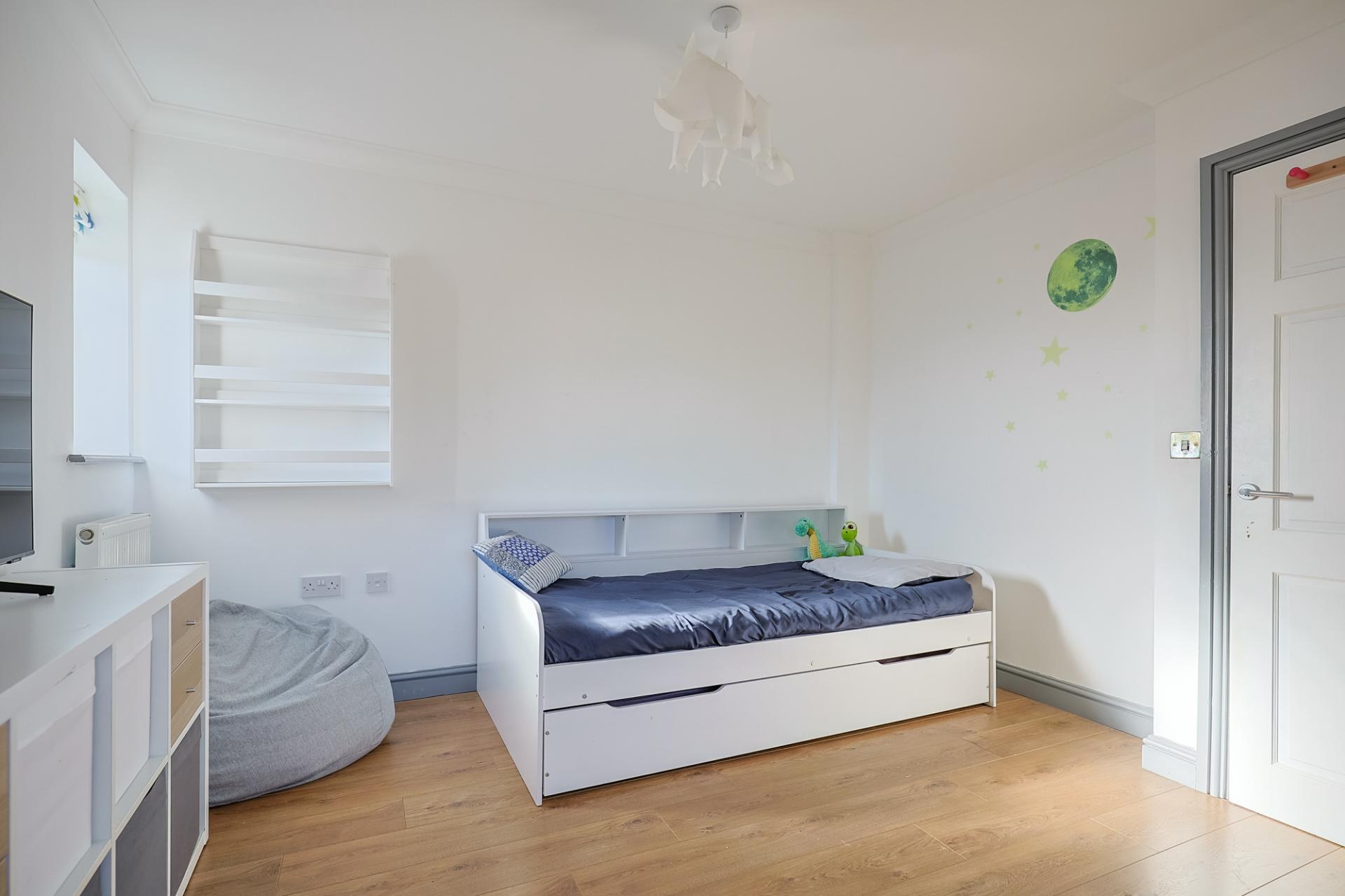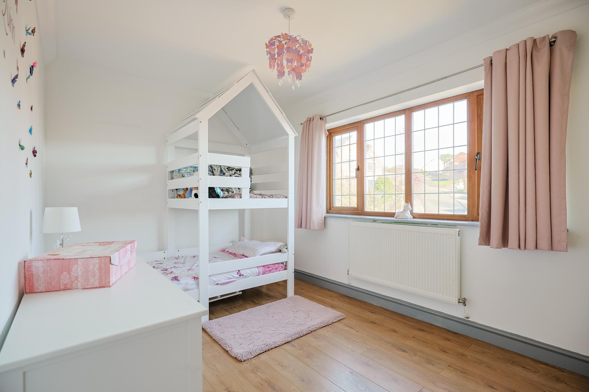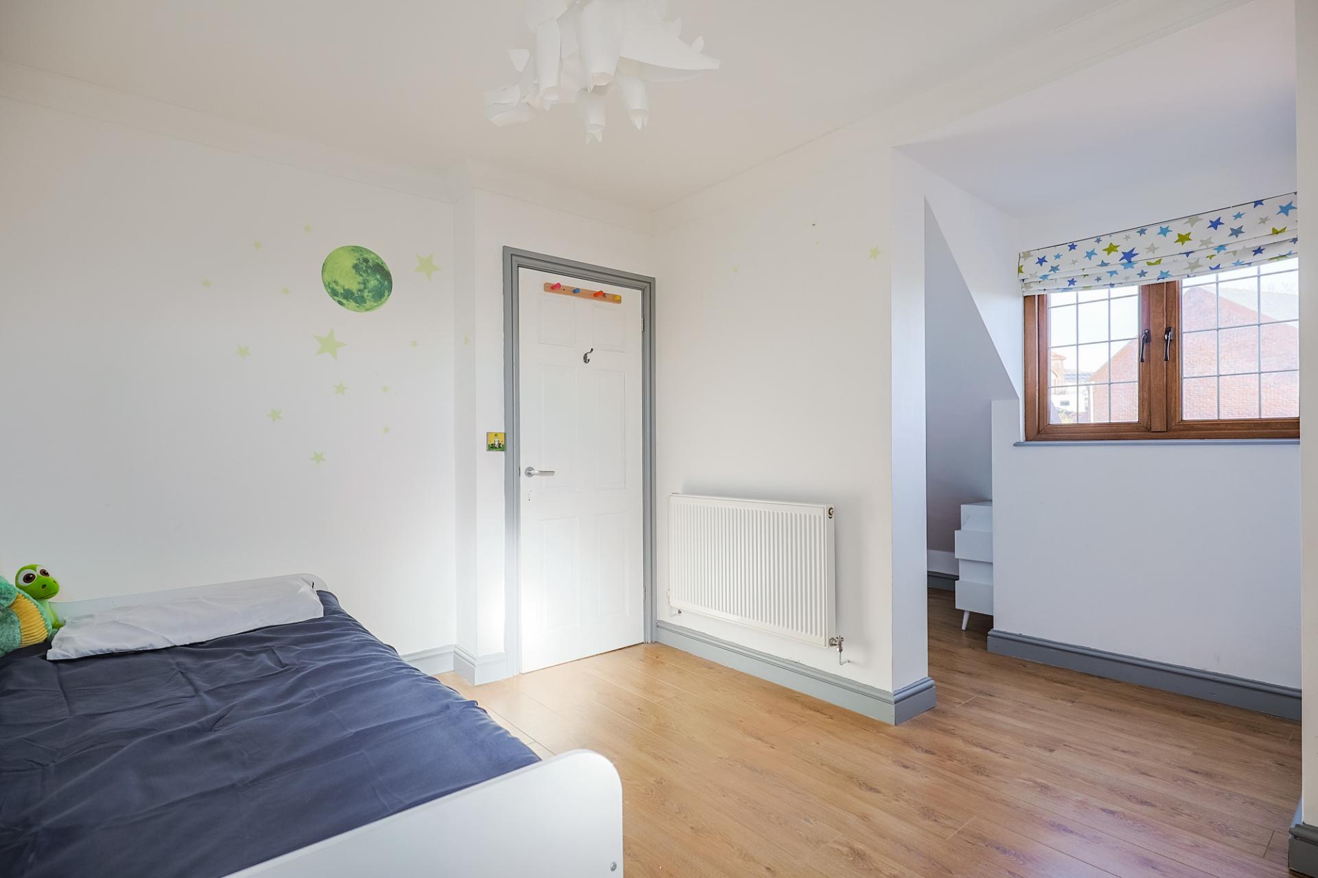 A dual-aspect room that feels light and spacious, with laminate flooring, coving, and an additional vaulted ceiling area ideal for storage or a wardrobe.