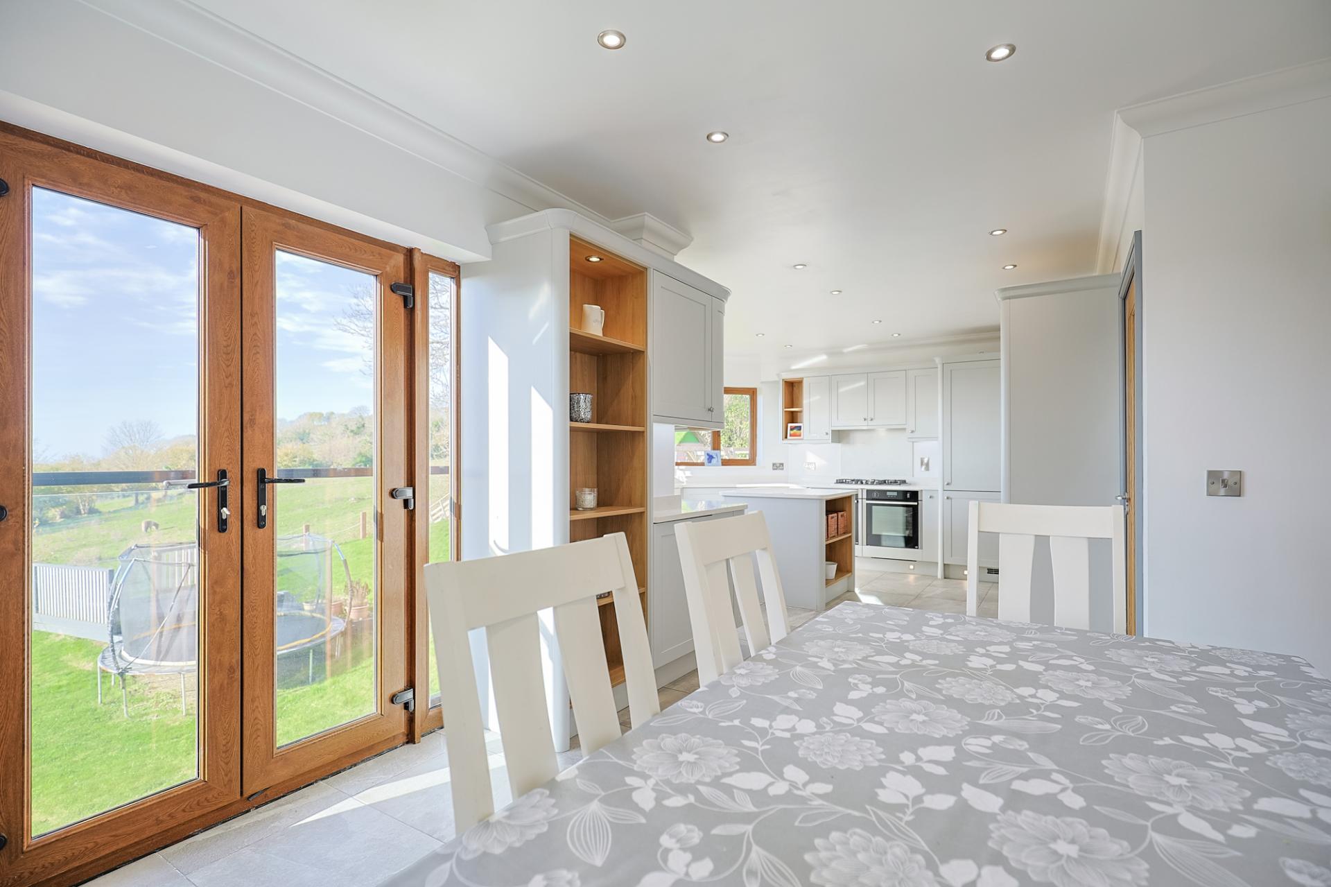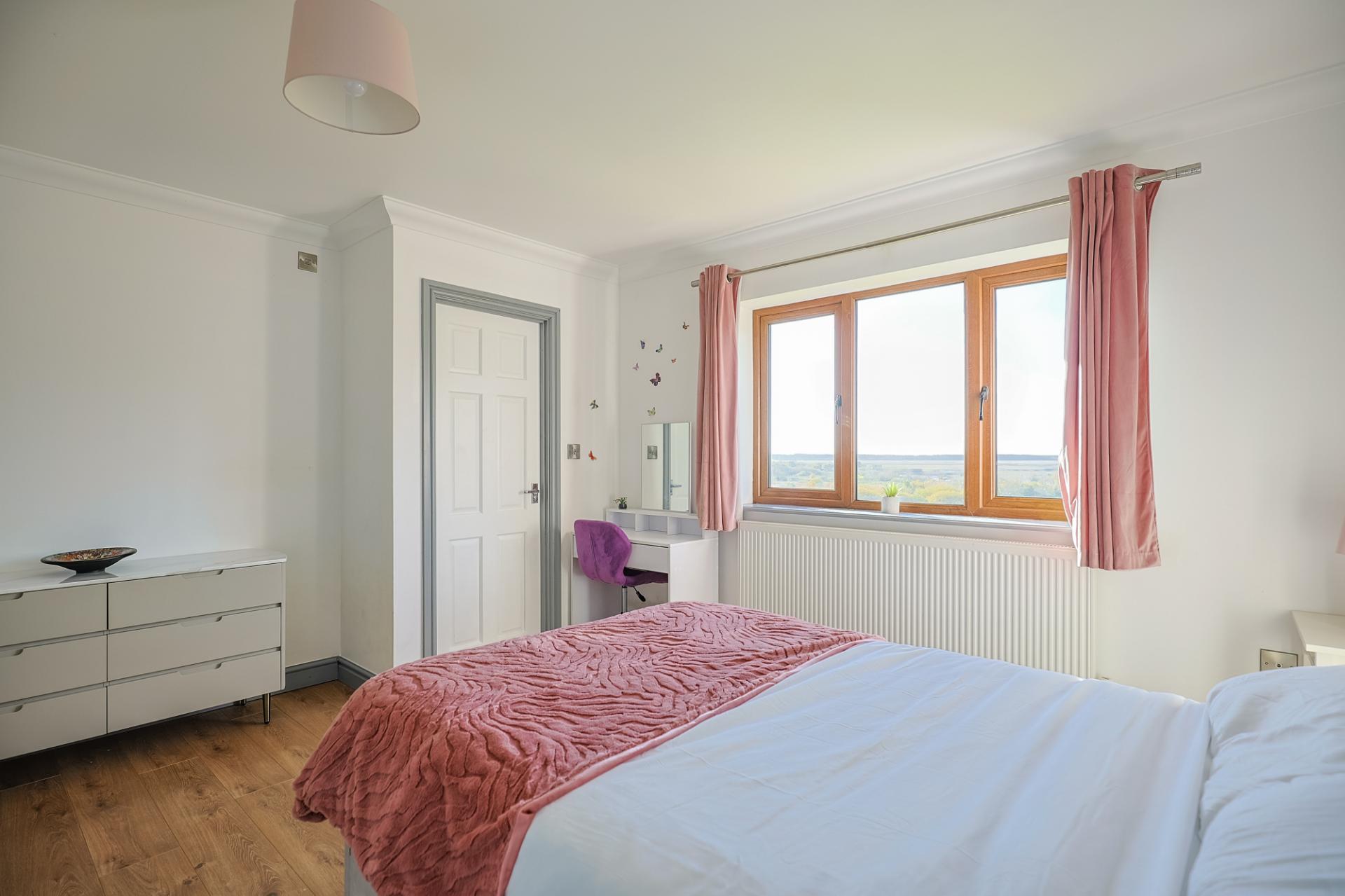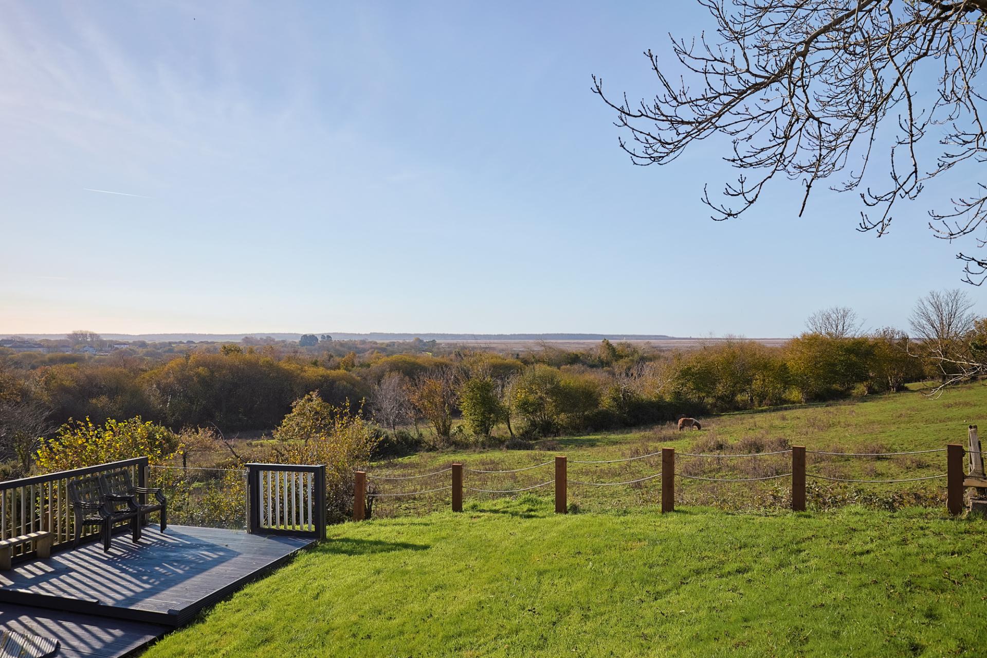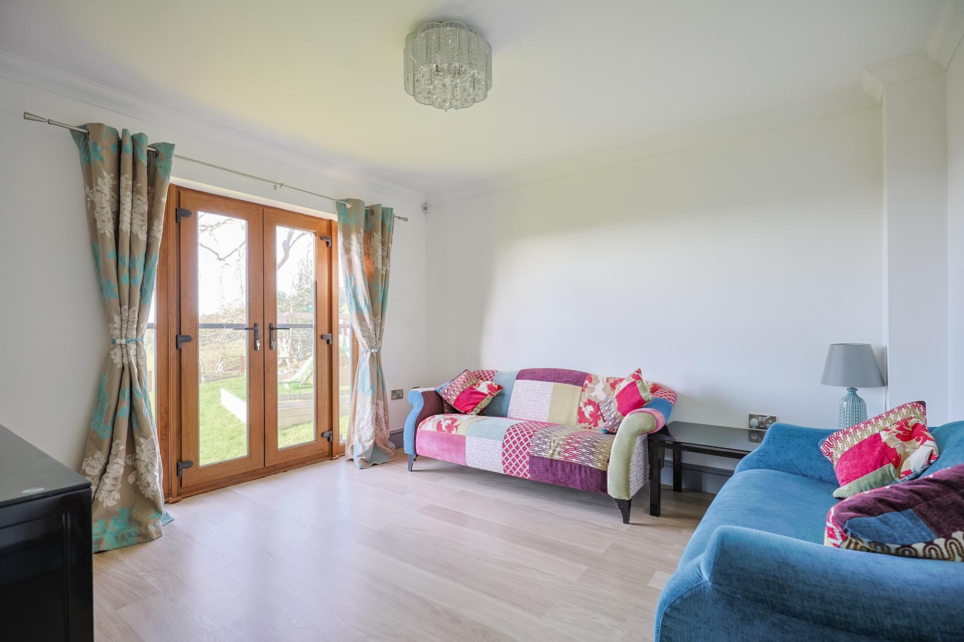 A versatile and bright space with double doors leading to a Juliet balcony, flanked by glass windows, showcasing stunning views of the garden, countryside, and estuary. This versatile room is finished with laminate flooring and coving.