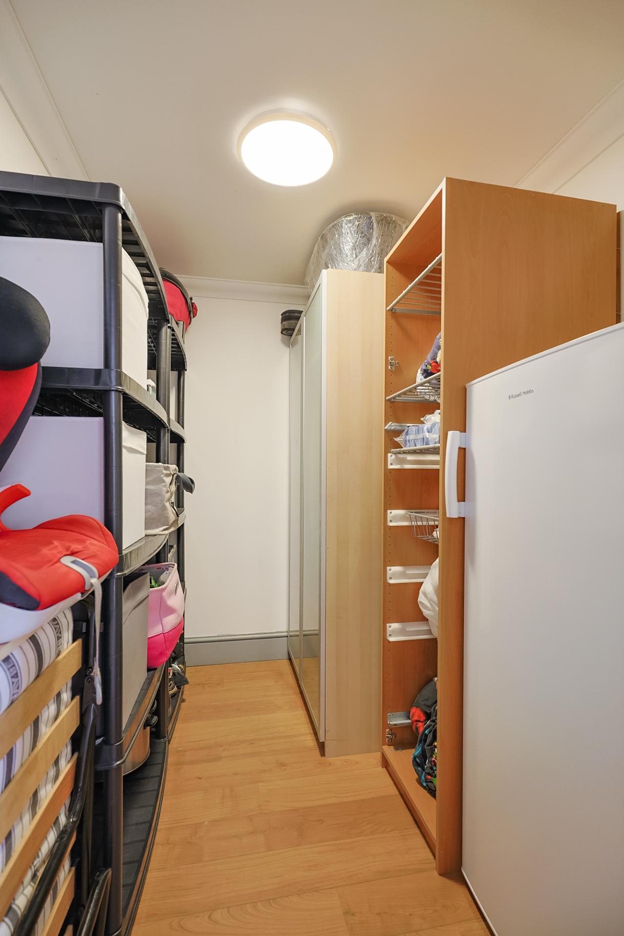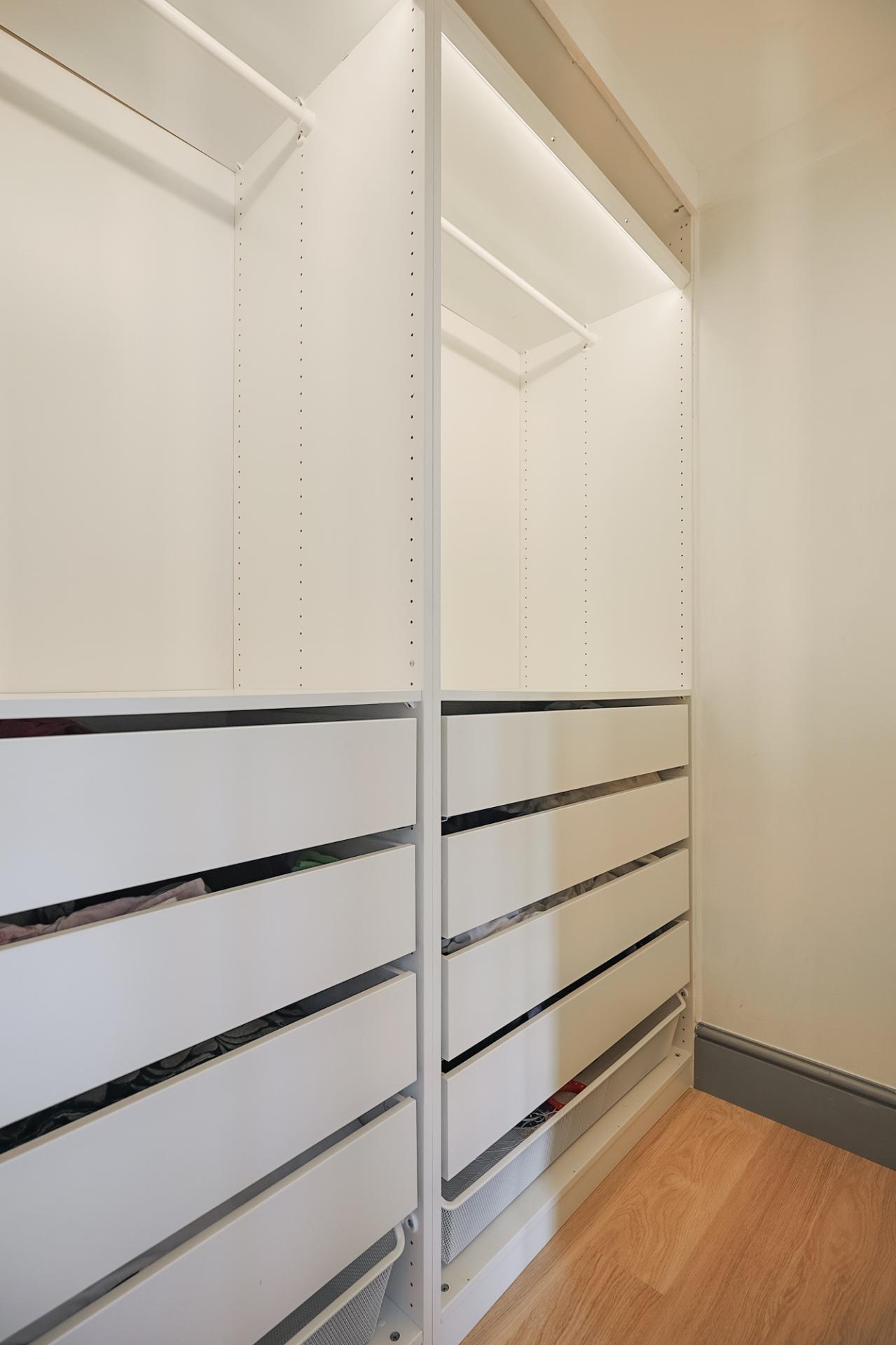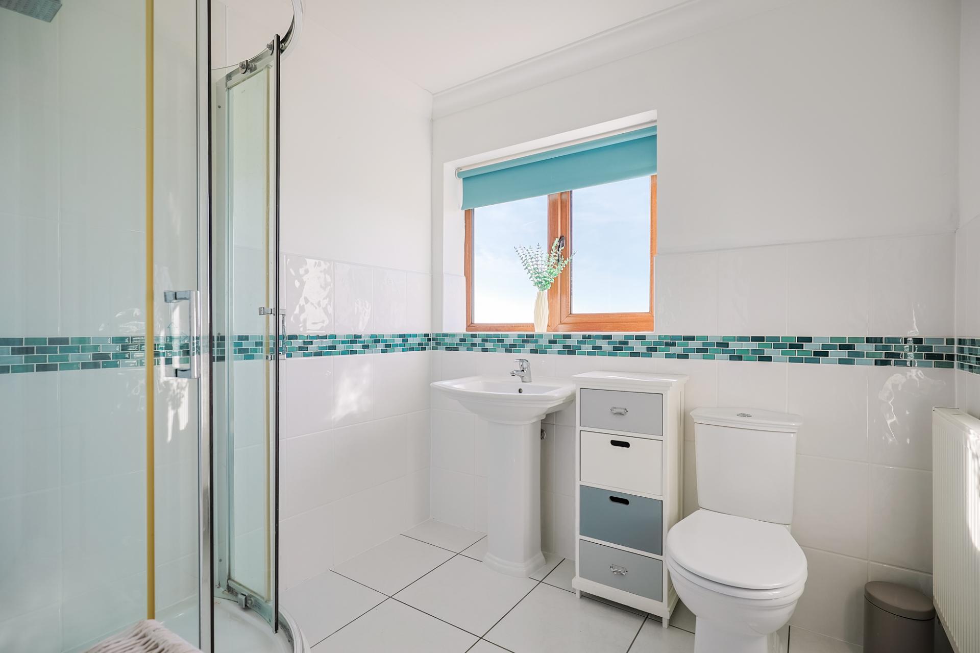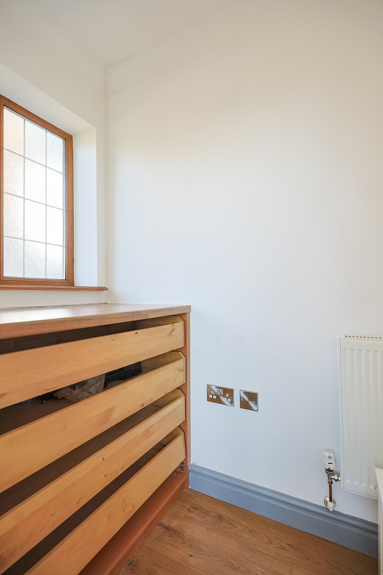 This family bathroom is fitted with a bath, handheld shower, WC, wash basin, a frosted side window, extractor fan, and a large storage cupboard offers ample shelving and hanging rail space.