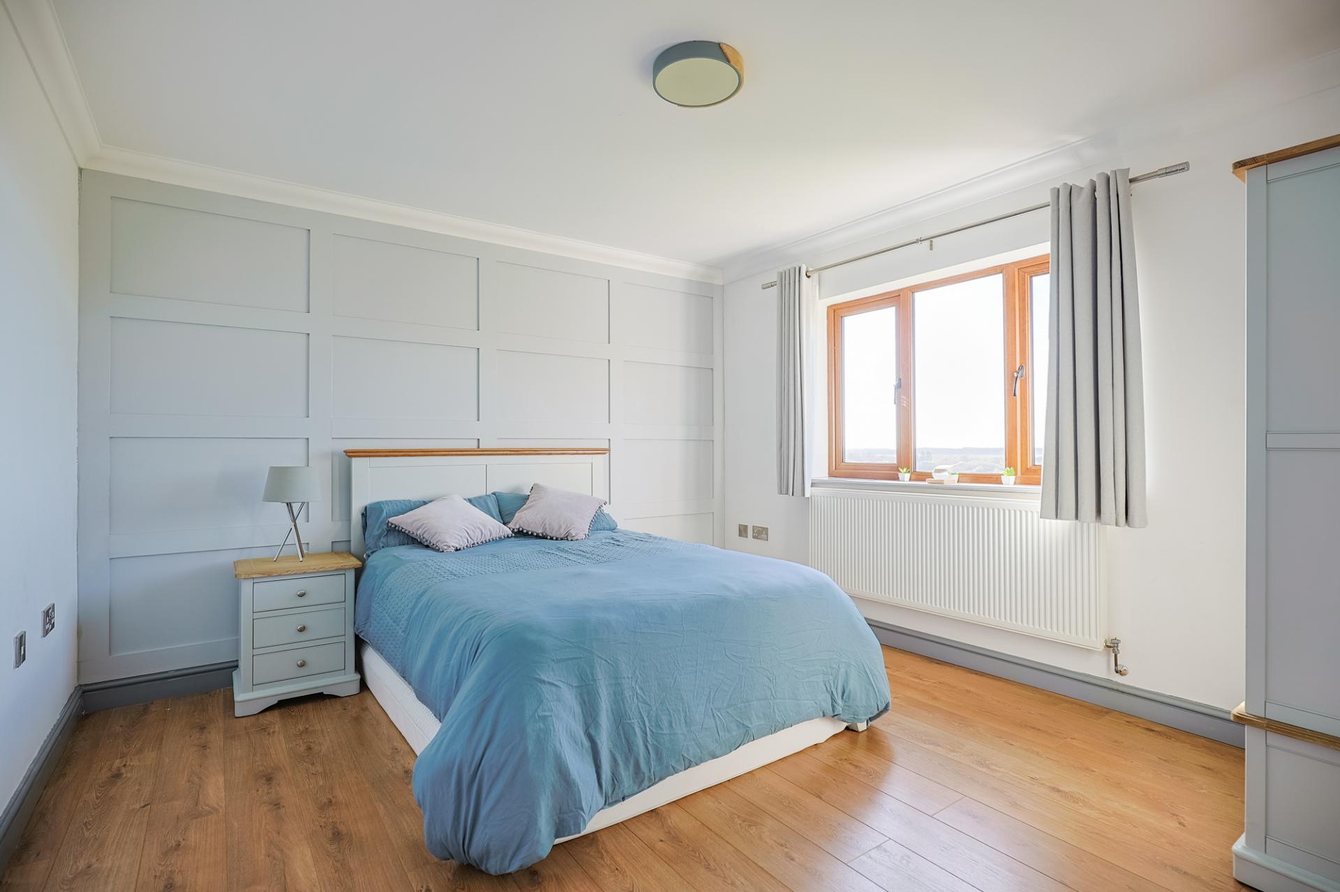 This generously sized bedroom offers breath-taking estuary views, laminate flooring, panel-style walls, and coving. The en suite includes a WC, wash basin, shower cubicle, and tiled flooring.