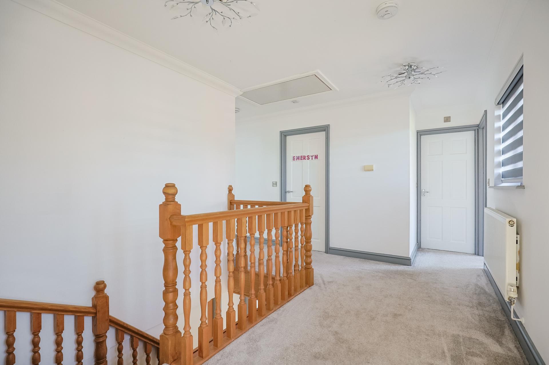Ascending the carpeted staircase, you arrive at a spacious, bright landing with two front-facing windows. From here, you can access four additional bedrooms and the family bathroom.