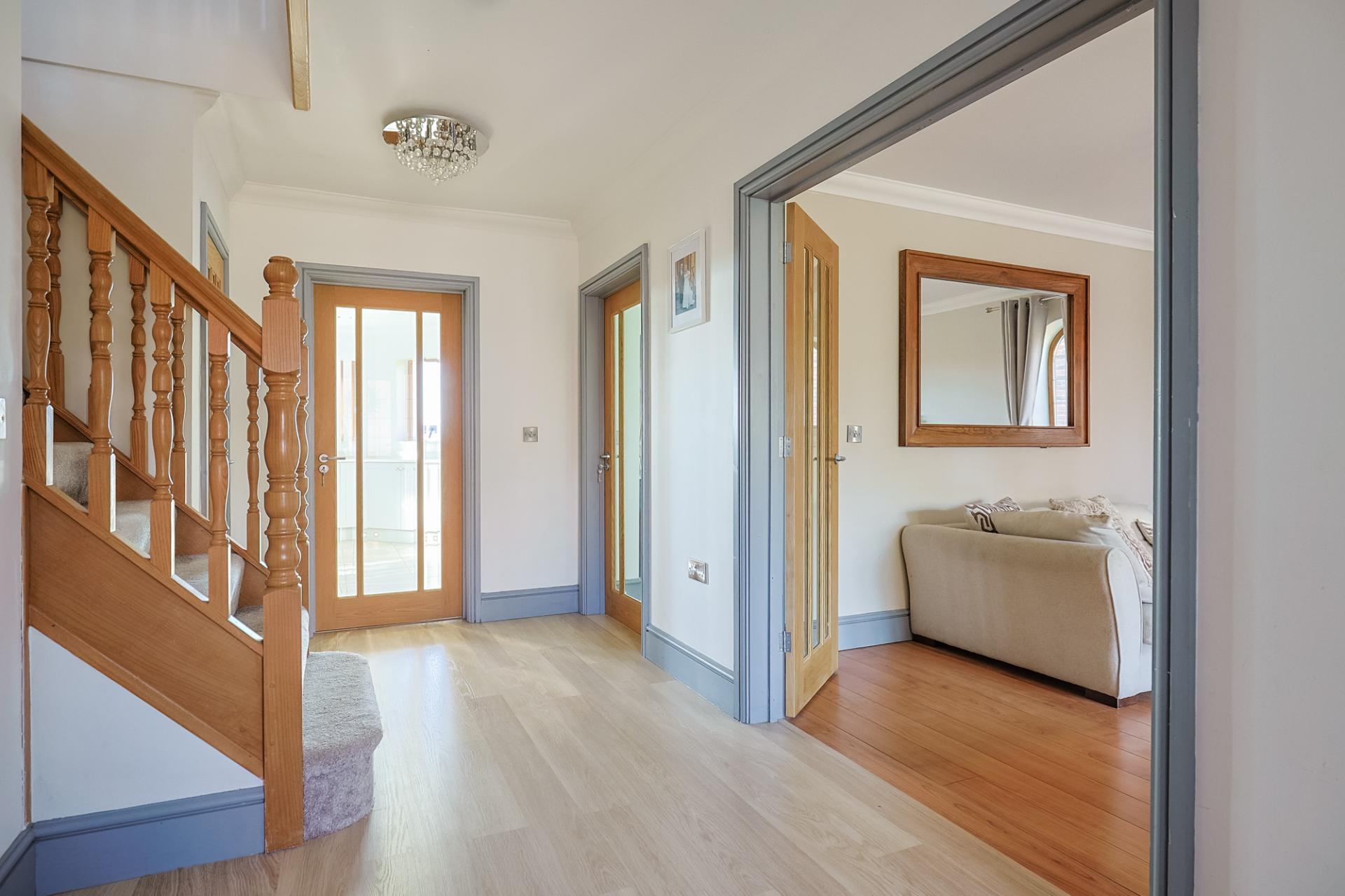 You’re welcomed into a spacious entranceway laid with laminate flooring and accented by coving. This central hub offers access to all the main living spaces, including a double bedroom with an en suite, a cloakroom equipped with shelving and coat hooks, and a carpeted staircase leading to the first floor.