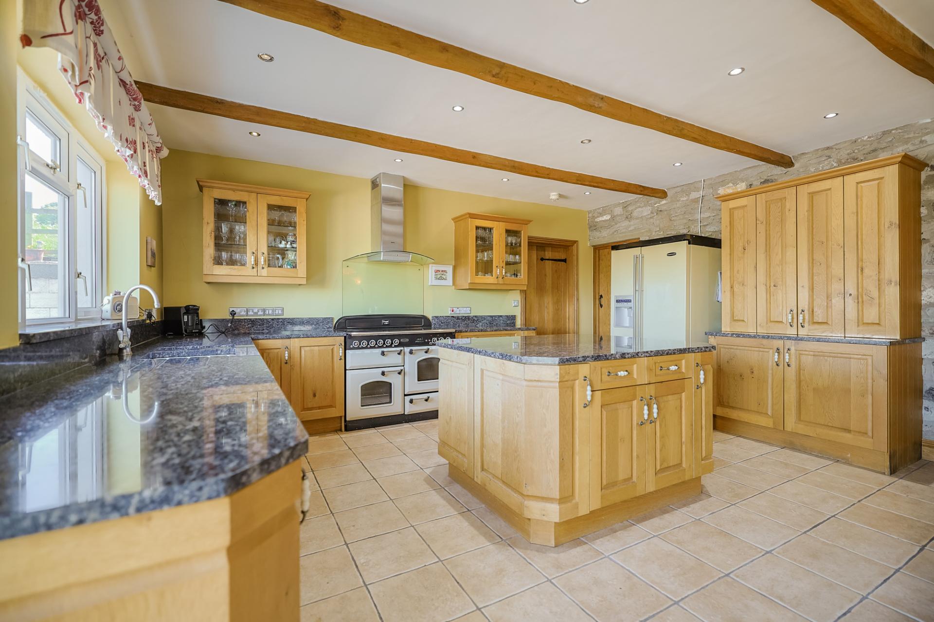 The open-plan kitchen/dining/family room is undoubtedly the heart of the home, filled with charm and light from its dual-aspect windows, and double patio doors that open onto the garden patio. With stunning rural views and character details such as exposed stone walls and beams, feature stained-glass window, tiled flooring with underfloor heating, and spotlighting, this space is both functional and beautiful. The kitchen is fully equipped with wall and base units topped with granite worktops, a double Franke porcelain sink, Bosch dishwasher, Rangemaster Classic 110 with a 5-ring electric hob and hotplate, an elevated Bosch extractor, and space for a free-standing American-style fridge/freezer. The central island offers additional storage and workspace, making this area ideal for both cooking and entertaining. The room also accommodates a spacious dining area and a cosy family seating zone.