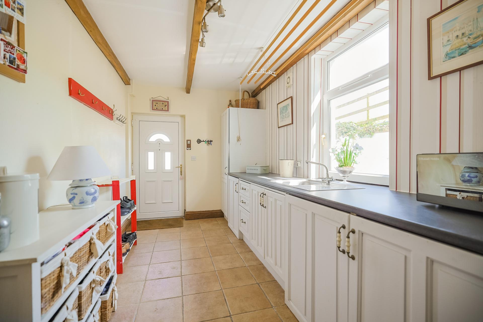Adjacent to the kitchen is the utility/laundry room, which offers extra base and tall units, a stainless-steel sink with drainer, tiled flooring with underfloor heating, exposed beams, extractor fan, a side window, and a laundry rail. There’s also room for three under-counter appliances.