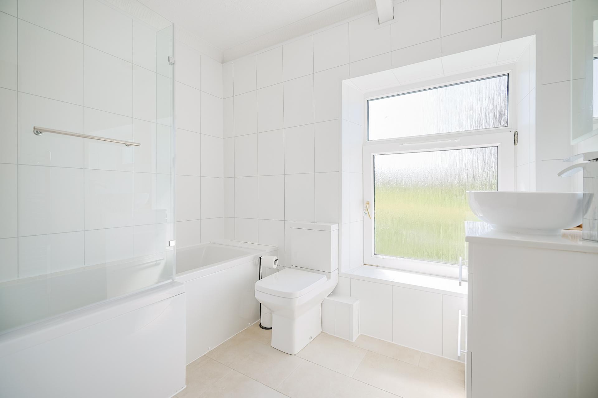 The modern family bathroom has been recently refurbished to a high standard and includes a WC, wash basin with under-storage, fitted bath with overhead shower, heated towel rail, mirror with sensor lighting, extractor fan, tiled flooring and walls, and a frosted front window.