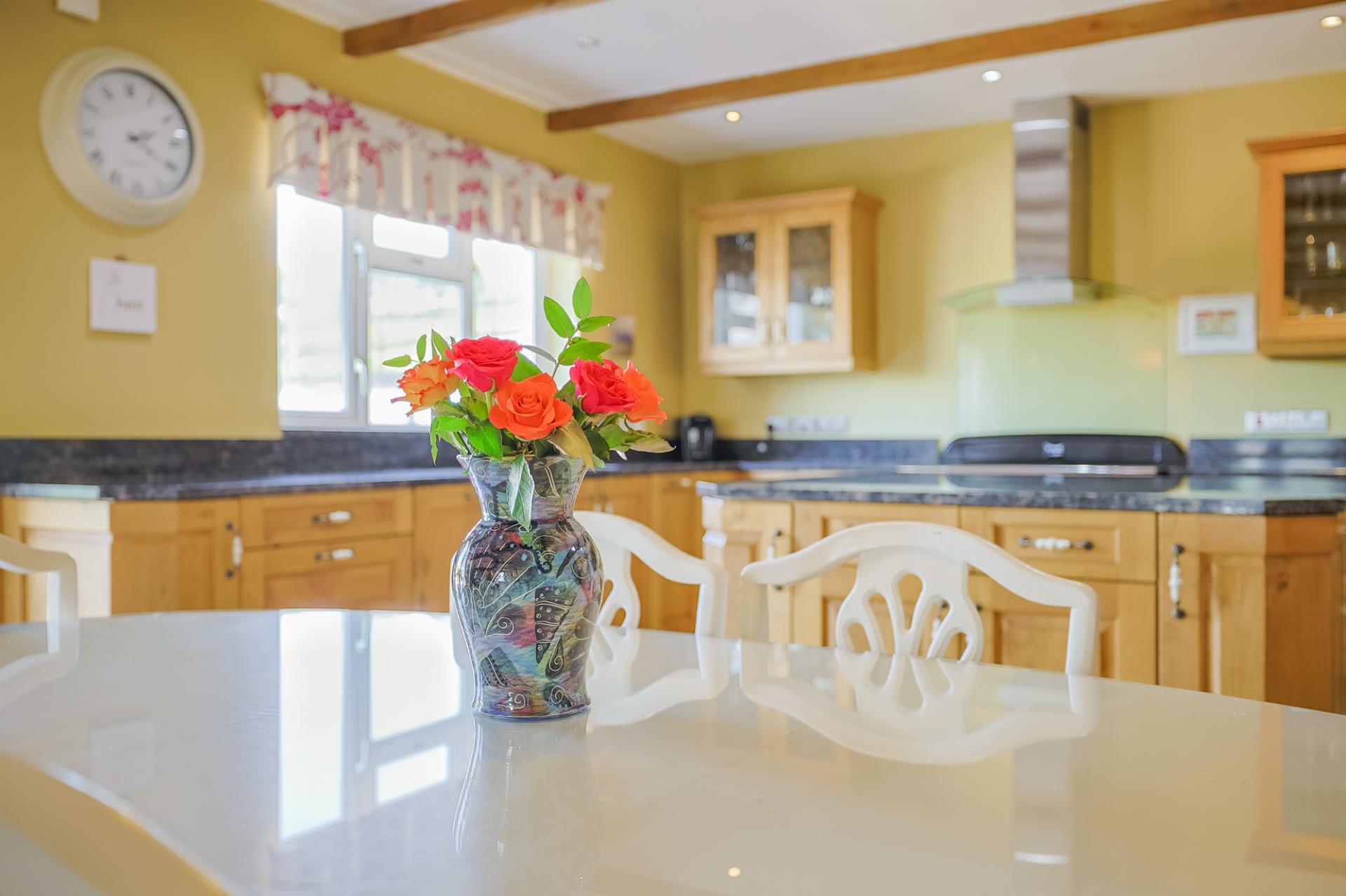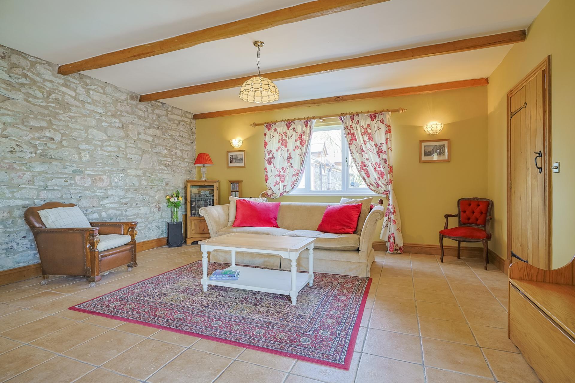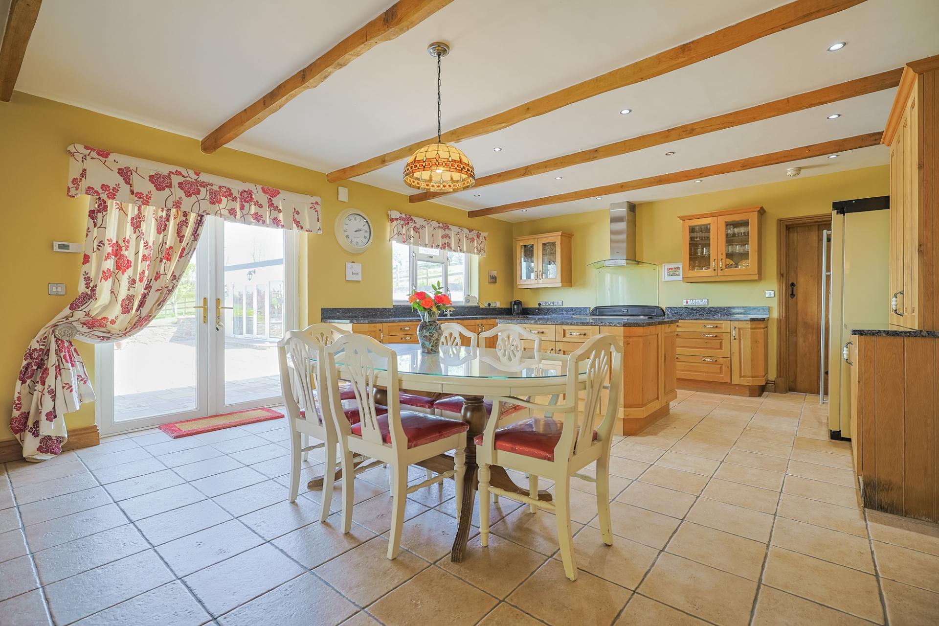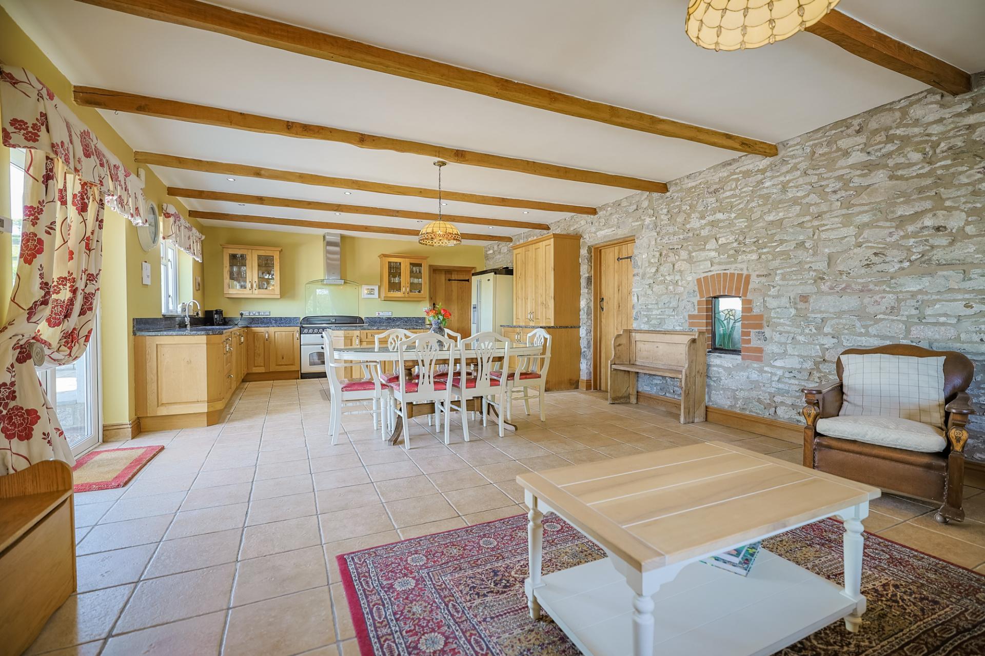 As you enter the home, you’re welcomed by a charming entranceway with tiled flooring and exposed beams. This space gives you access to the ground floor WC and leads seamlessly into the heart of the home, an impressive open-plan kitchen/dining/family room.