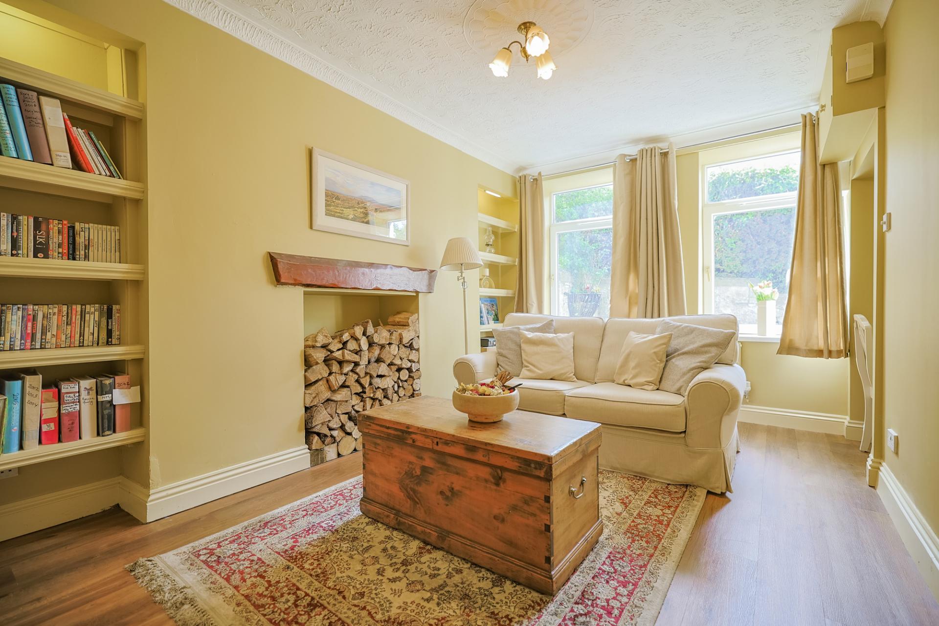 The snug room is a versatile space, perfect as a home office or reading nook. It features two front-facing windows, oak flooring, three alcoves—two with fitted shelving and one with a desk—and a feature fireplace with a wooden mantel.