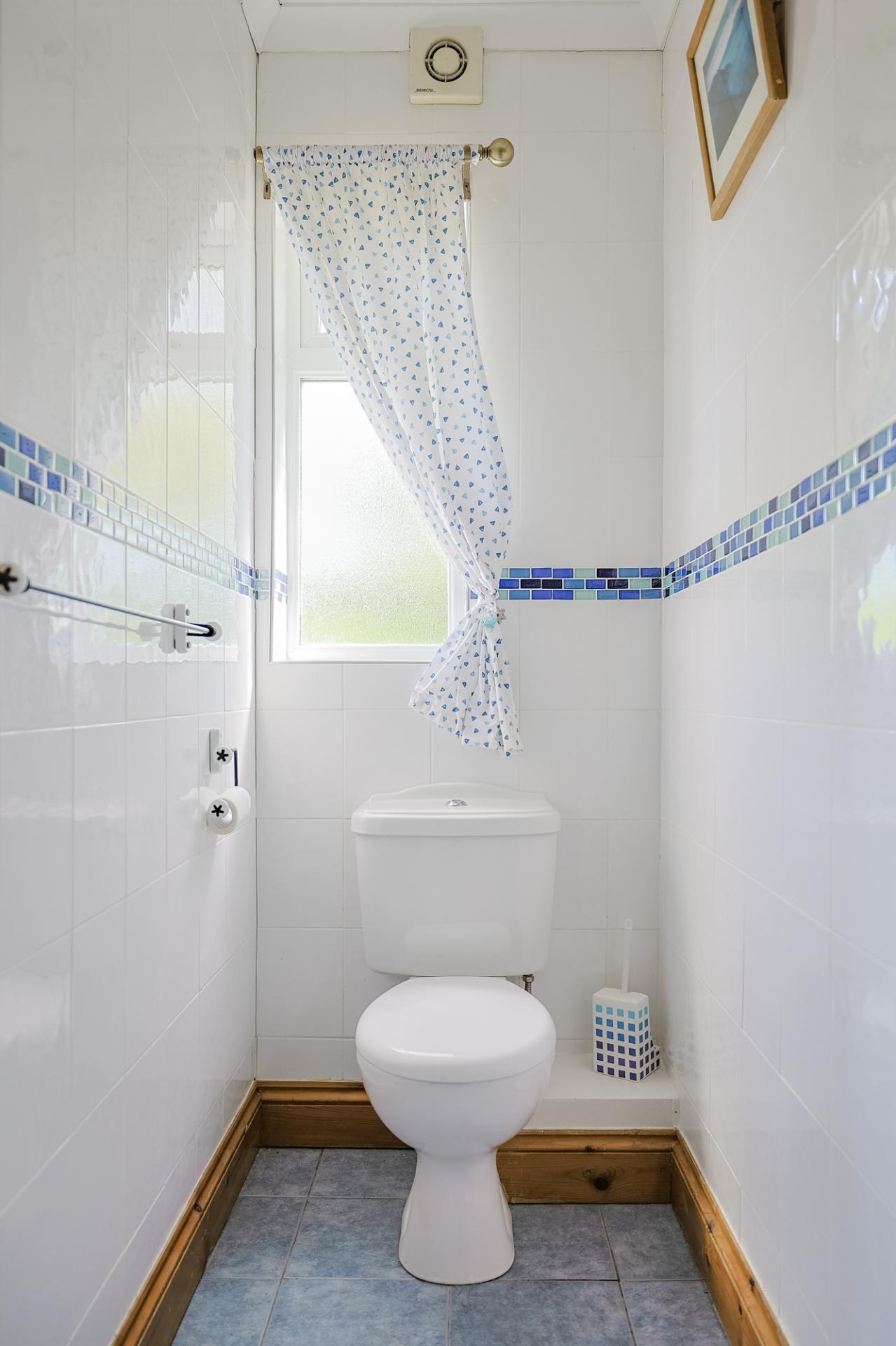 The ground floor WC is a practical addition to the home, featuring tiled flooring with underfloor heating, WC, wash basin, extractor fan, a frosted rear-facing window, and exposed beams.