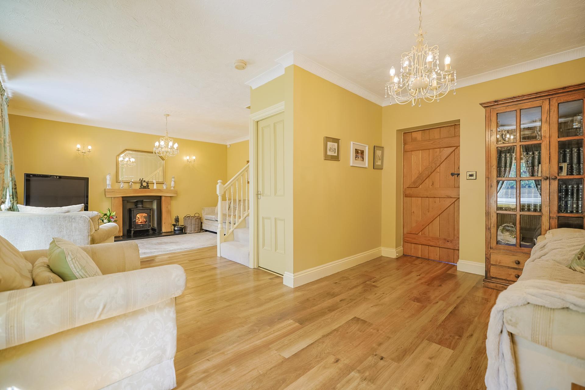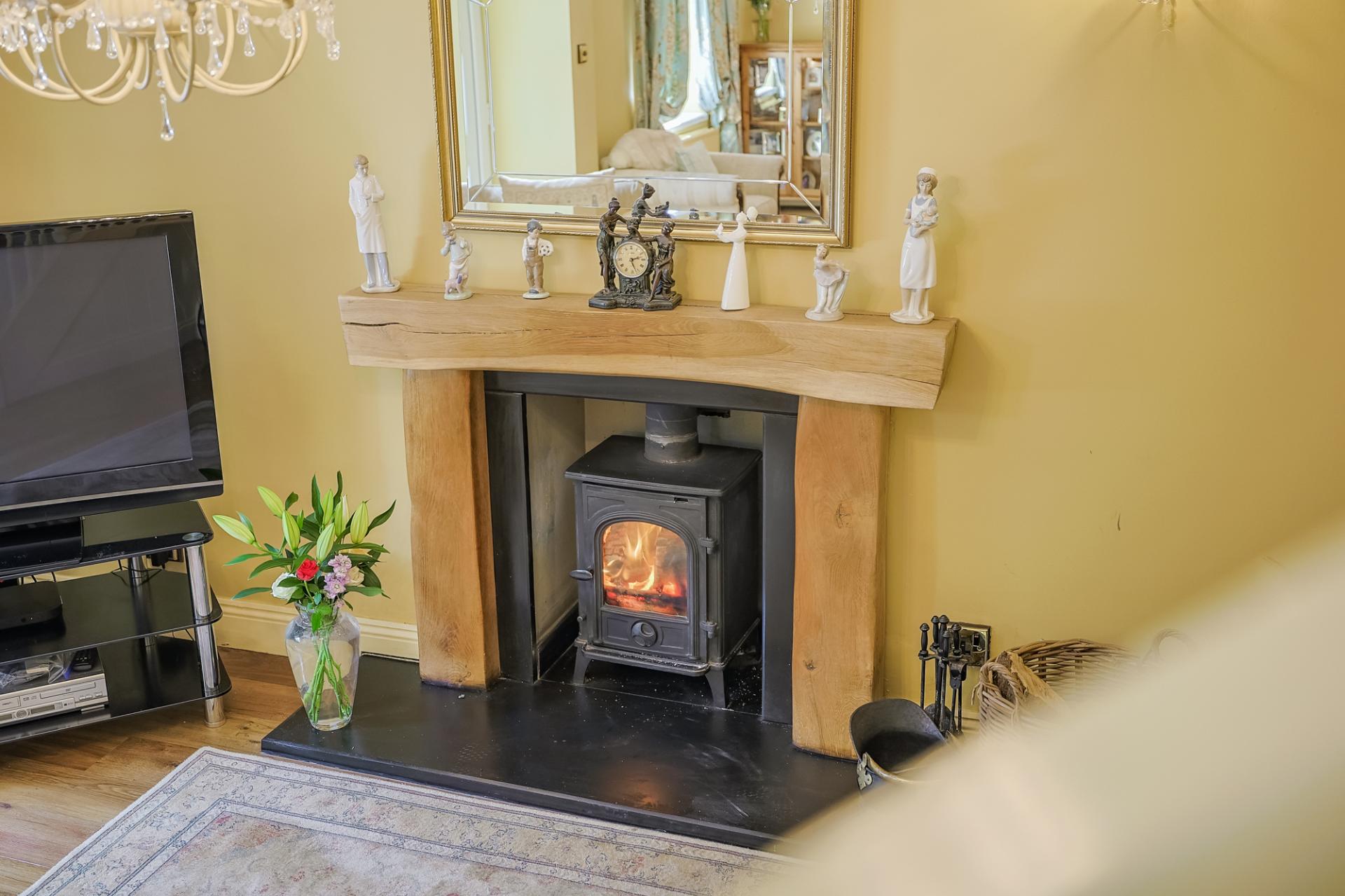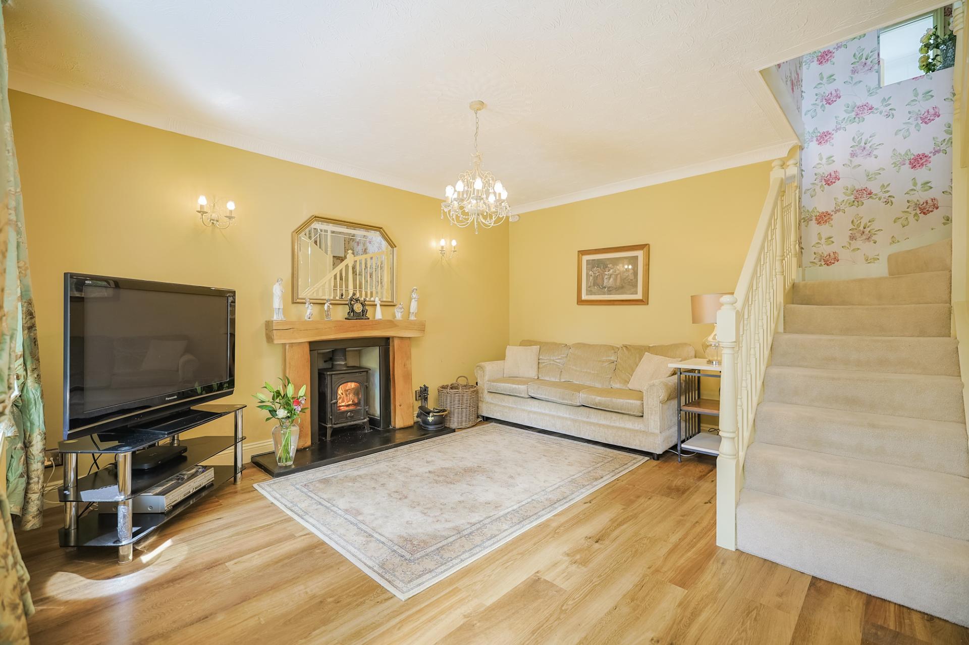 The lounge is another inviting and character-filled space. U-shaped, it wraps around the staircase to the first floor and includes a generous under-stair storage cupboard. The main feature is the wood burner with a slate hearth and oak mantel. With two front-facing windows, natural light floods in, enhancing the oak flooring and homely atmosphere.