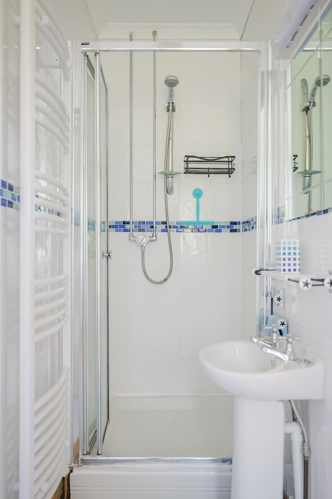 The Jack and Jill bathroom is fitted with a WC, wash basin, shower cubicle, heated towel rail, extractor fan, shaving light with point, tiled flooring and walls, and a frosted side-facing window—serving both bedrooms two and three.
