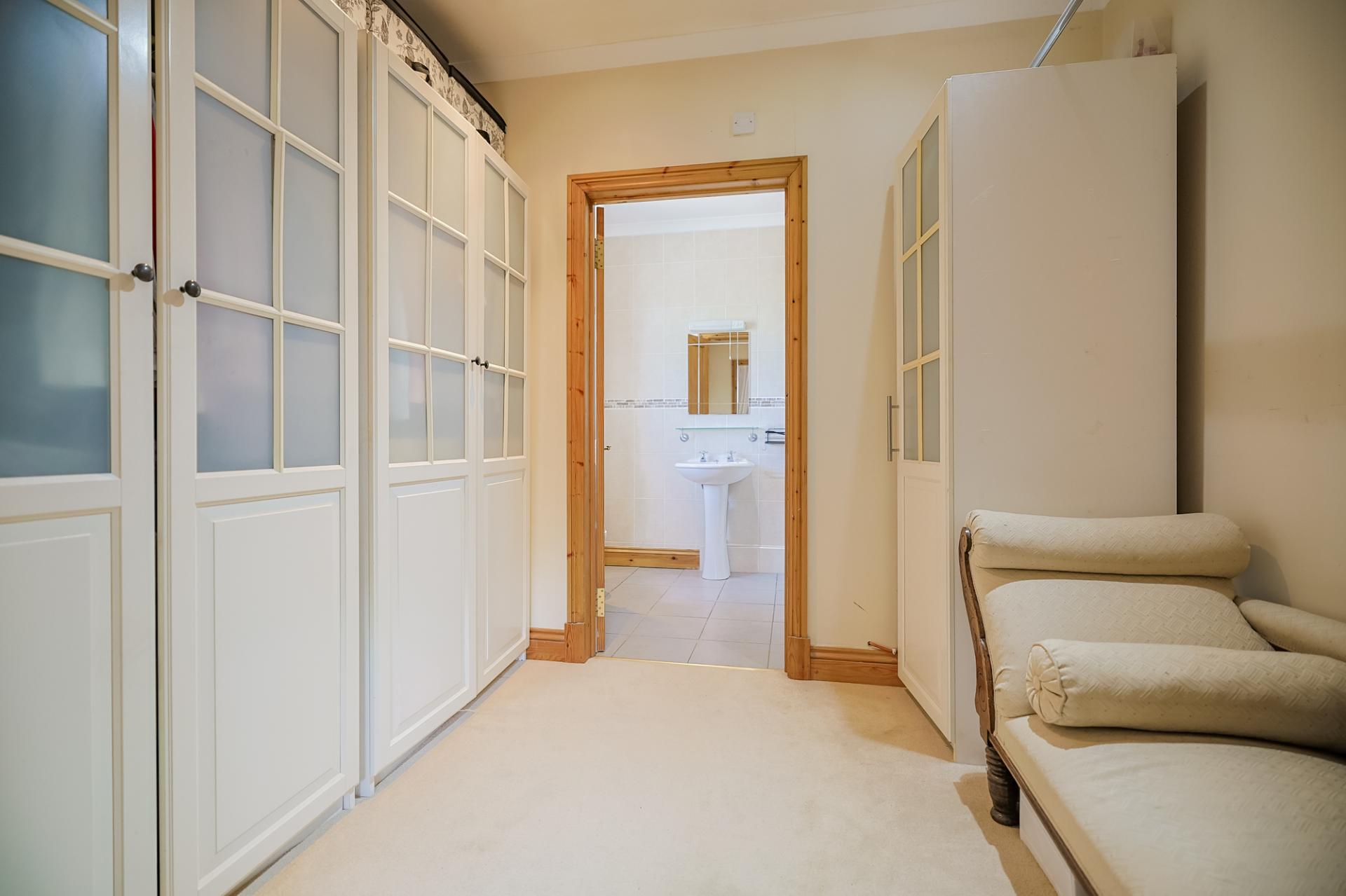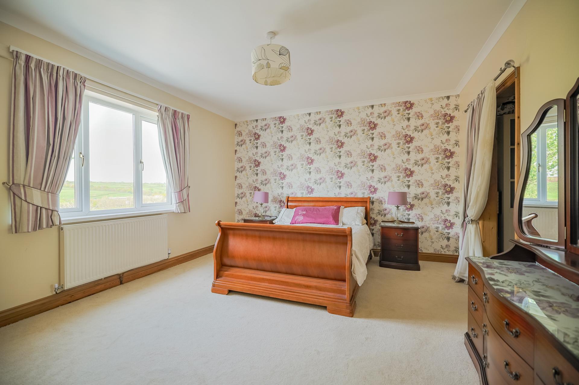 The principal suite is a bright and spacious retreat, featuring a large side window framing panoramic rural views. Carpeted throughout, this room benefits from a separate dressing area with spotlighting and ample space for storage units. The en-suite is well-appointed with a WC, wash basin, large walk-in shower, heated towel rail, extractor fan, shaving light and point, tiled flooring and walls, and a frosted rear-facing window.
