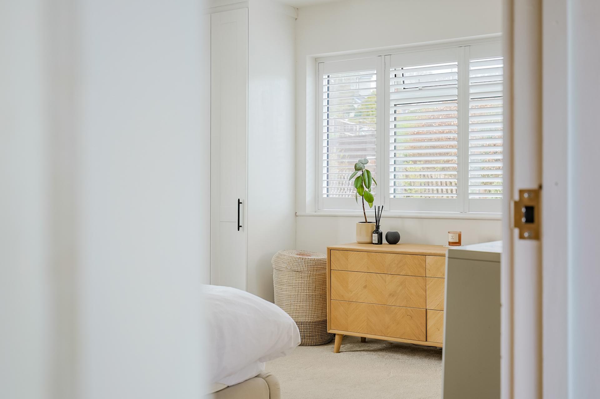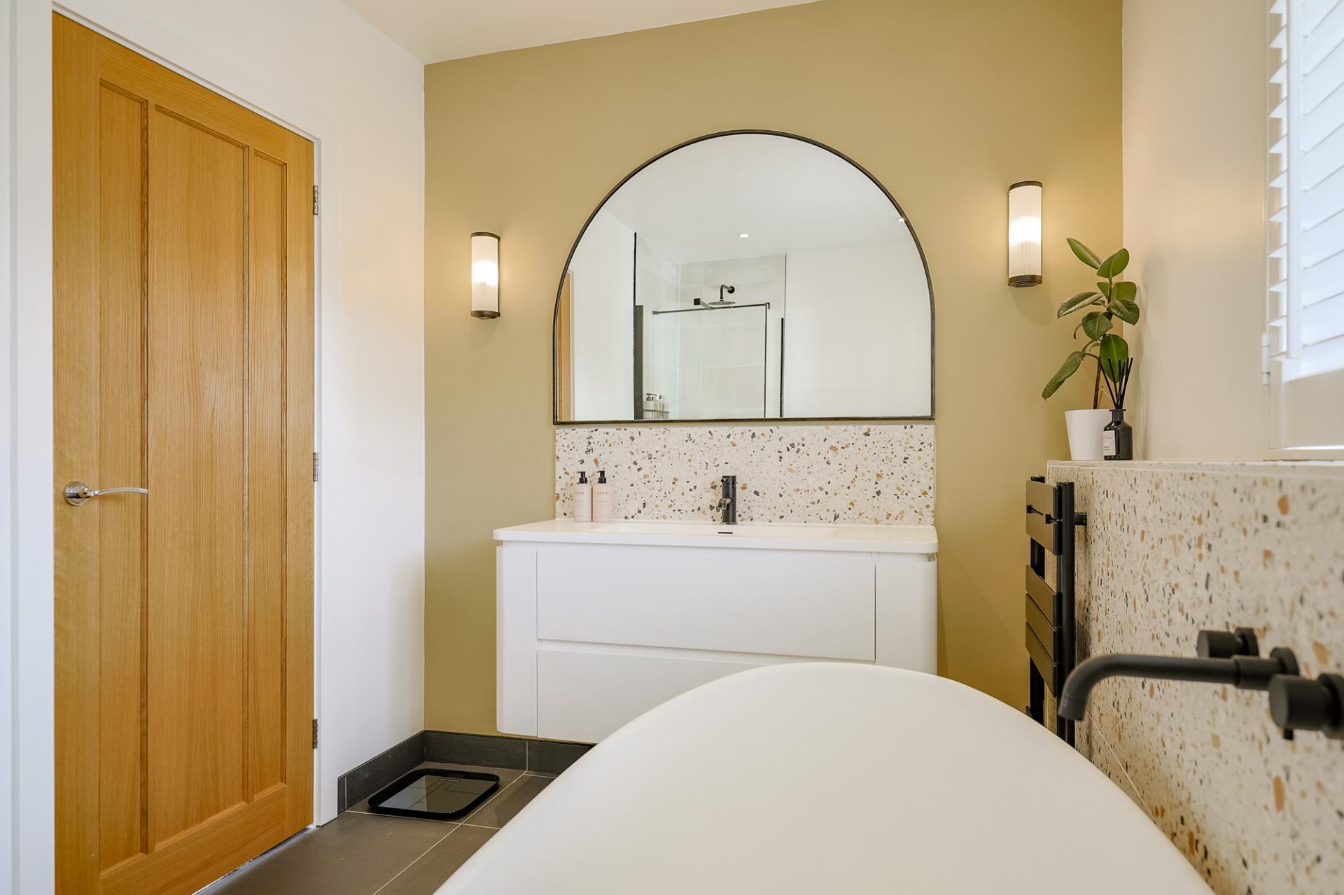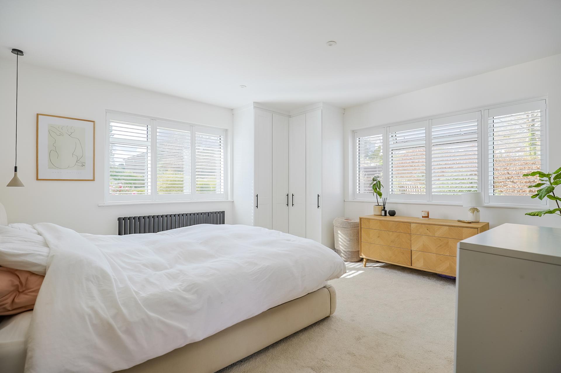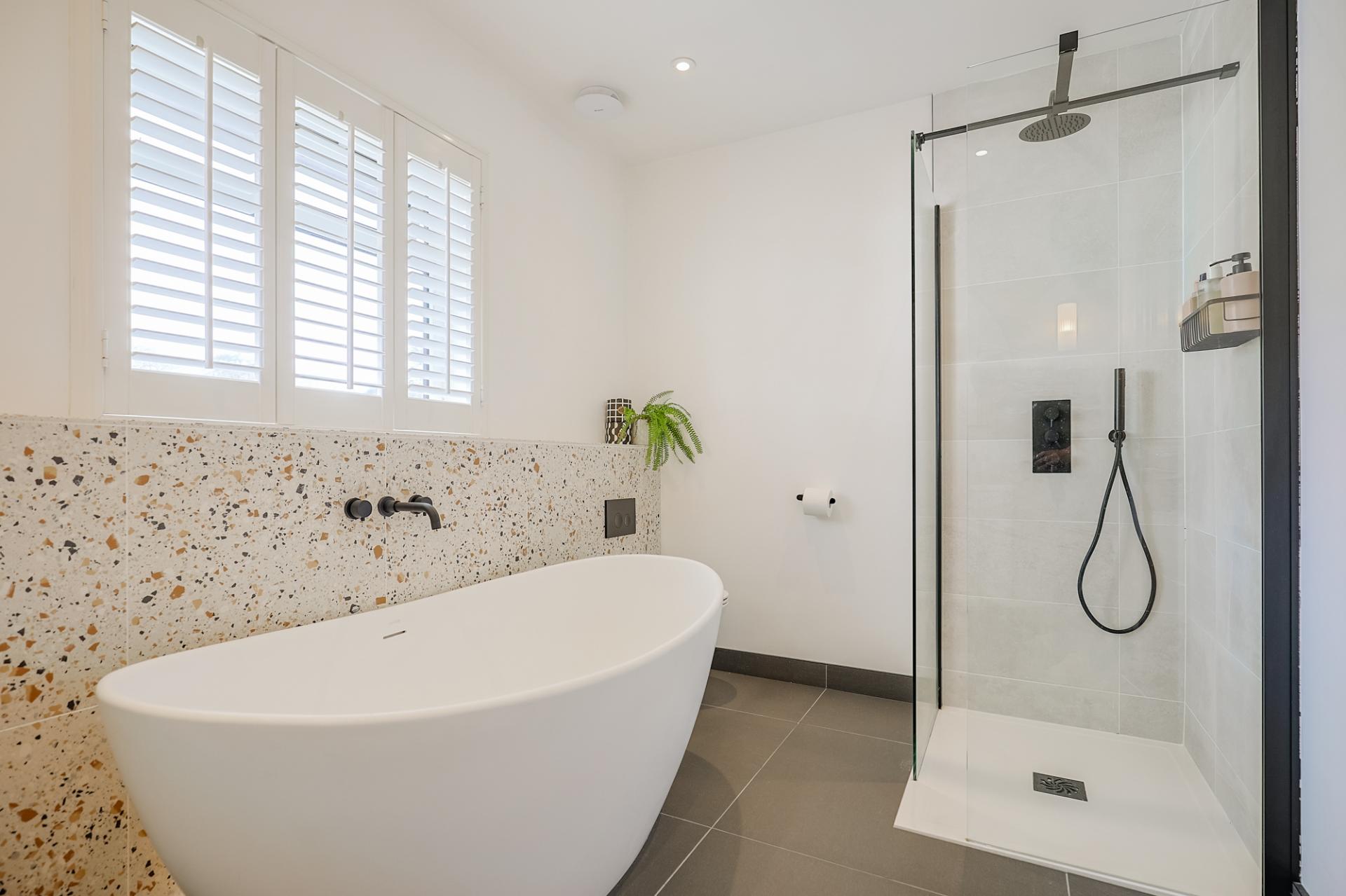 The principal bedroom is another beautifully bright space, thanks to dual-aspect windows with fitted shutters overlooking the garden. This room enjoys spotlighting, a feature radiator, and fitted wardrobes with hanging rails and shelving. The en-suite bathroom is well-appointed with a WC, a wash basin with storage underneath, a LUSSO feature bath, a walk-in shower, a heated towel rail, tiled flooring, part-tiled walls, spotlighting, an extractor fan, and a window to the side with fitted shutters.