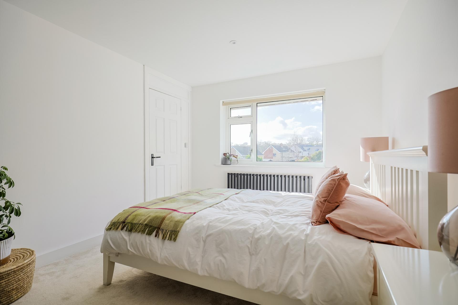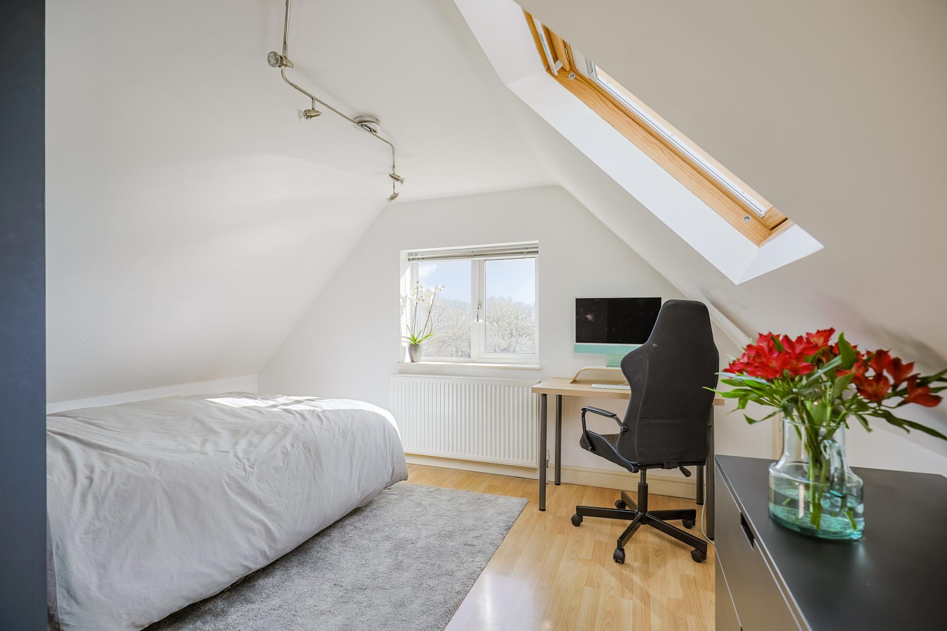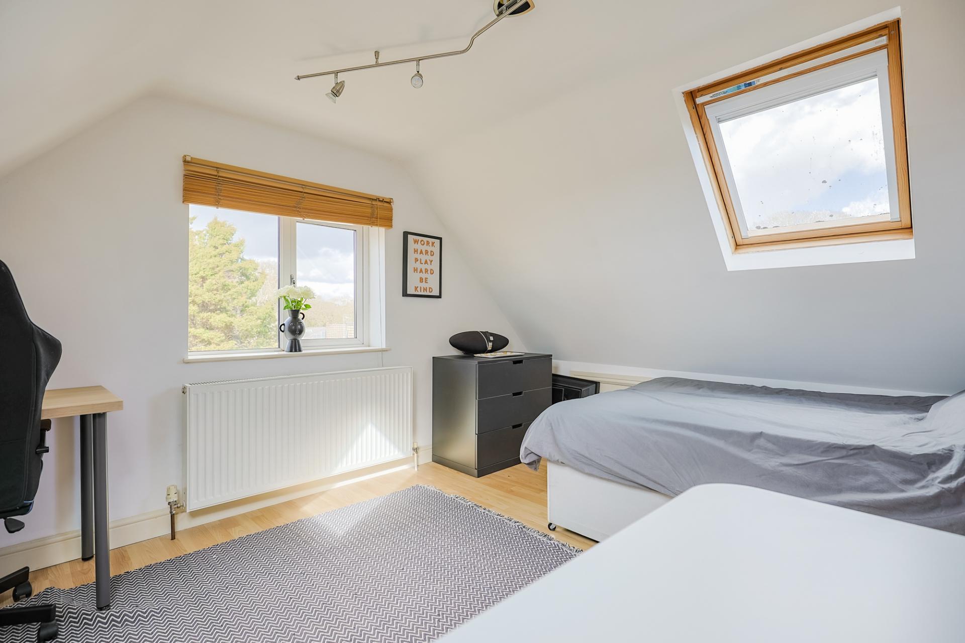 Bedroom five is equally bright, with a rear-facing window and two Velux windows overlooking the garden. It also benefits from a vaulted ceiling, laminate flooring, and eaves storage.