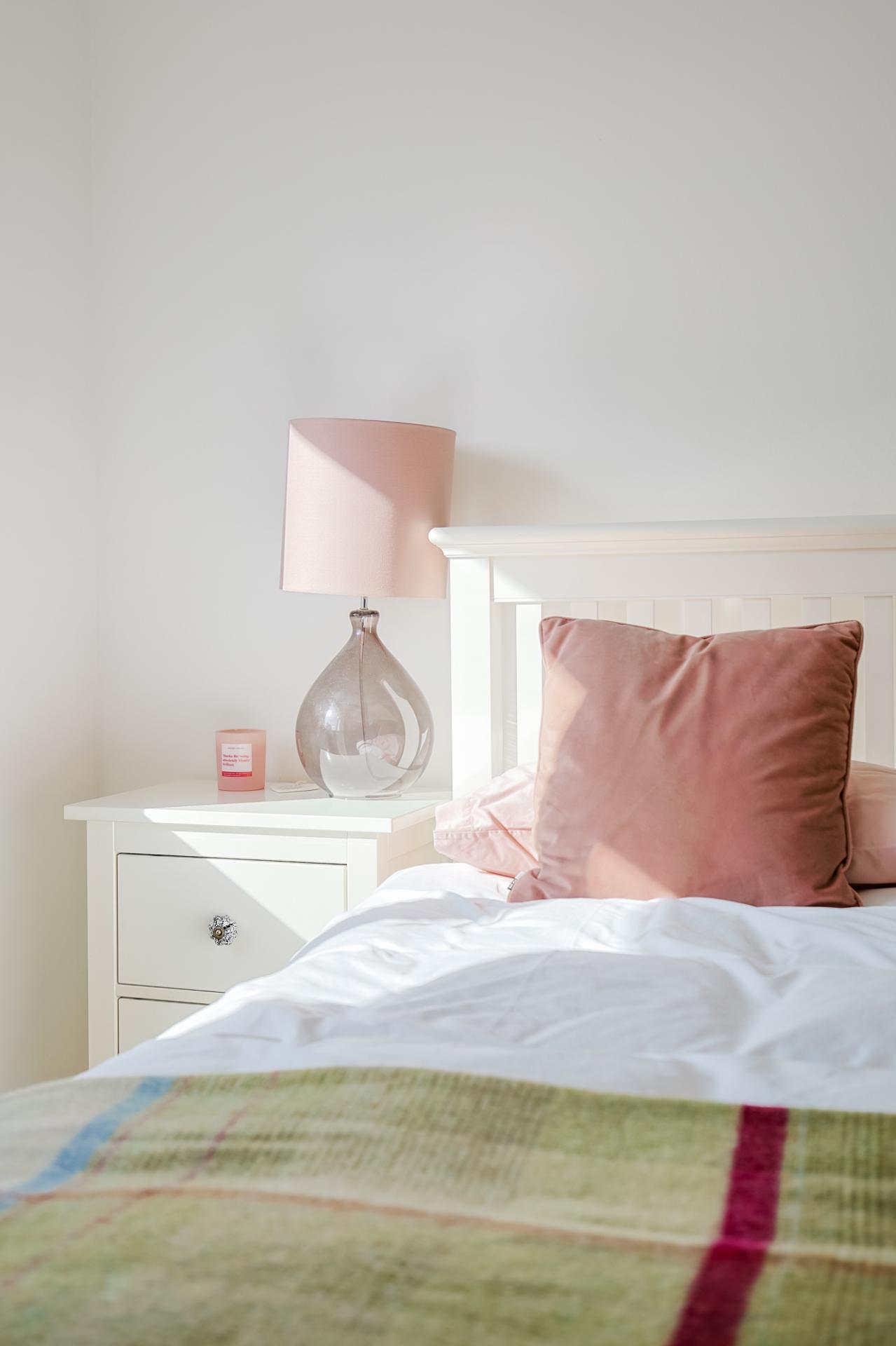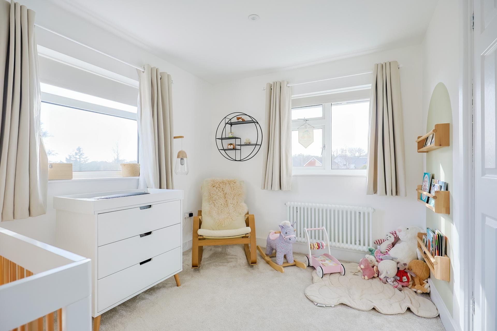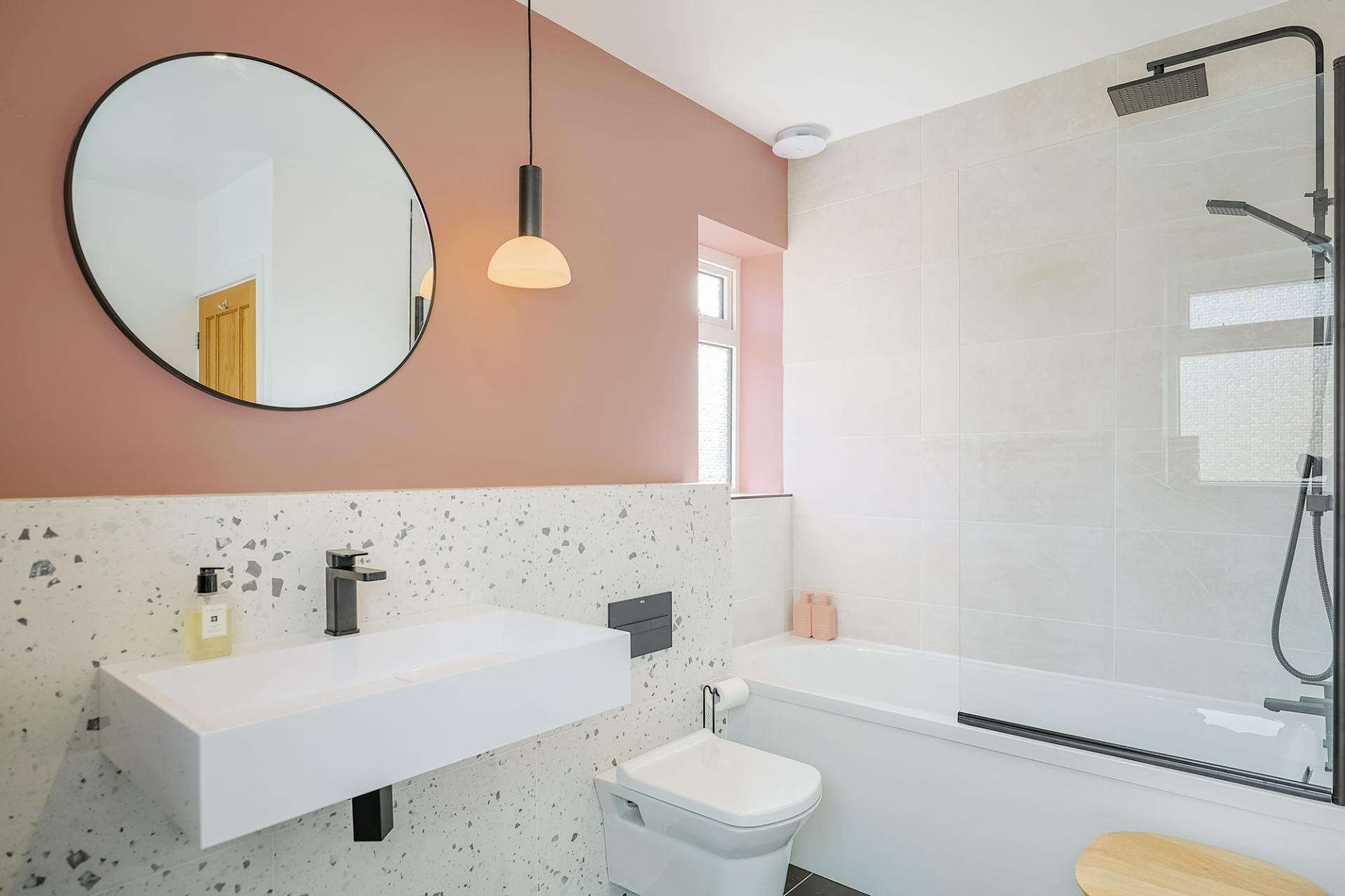 Bedroom five is equally bright, with a rear-facing window and two Velux windows overlooking the garden. It also benefits from a vaulted ceiling, laminate flooring, and eaves storage.